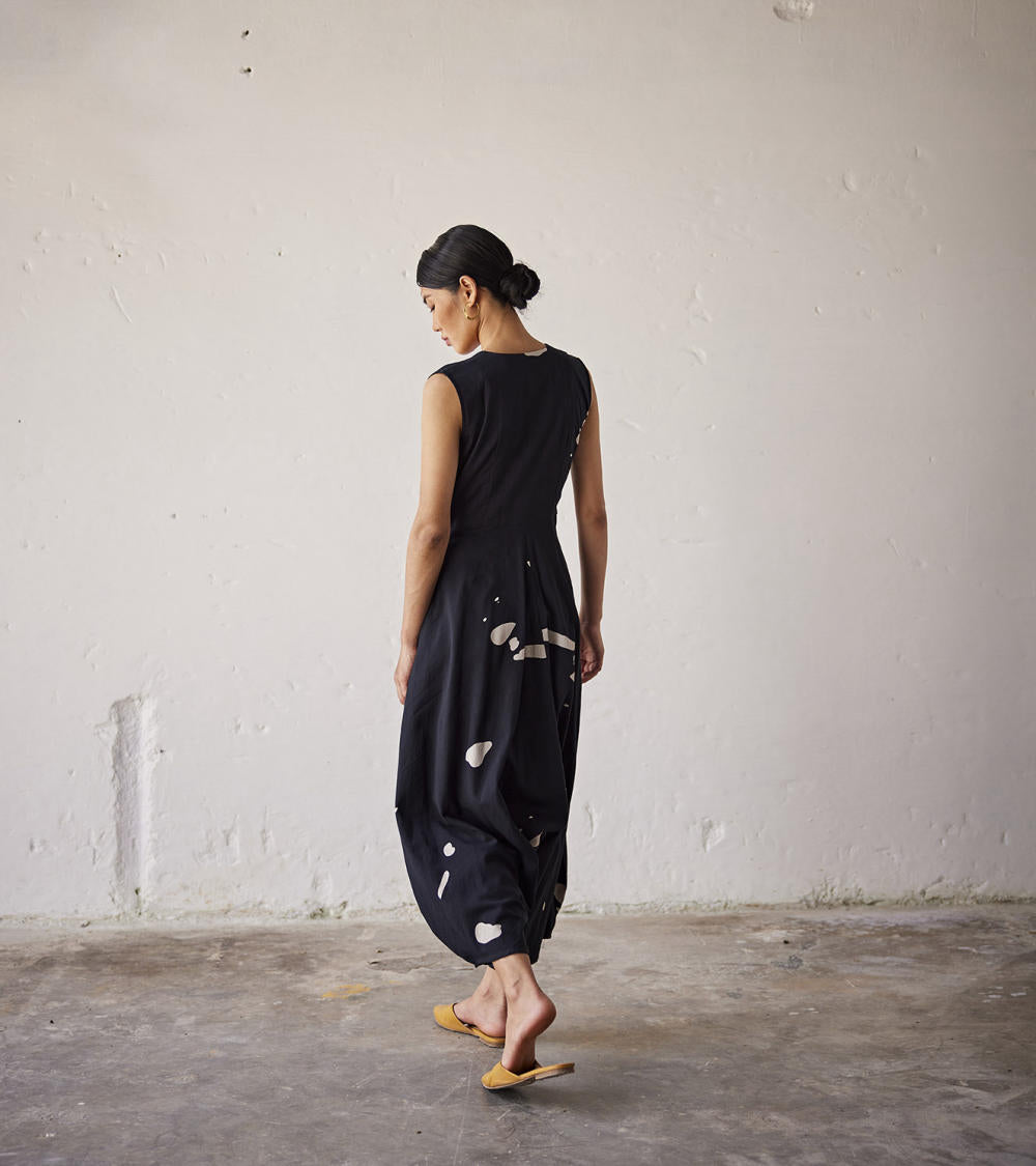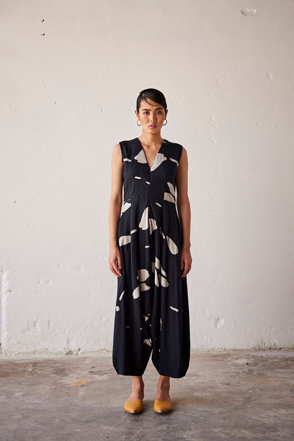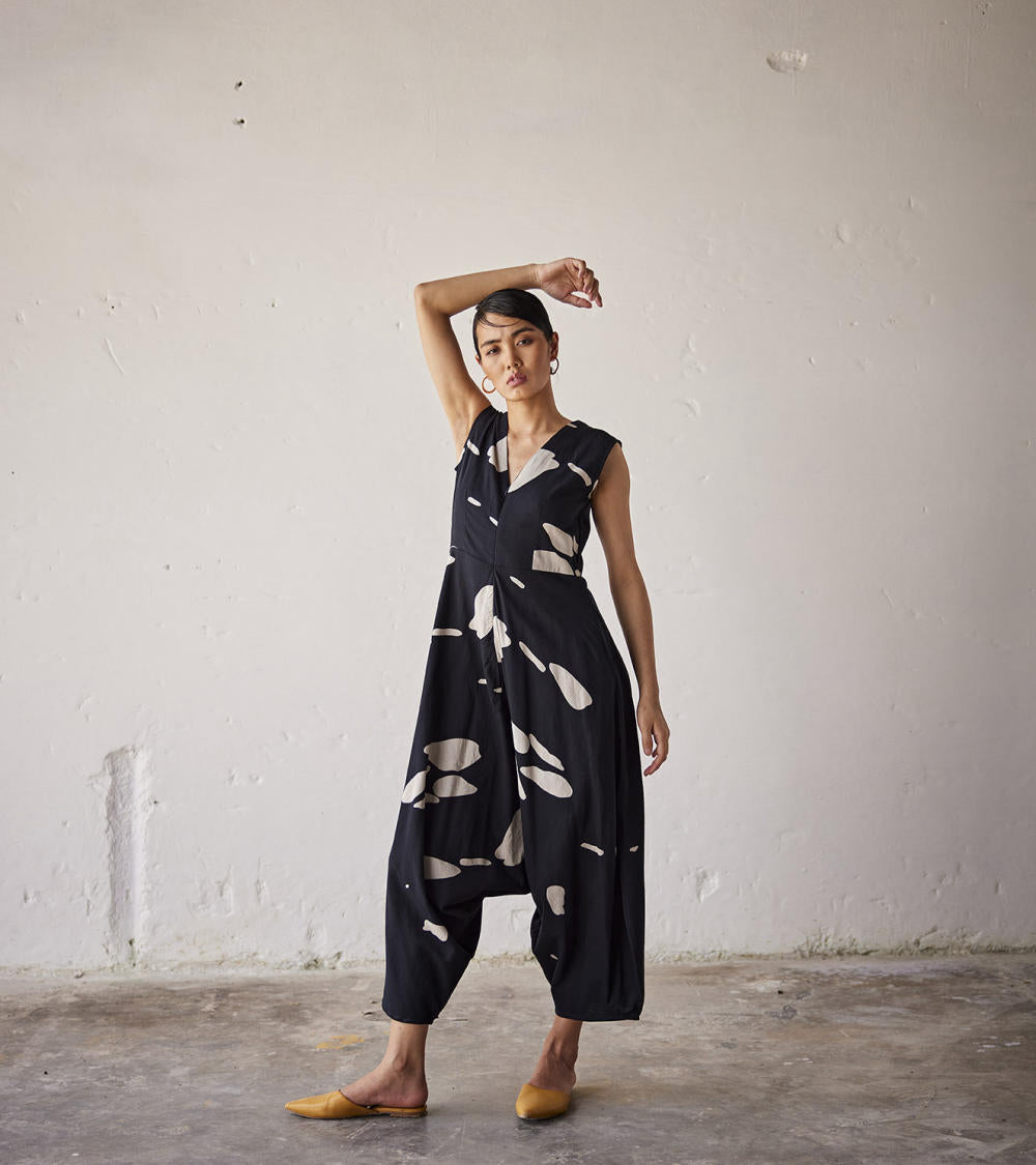 A black terracota print mul jumpsuit with a concealed zipper opening and a V neckline.