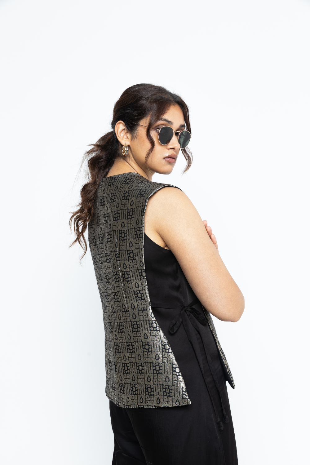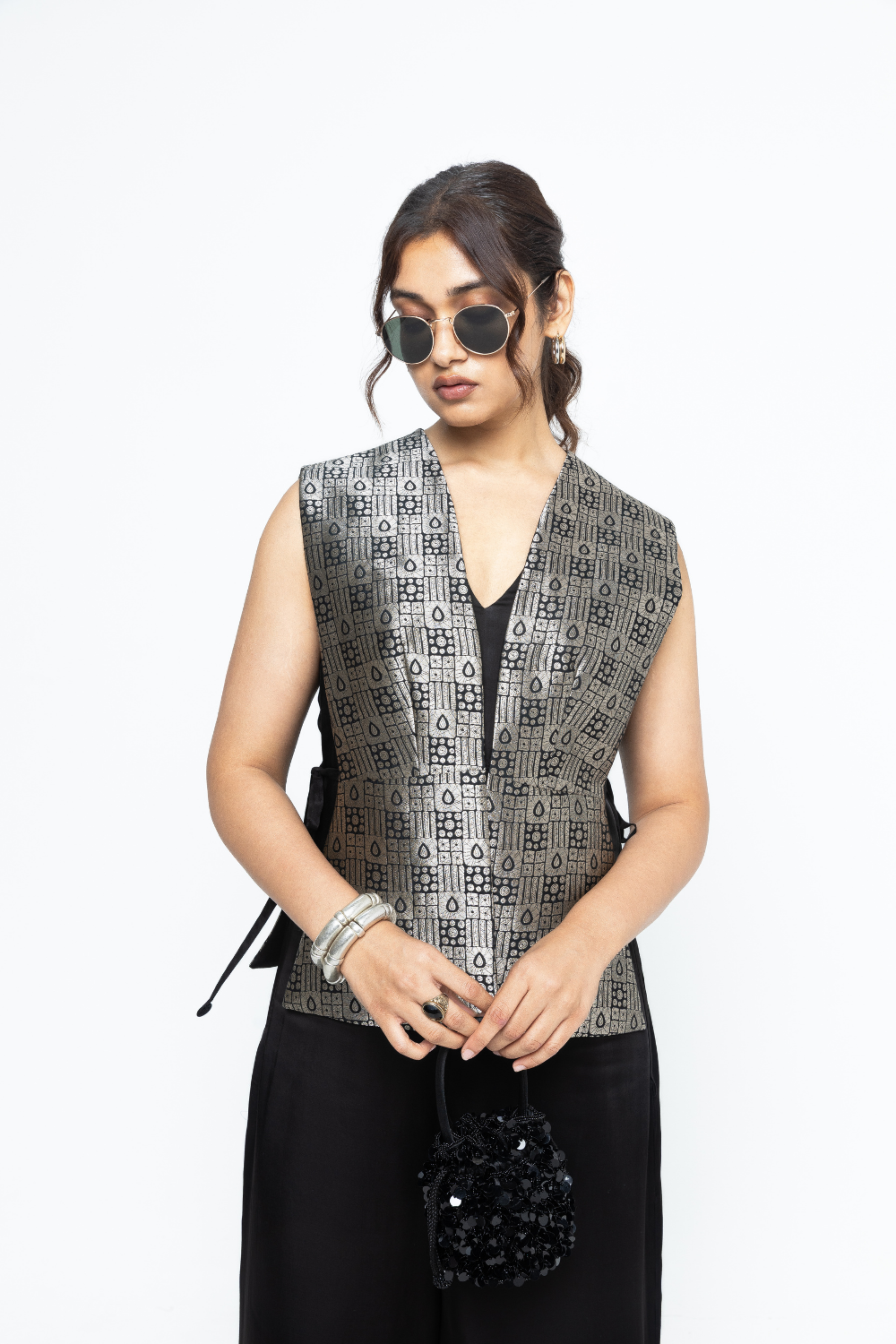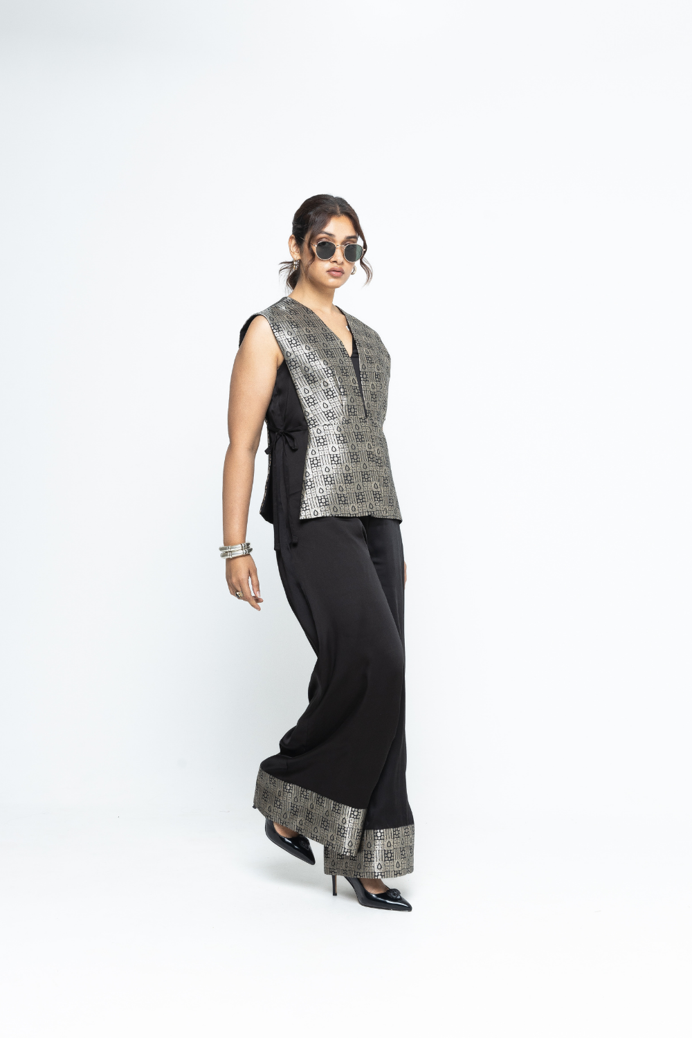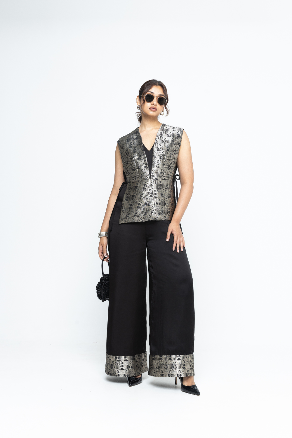 Black Gilet with tie details on the side paired with a matching jumpsuit with brocade details at the hem.