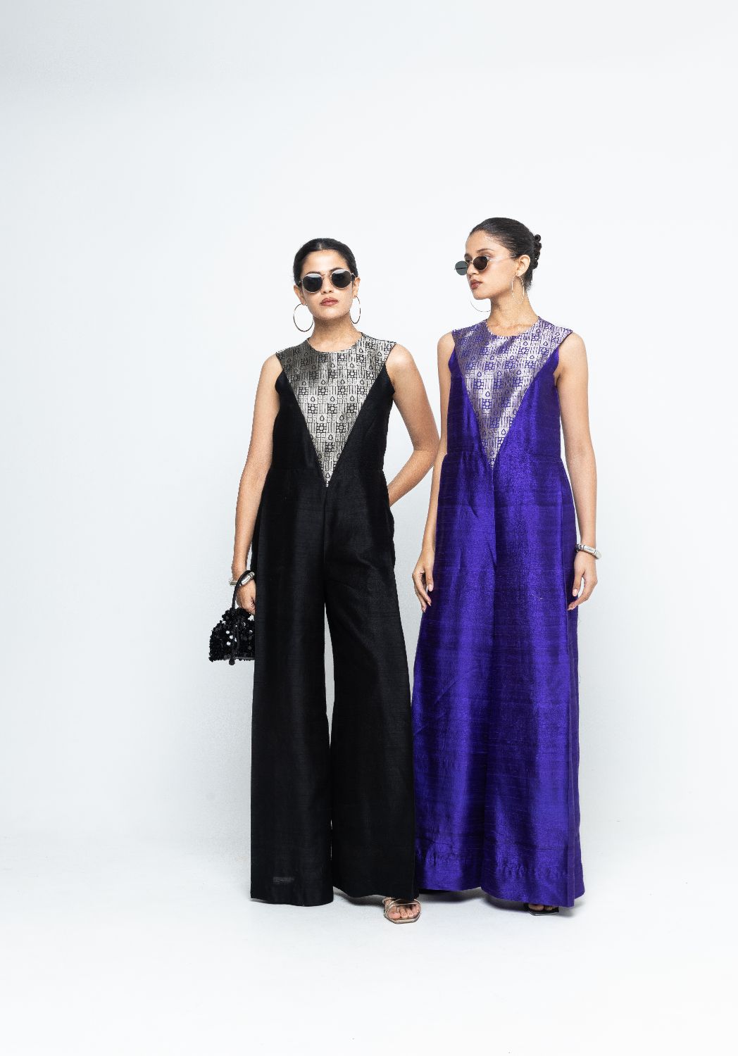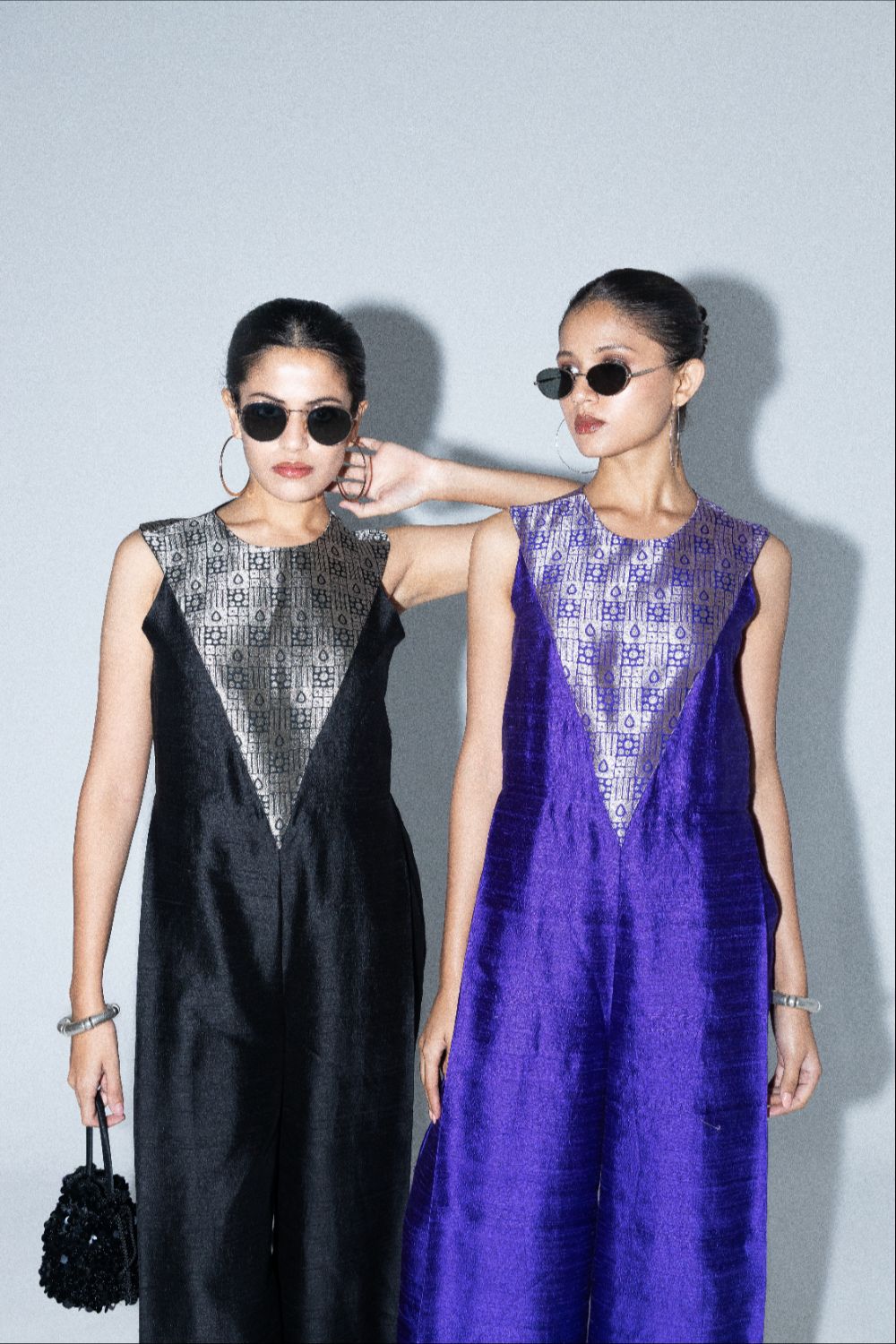 Founded by sisters Sonu and Ritu, the label brings a sharp clarity to occasion wear through clean lines, confident proportions, and a fearless use of colour. Jewel-toned purples, inky blacks, vermilion reds, electric pinks — each palette feels deliberate, designed to hold its own whether under soft daylight or the glare of evening lights.