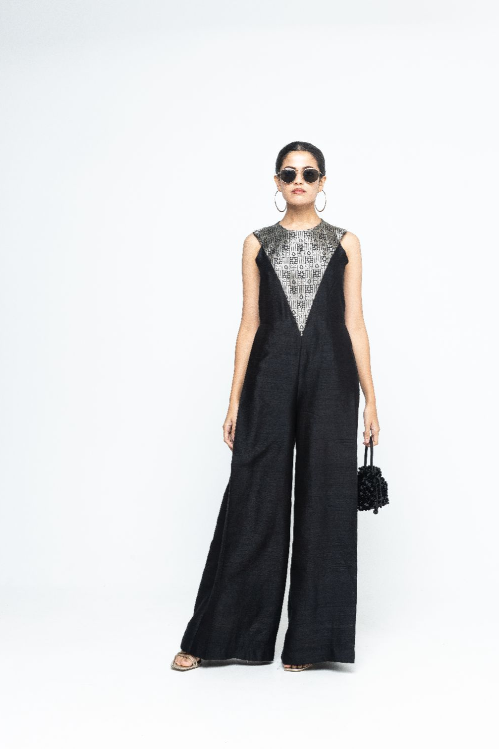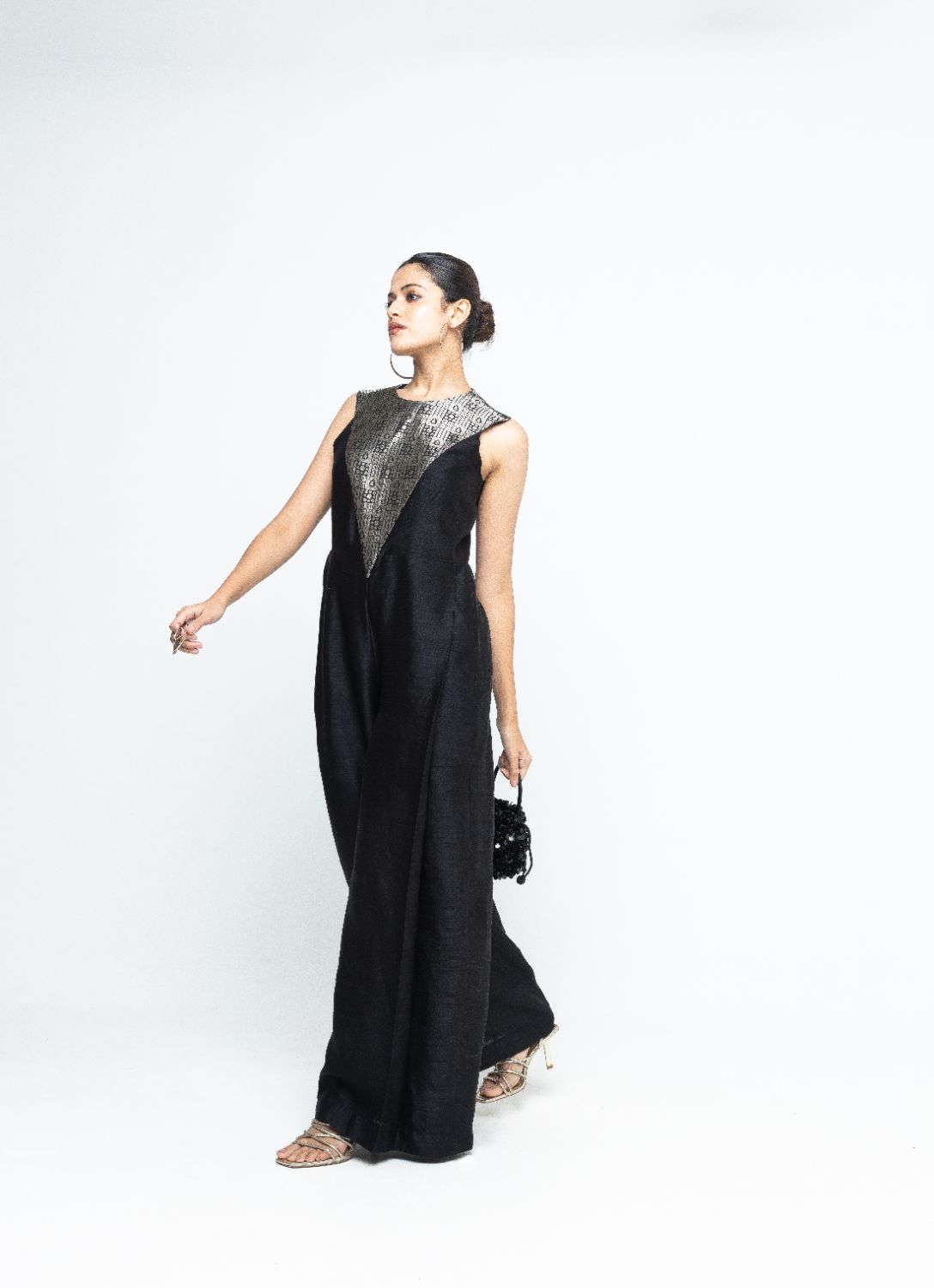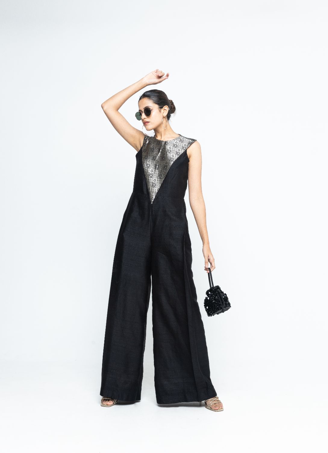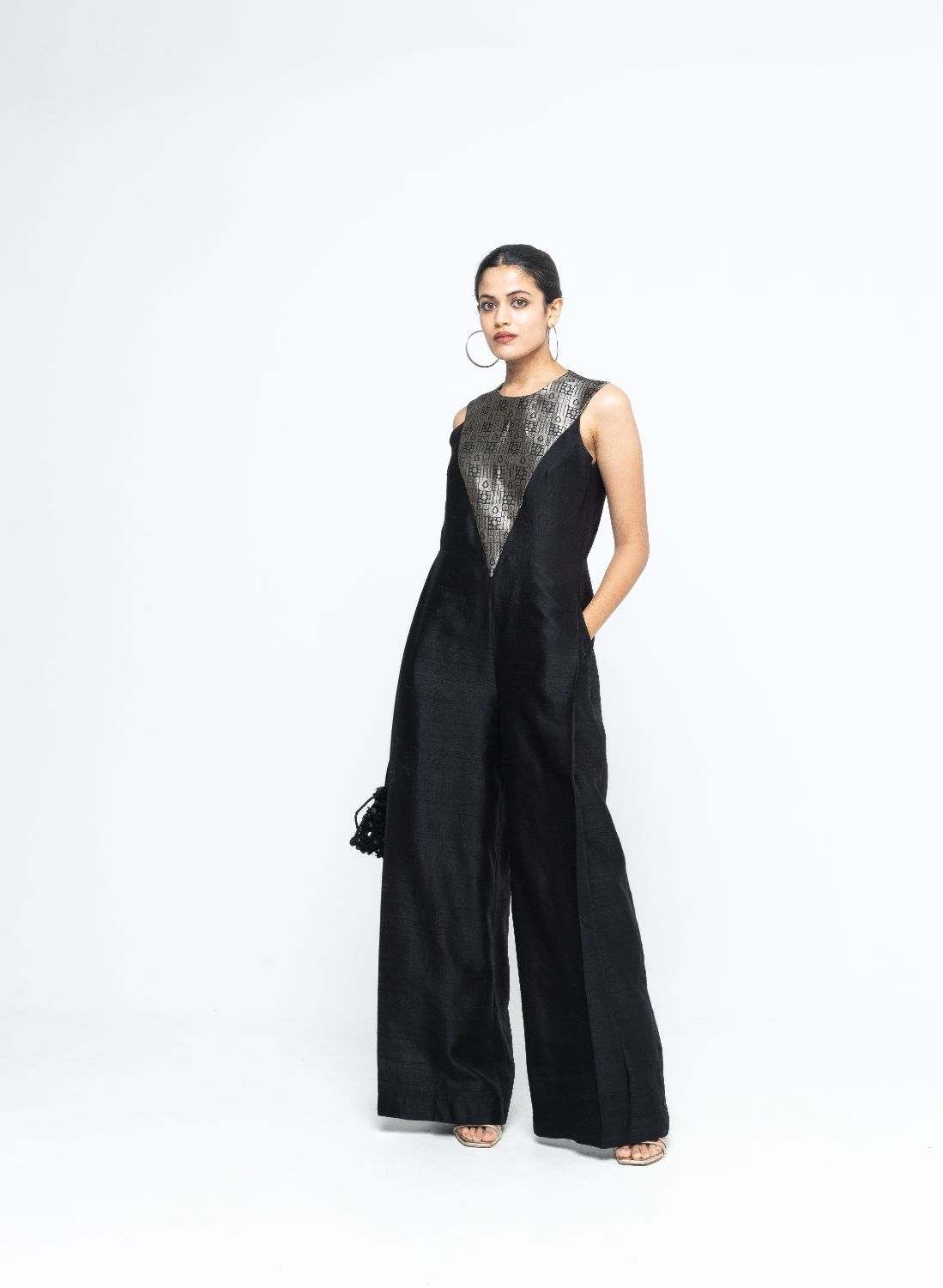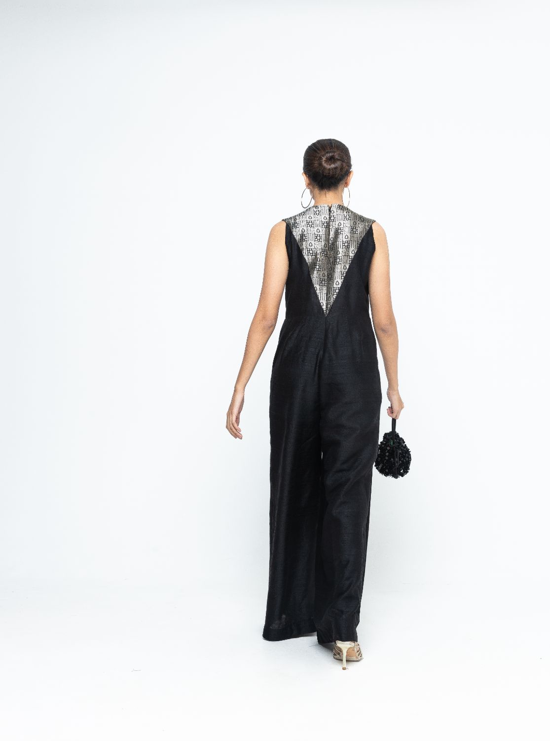 Black statement Raw Silkl Jumpsuit with Brocade detail at the neck and back.