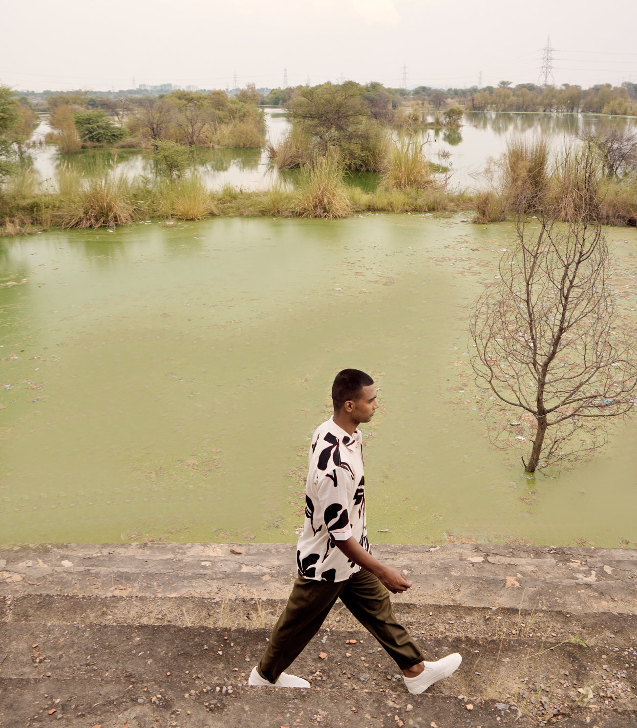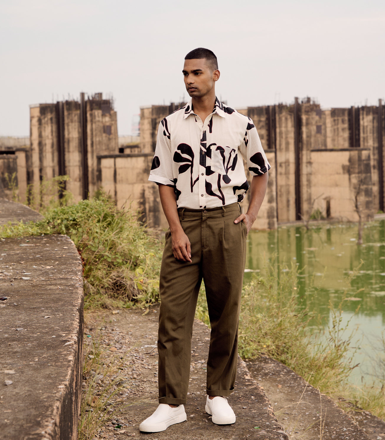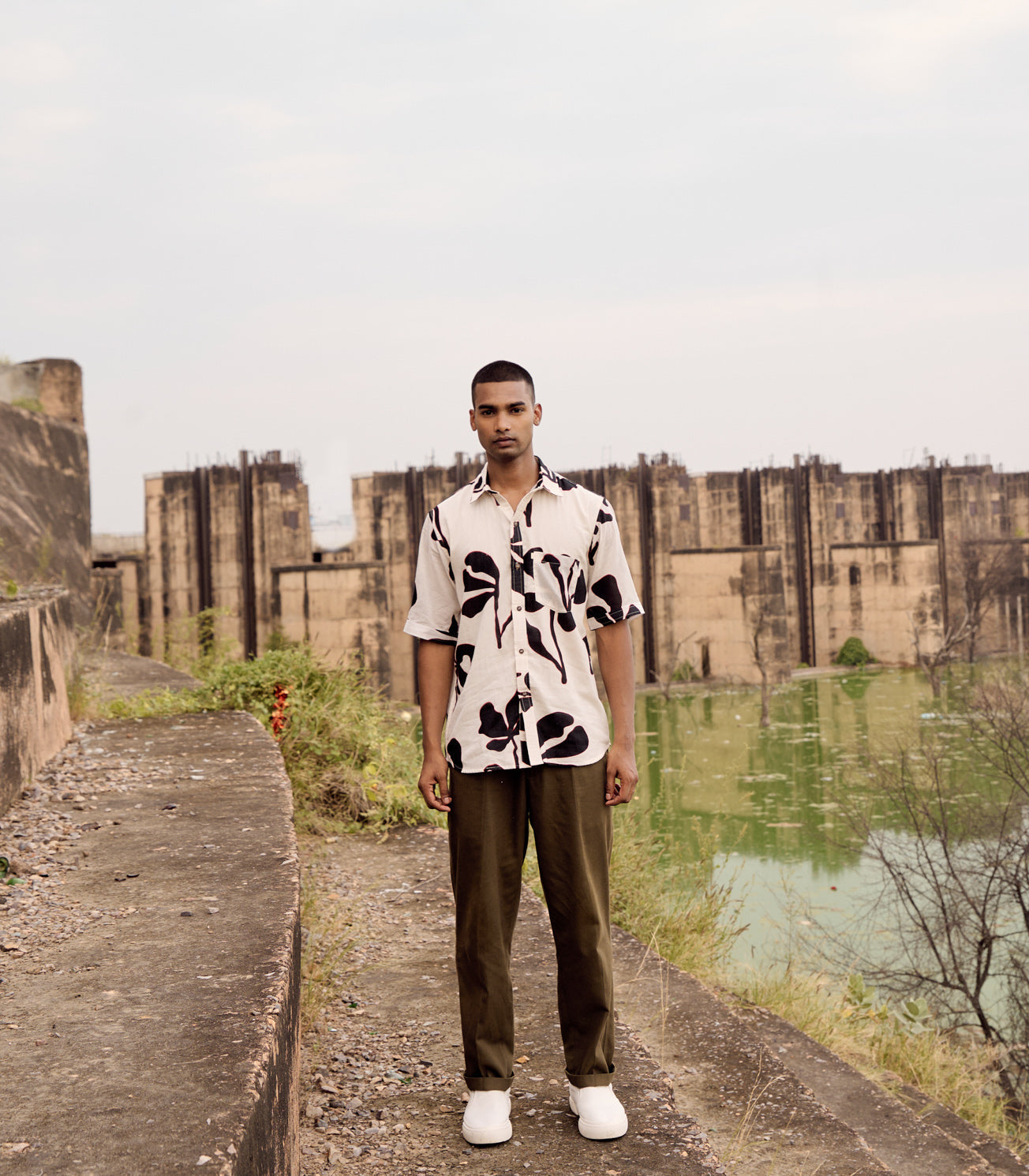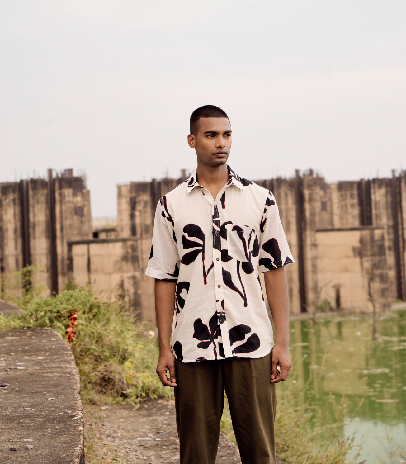 An off white lino print mul shirt with half sleeves, spread collar and a patch pocket up front.