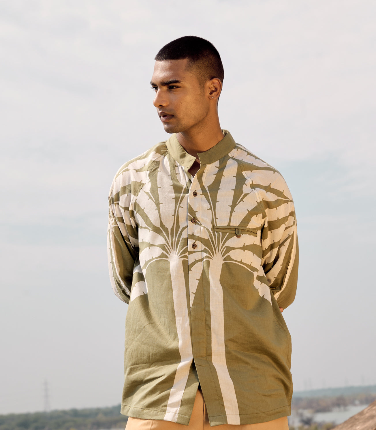 A dull green mul shirt with mandarin collar, raglan sleeve, button cuff opening and front welt pocket.