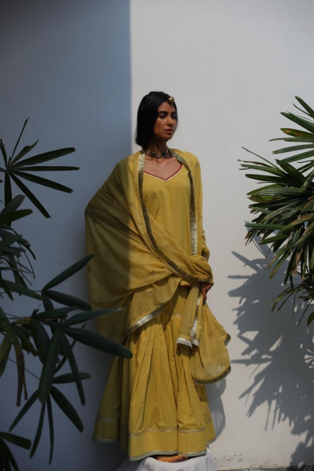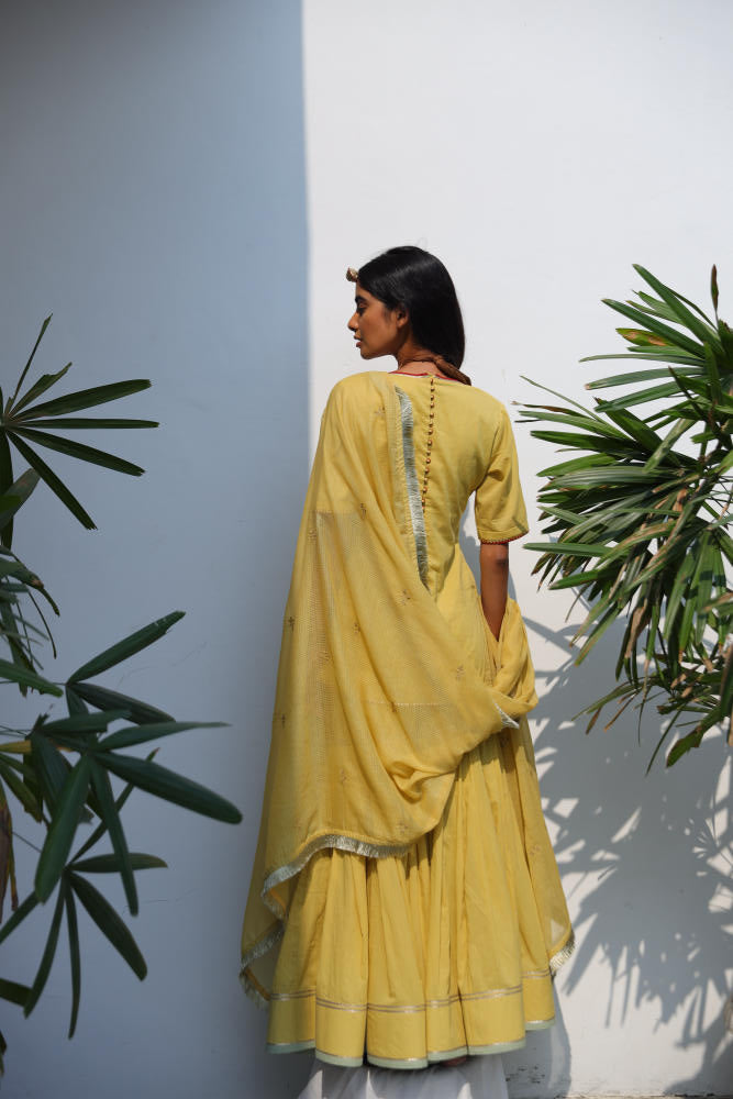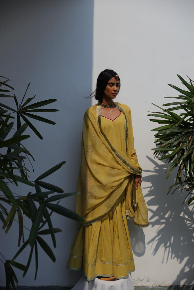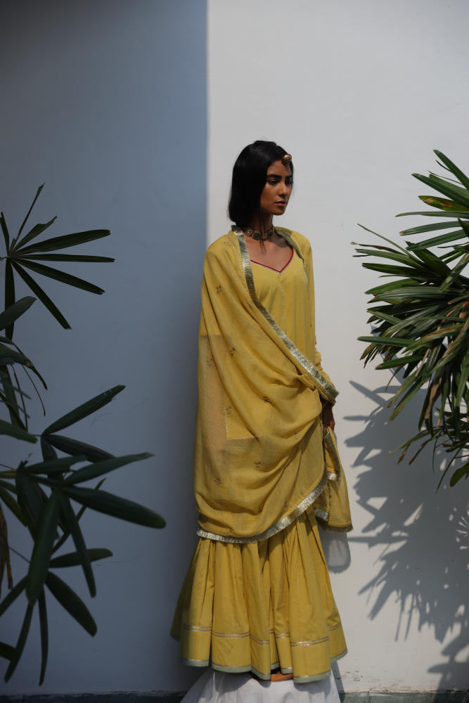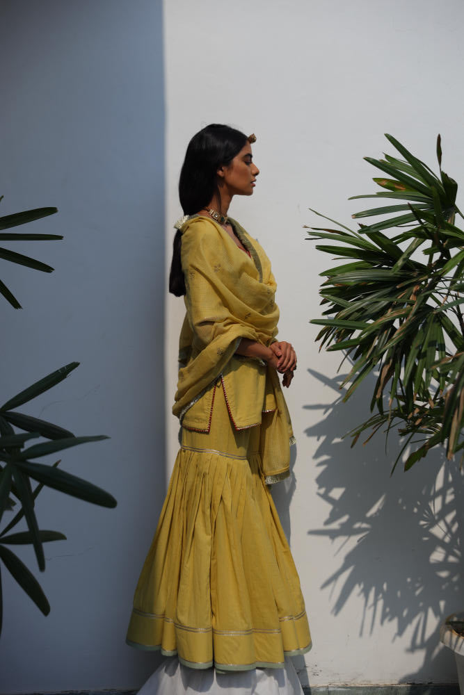 Zesty corn yellow sharara set in cotton mulmul with delicate gota and lace work. The flared sharara features beautiful contrast hem detailing and comes with a matching dupatta
