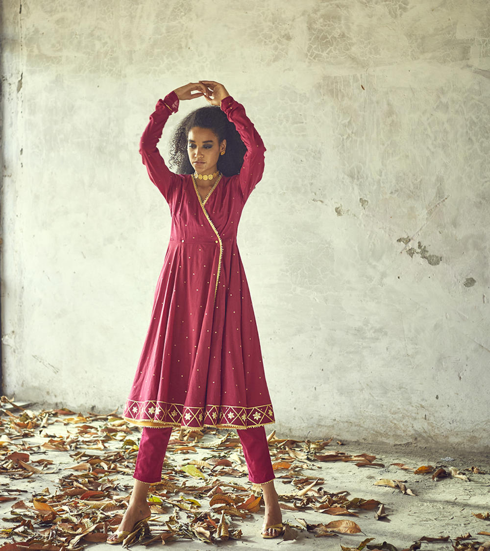 Our angoori kurta set, decorated with golden foil print all over and lace and gota work on the hems speaks for those starry nights of seclusion and peace. A fitted wrap torso with button fastening at the waist and ghera skirt add to the fun and festive mood of this outfit. Clubbed with a pair of narrow fit pants.