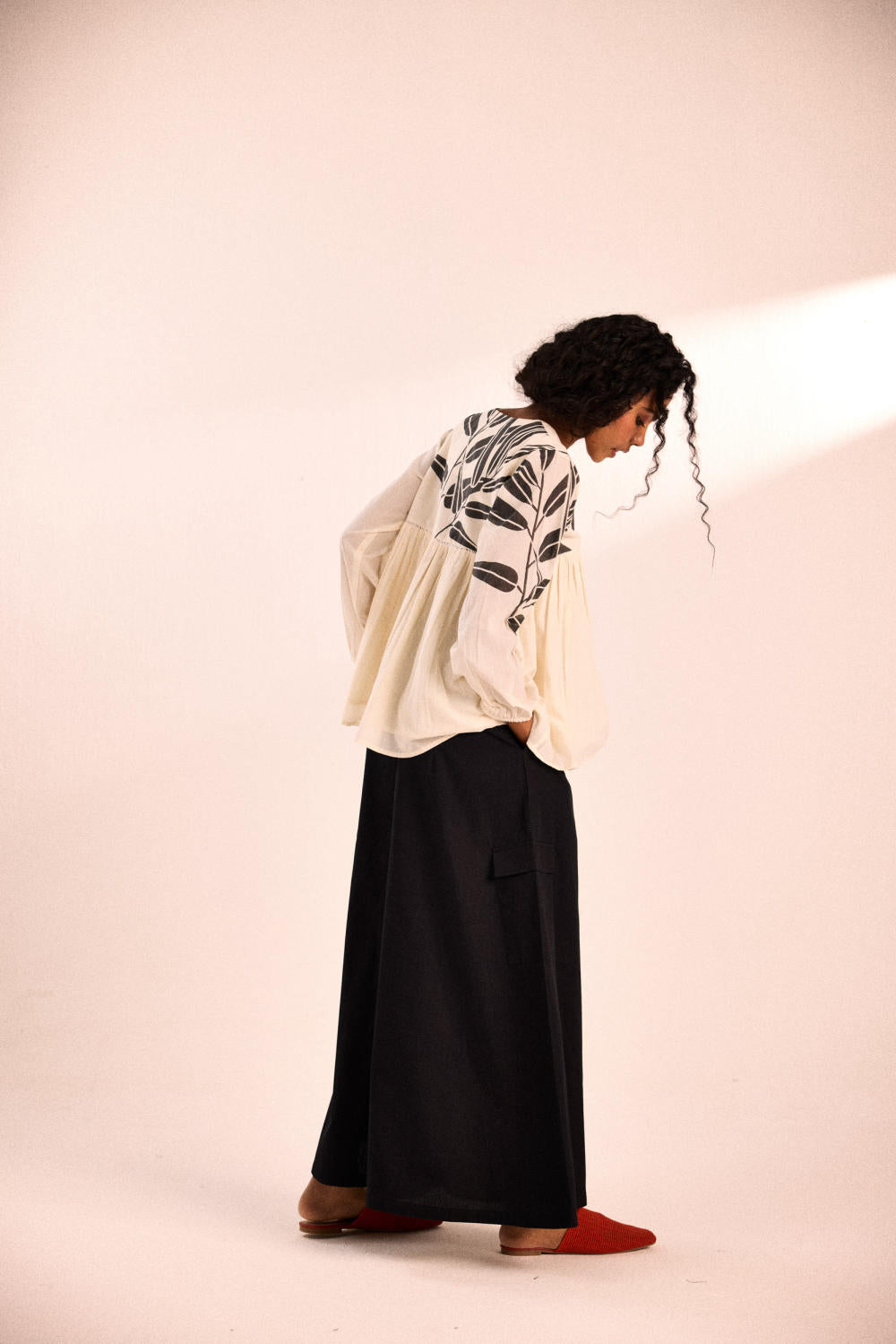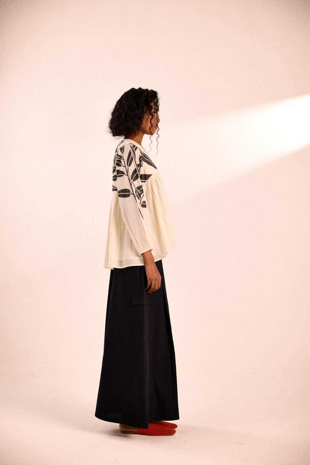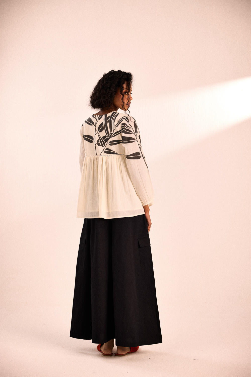 A white, flowy top with soft gathers and delicate ladder lace detailing. The abstract print above the bust and full sleeves make it perfect for both casual and statement looks.