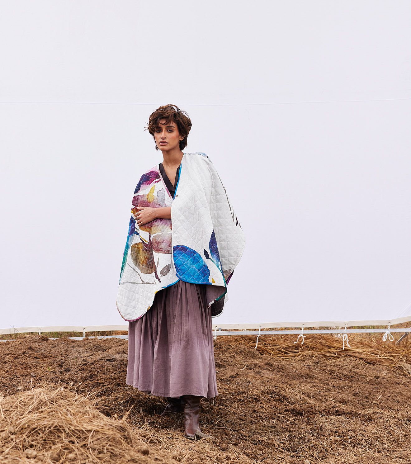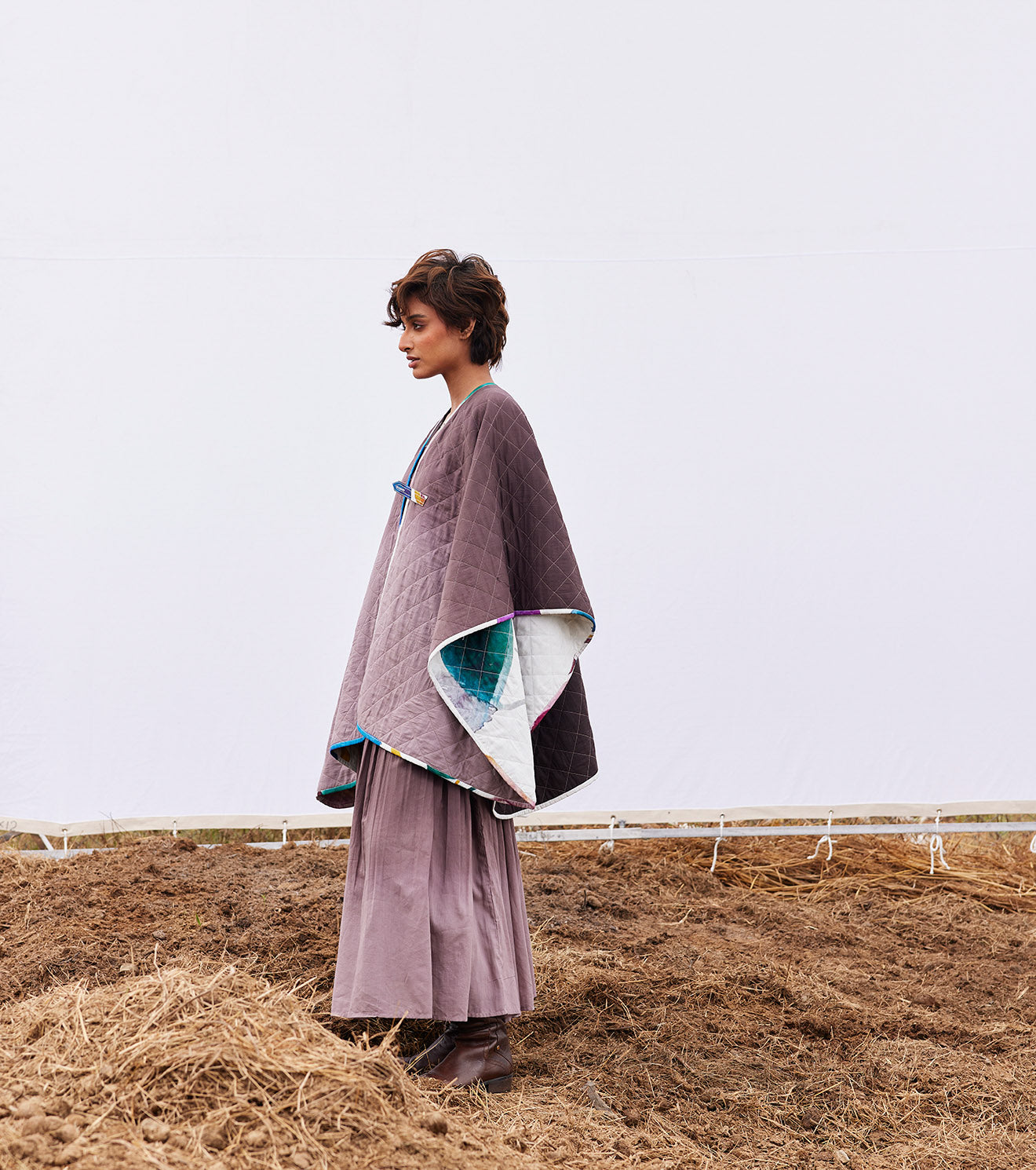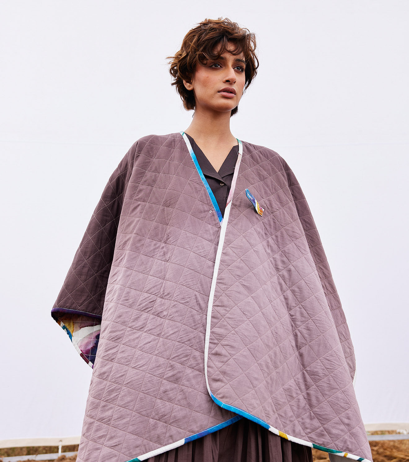 An off-white floral print reversible mul quilted cape with a front button opening on one side and a plum ombre tie and dye on the other side.