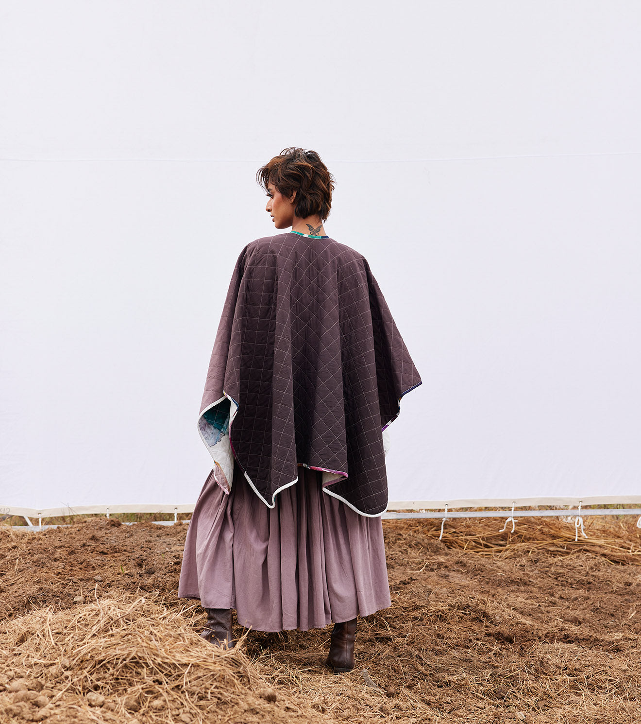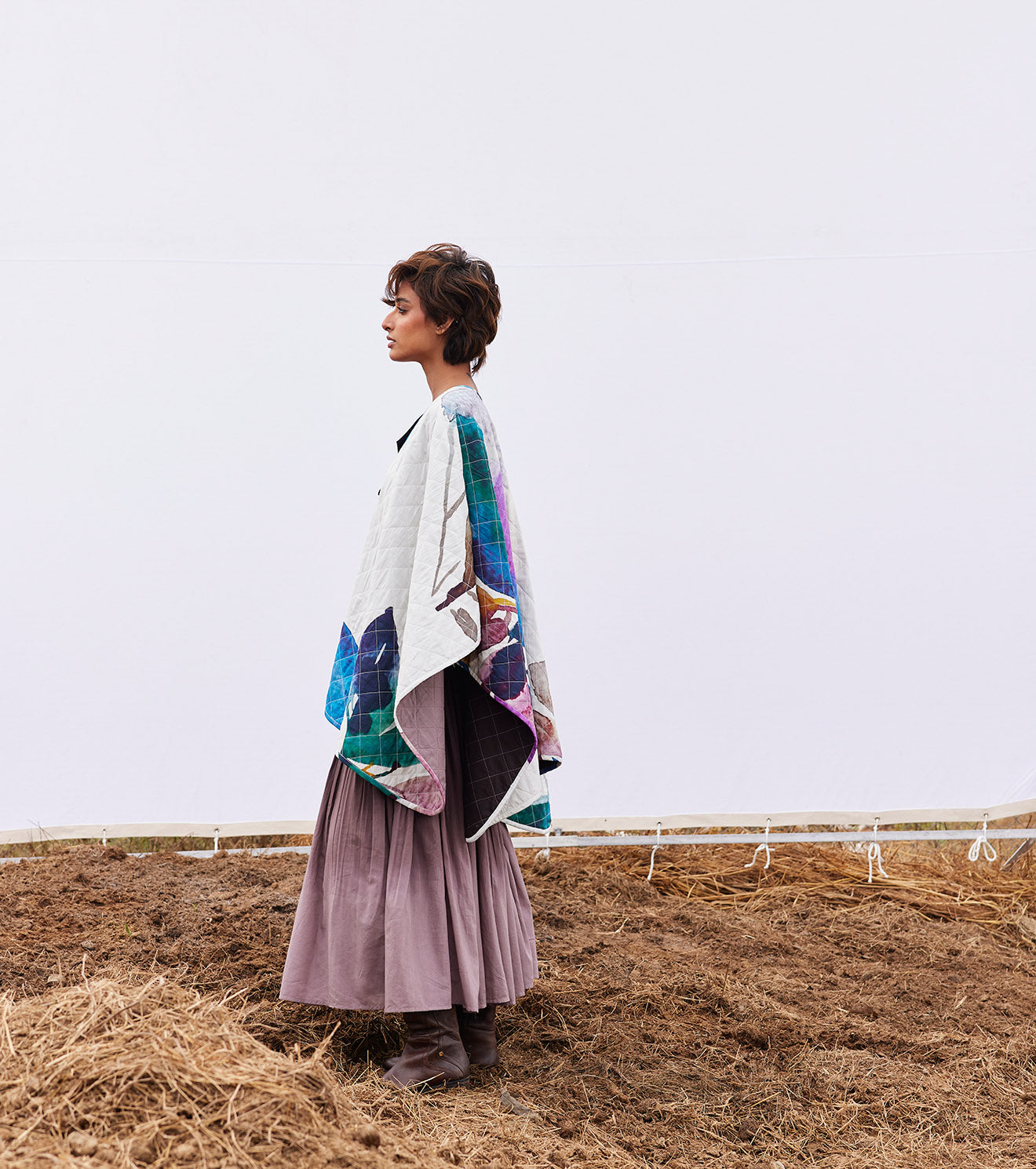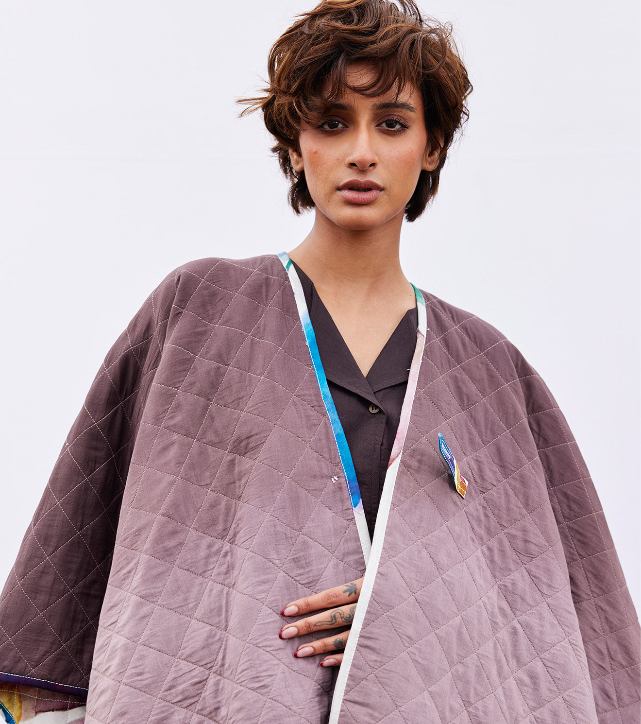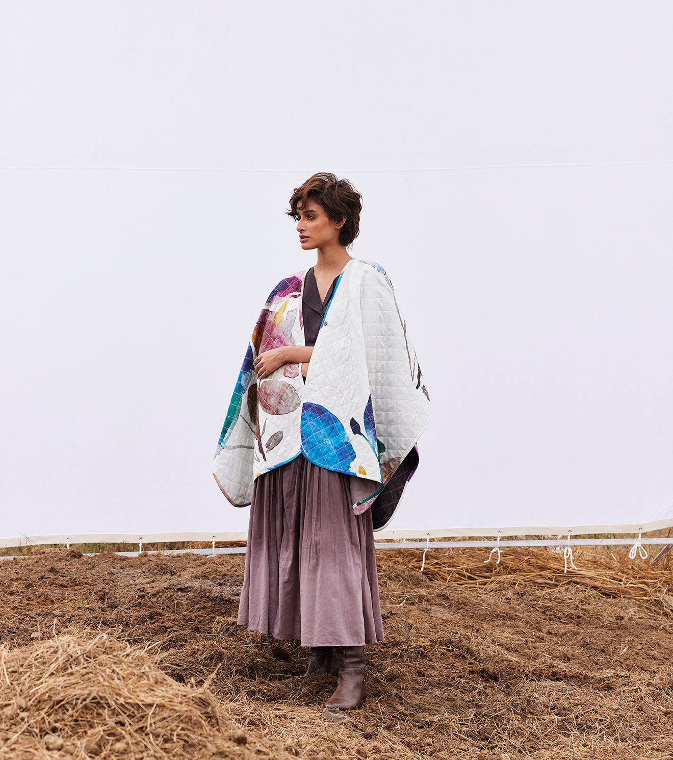 An off-white floral print reversible mul quilted cape with a front button opening on one side and a plum ombre tie and dye on the other side.