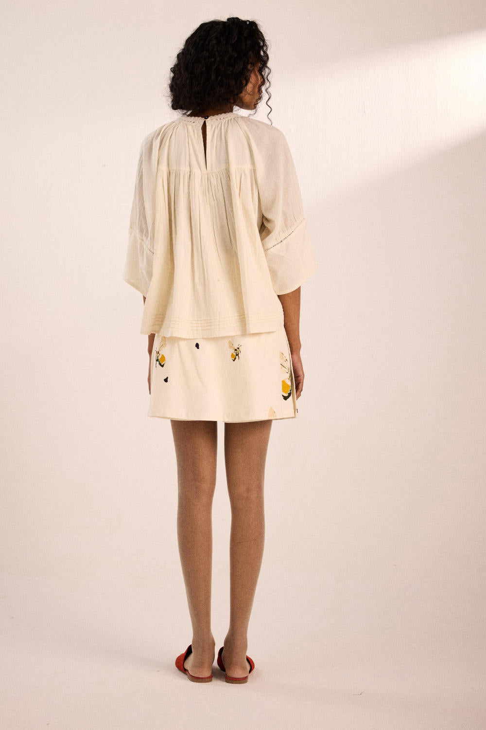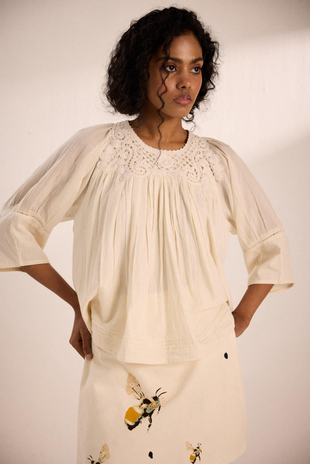 An airy off-white top in cotton mul with delicate lace detailing at the neckline and cuffs. Soft gathers at the front and back yoke add movement, with a keyhole closure at the back .