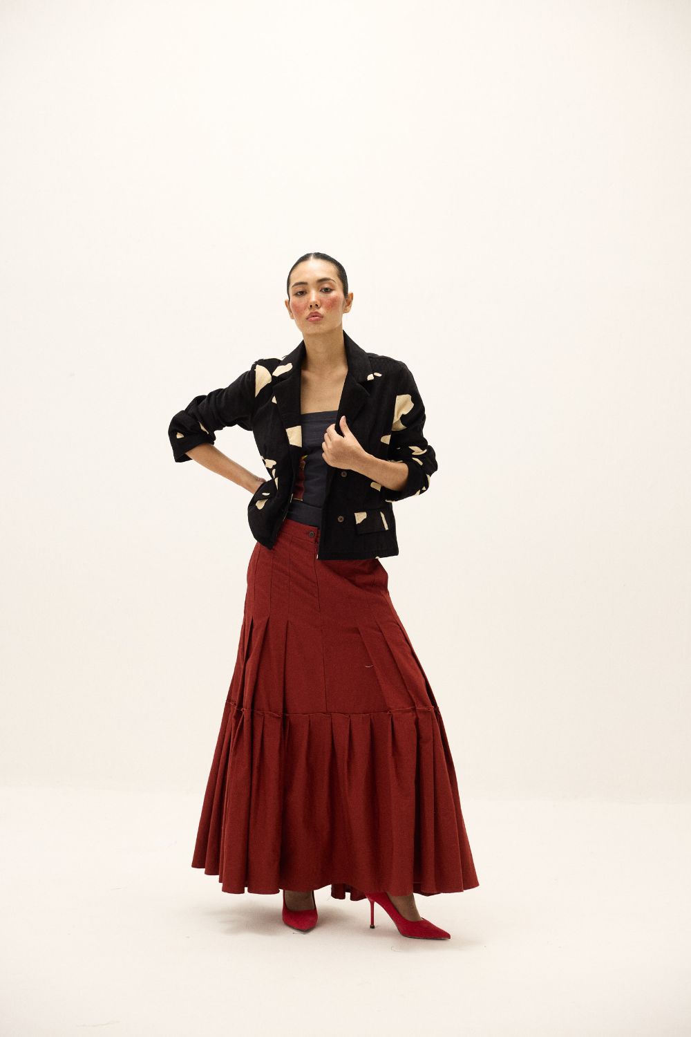 A structured corduroy blazer reimagined with an artisanal touch. Featuring an abstract ivory print on a deep black base, this double-breasted jacket is tailored with sharp lapels, flap pockets, and a slightly cropped length for a contemporary edge.