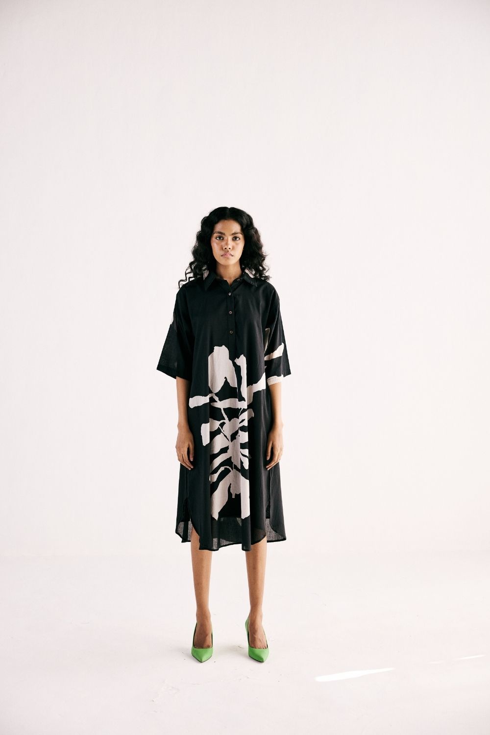 Adorn the grace of breezy meadows in our Cleo flora shirt dress, featuring our signature print crafted in cotton mul. featuring front button opening for effortless wear. printed shirt dress.