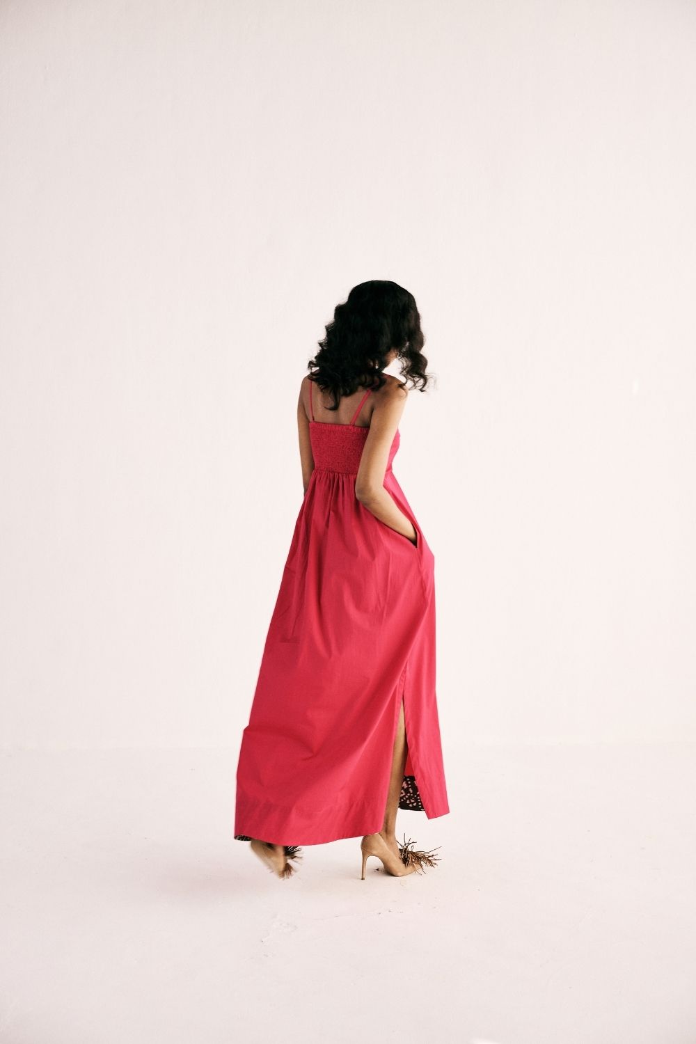An elegant off shoulder hot pink gown crafted in breathable poplin, with fitted bust and elasticated back featuring double side slits and a peekaboo ikat contrast lining. comes with detachable straps. Off shoulder.