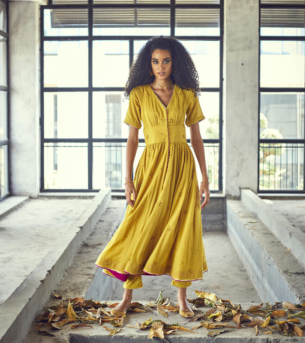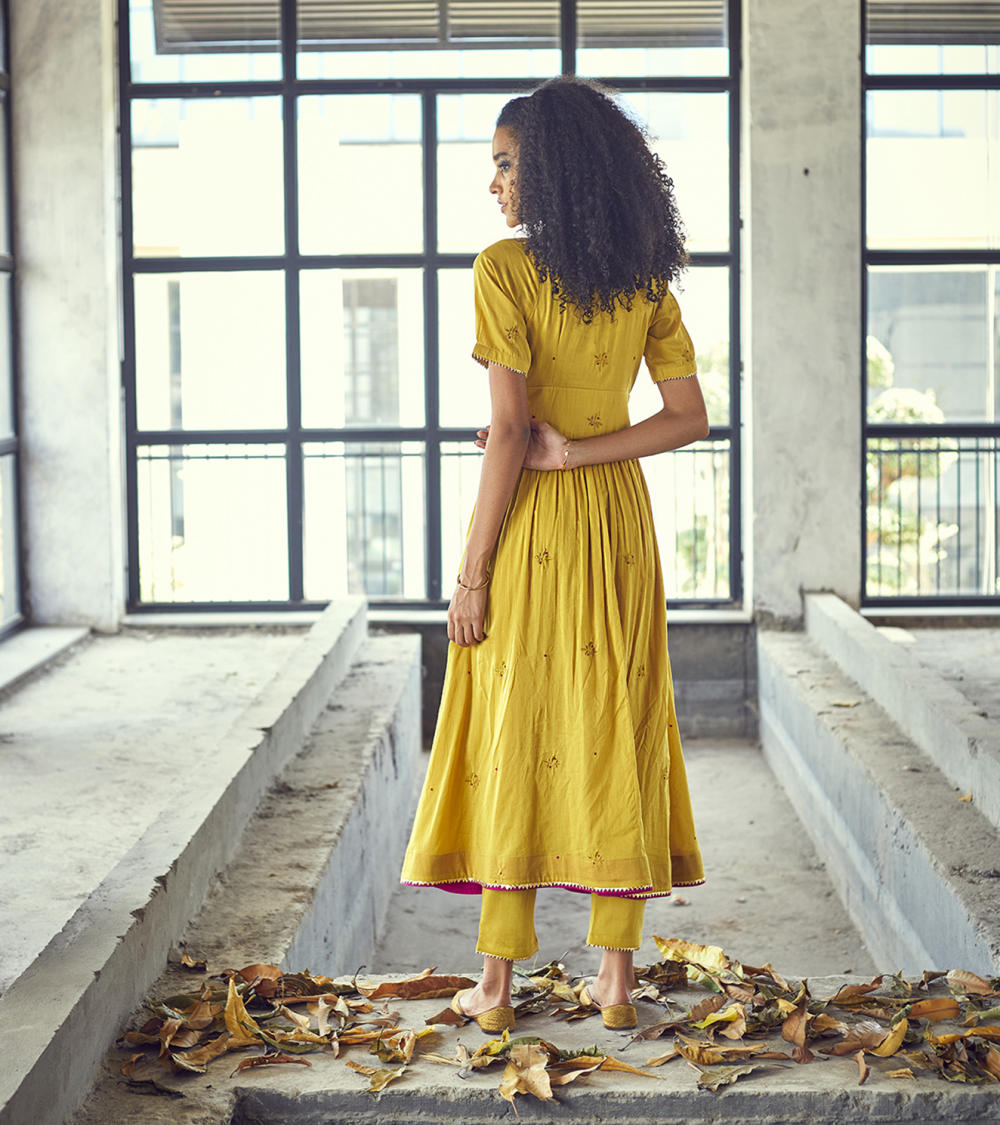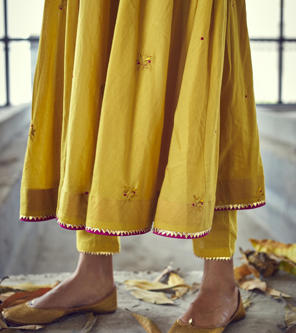Our genda coloured set is thoughtfully designed with delicate gold and gulabi floral embroidery and delicate gota work. Front button opening and peek - a - boo gulabi hemline finishing a longline front opening. It comes with matching elasticated waist pants.