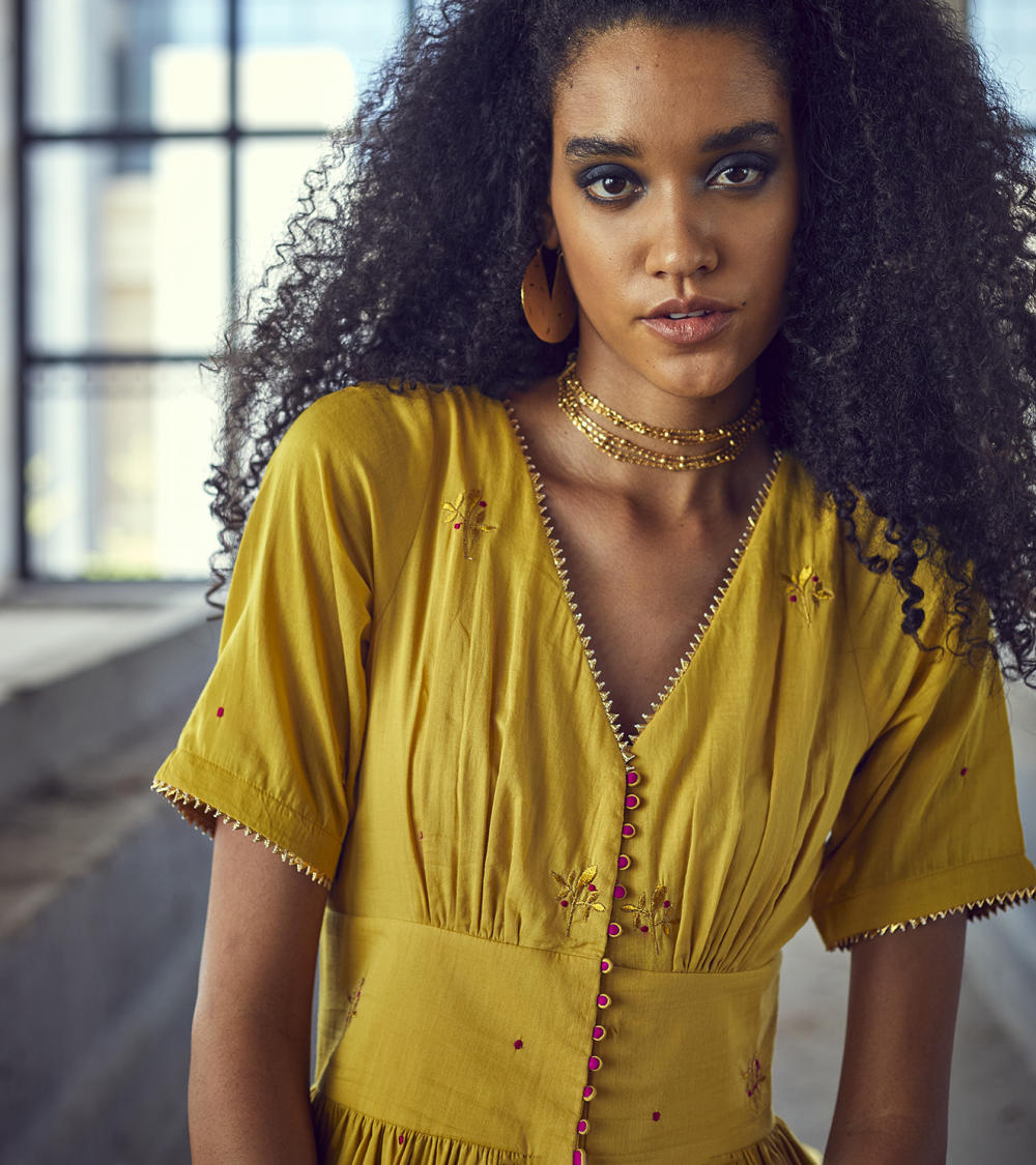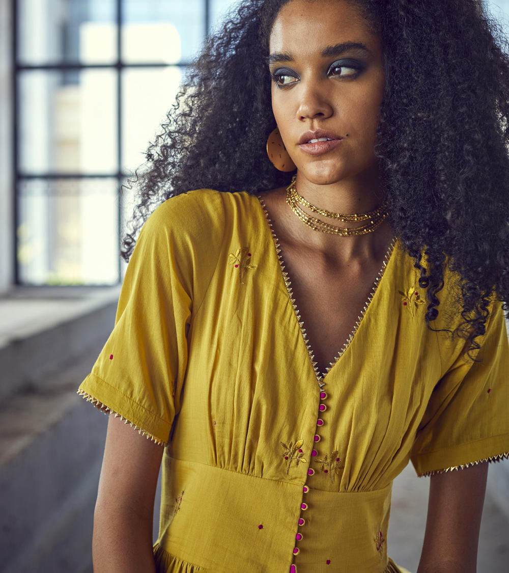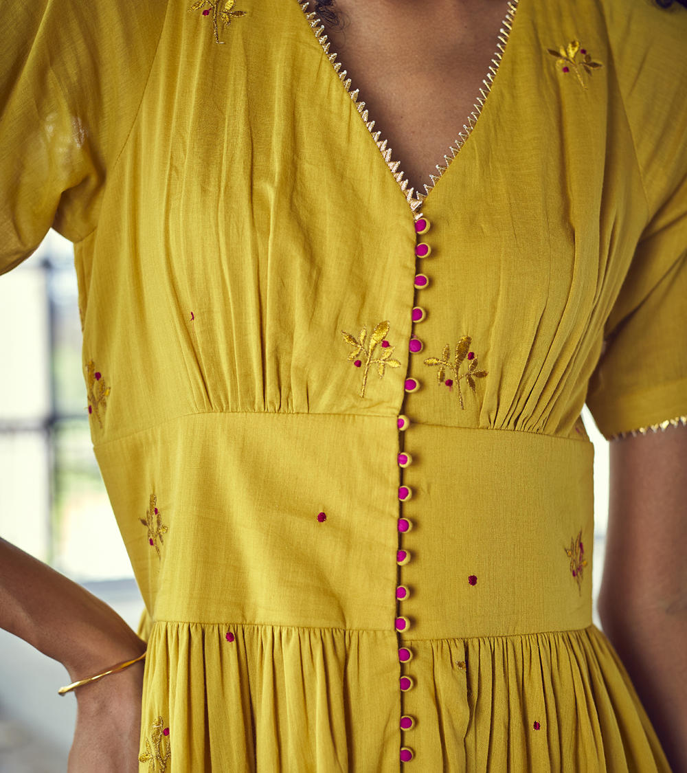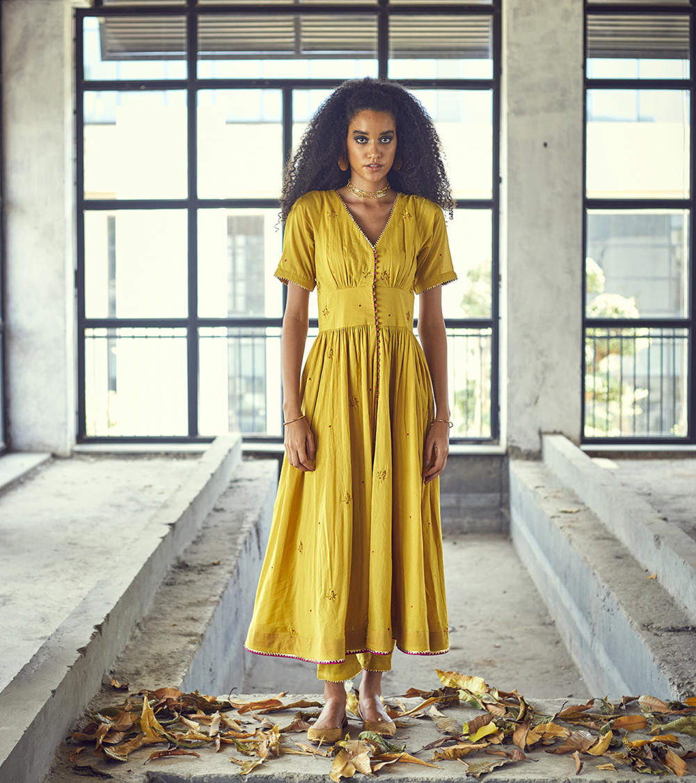 Our genda coloured set is thoughtfully designed with delicate gold and gulabi floral embroidery and delicate gota work. Front button opening and peek - a - boo gulabi hemline finishing a longline front opening. It comes with matching elasticated waist pants.
