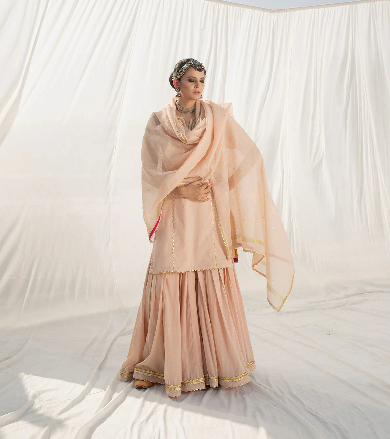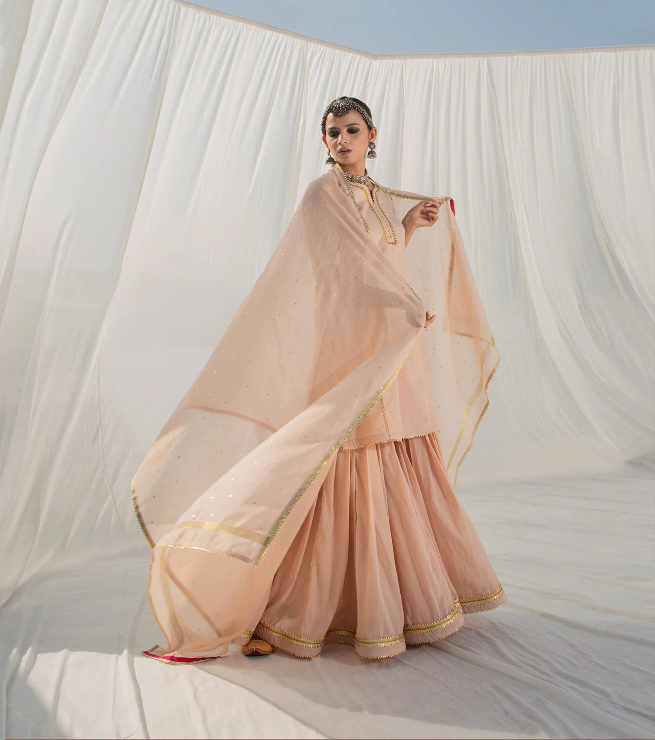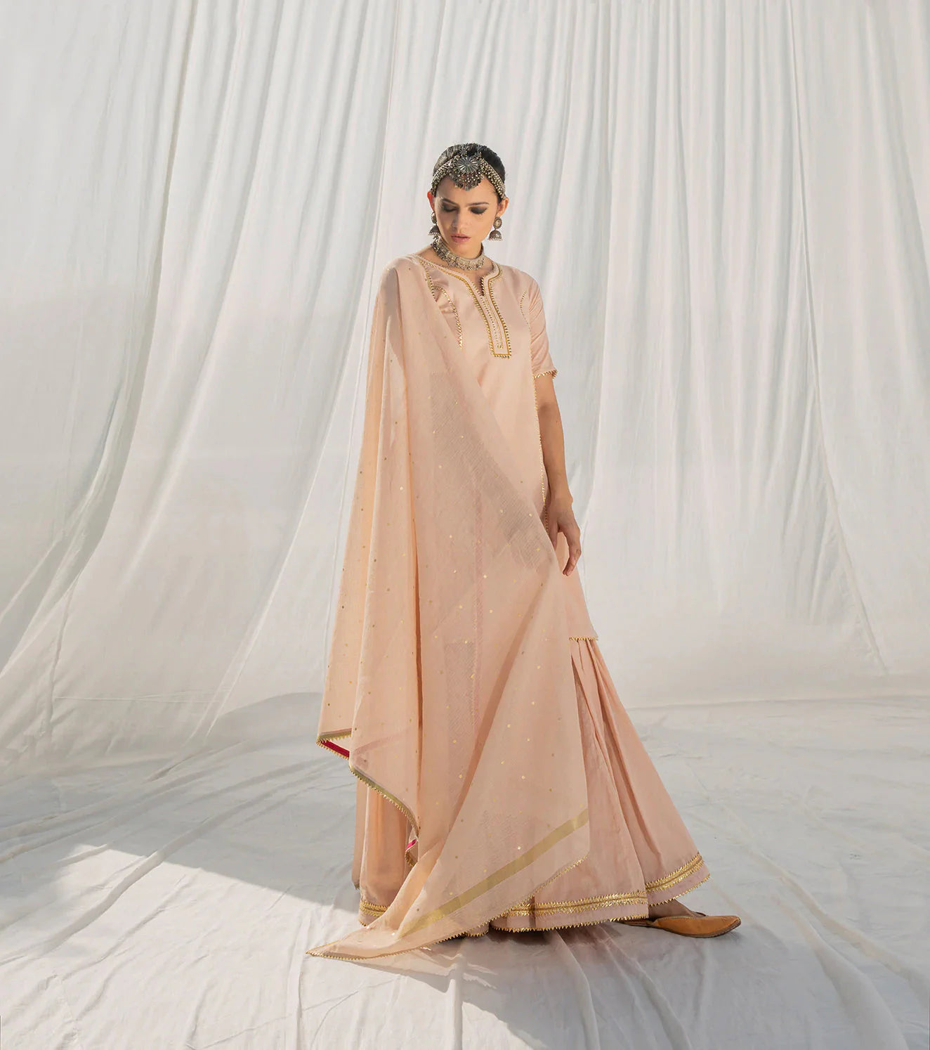 Our blush and gold sharara set has an old world charm with its delicate and lightweight finish in soft mulmul fabric. It's well tailored and finely finished with intricate gota work in gold. The mulmul fabric gives it a dreamy and mystical feel. The dupatta comes with a kota doria border and overall gold foil polka print adding a pinch of color to this timeless piece.