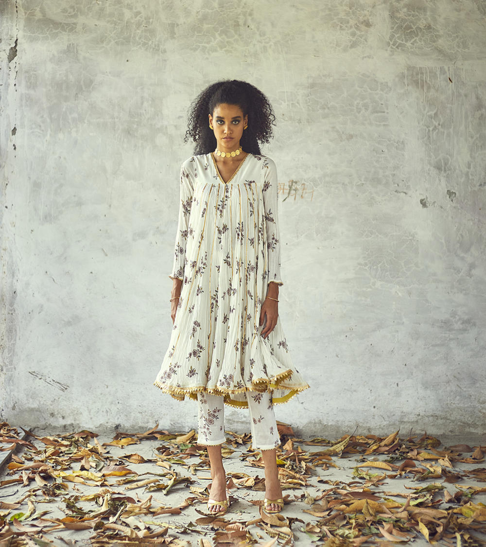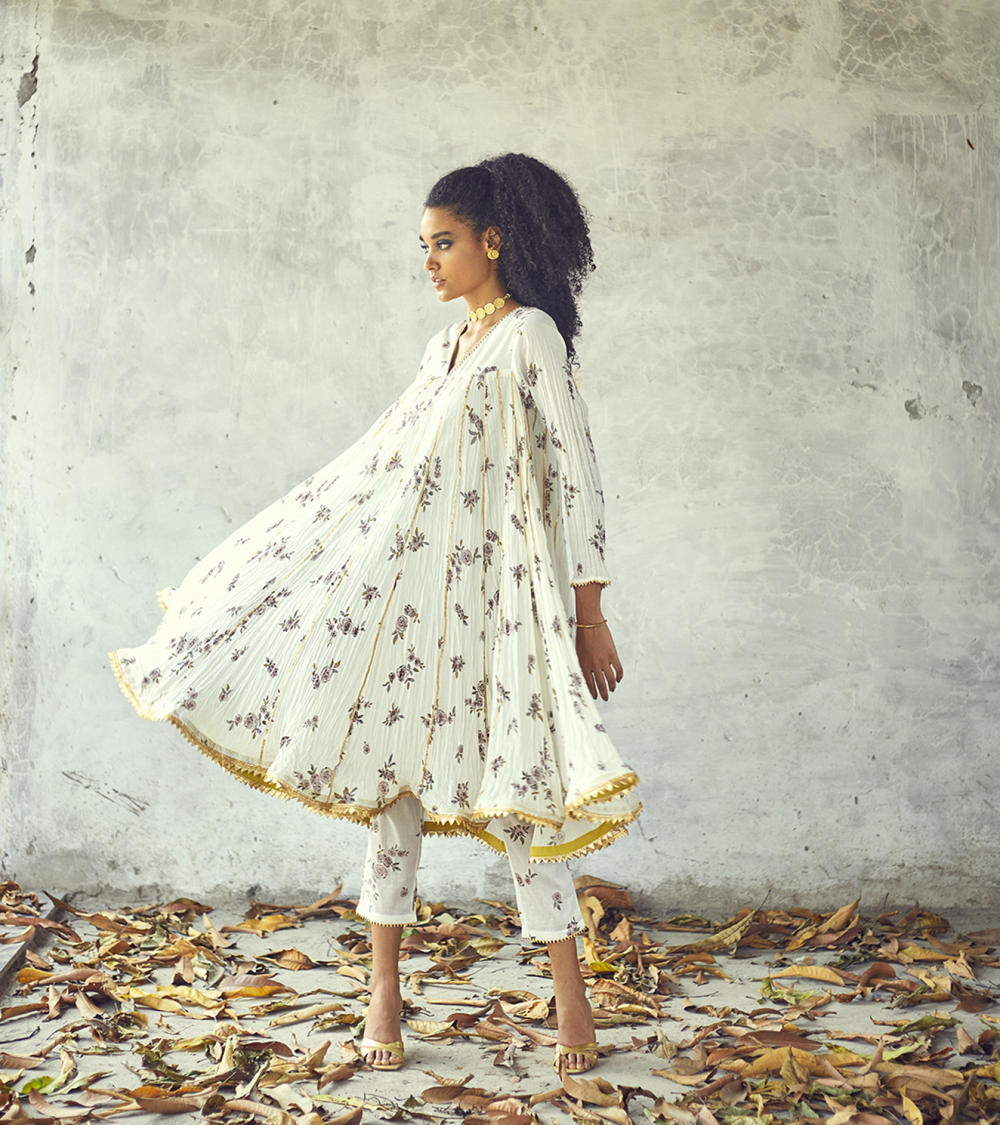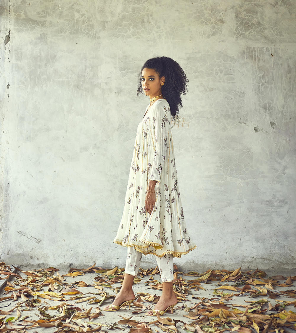 Vintage print floral gheredar kurta, with an upper chest yoke and crinkled body. Delicate gota lace and hemline finishing completes the festive look. Paired with matching straight pants.
