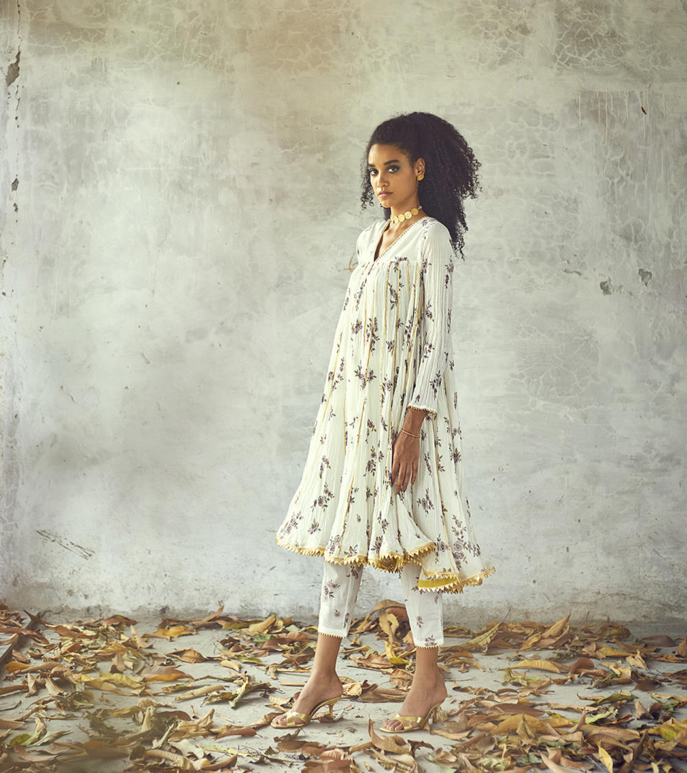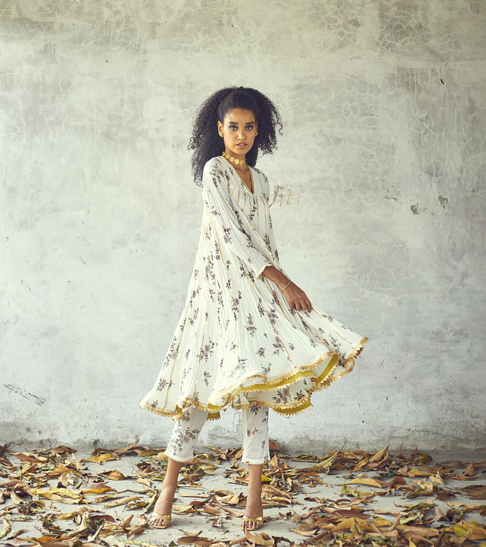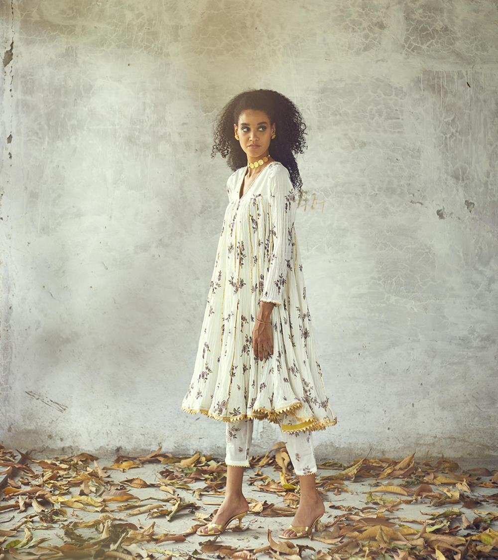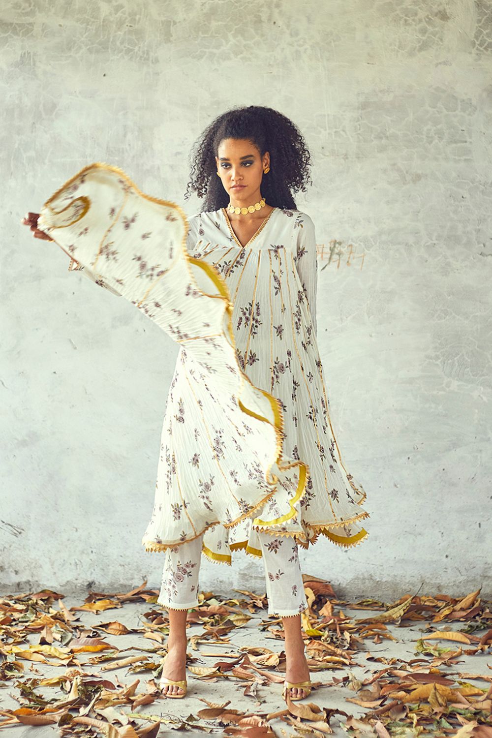 Vintage print floral gheredar kurta, with an upper chest yoke and crinkled body. Delicate gota lace and hemline finishing completes the festive look. Paired with matching straight pants.