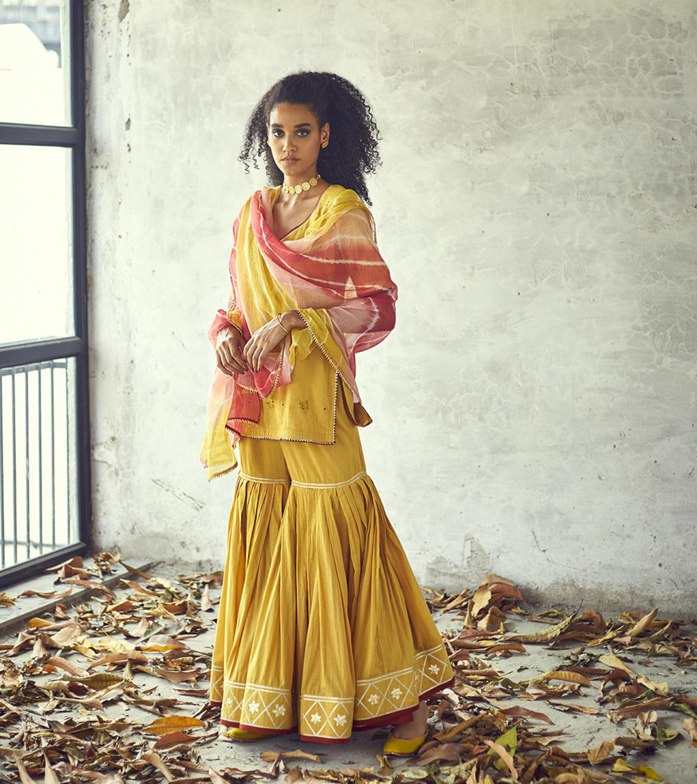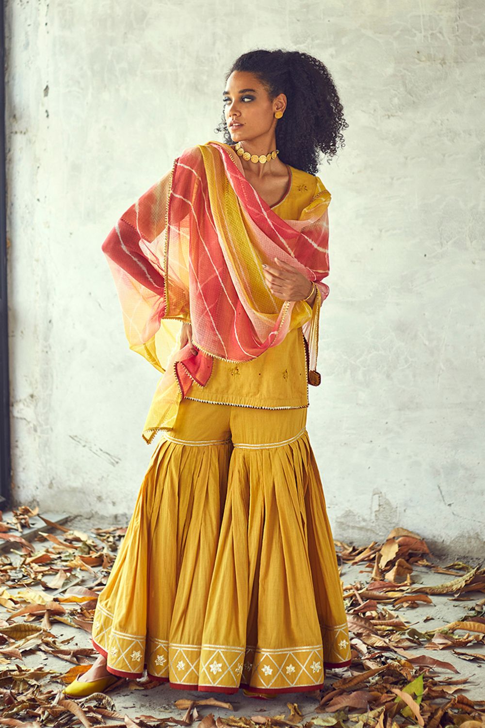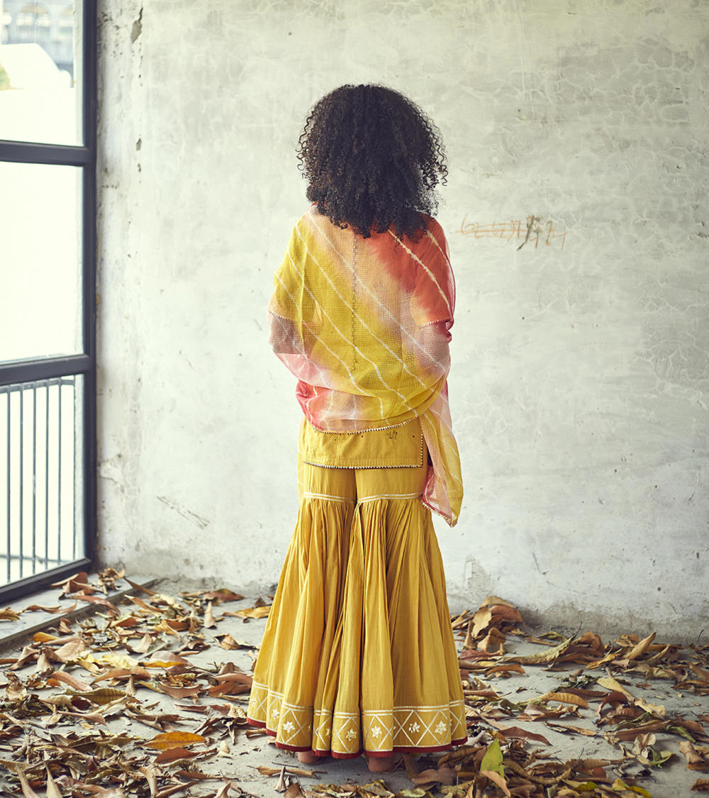 Mustard short kurti with a splatter of gold and gulabi floral embroidry, and pleated sharara set. Delicate gota work with a peek a boo finishing. Paired with our Rangeen kota doria dupatta, with delicate details of gota and tassels. It comes with potli button face back opening for an easy wear.