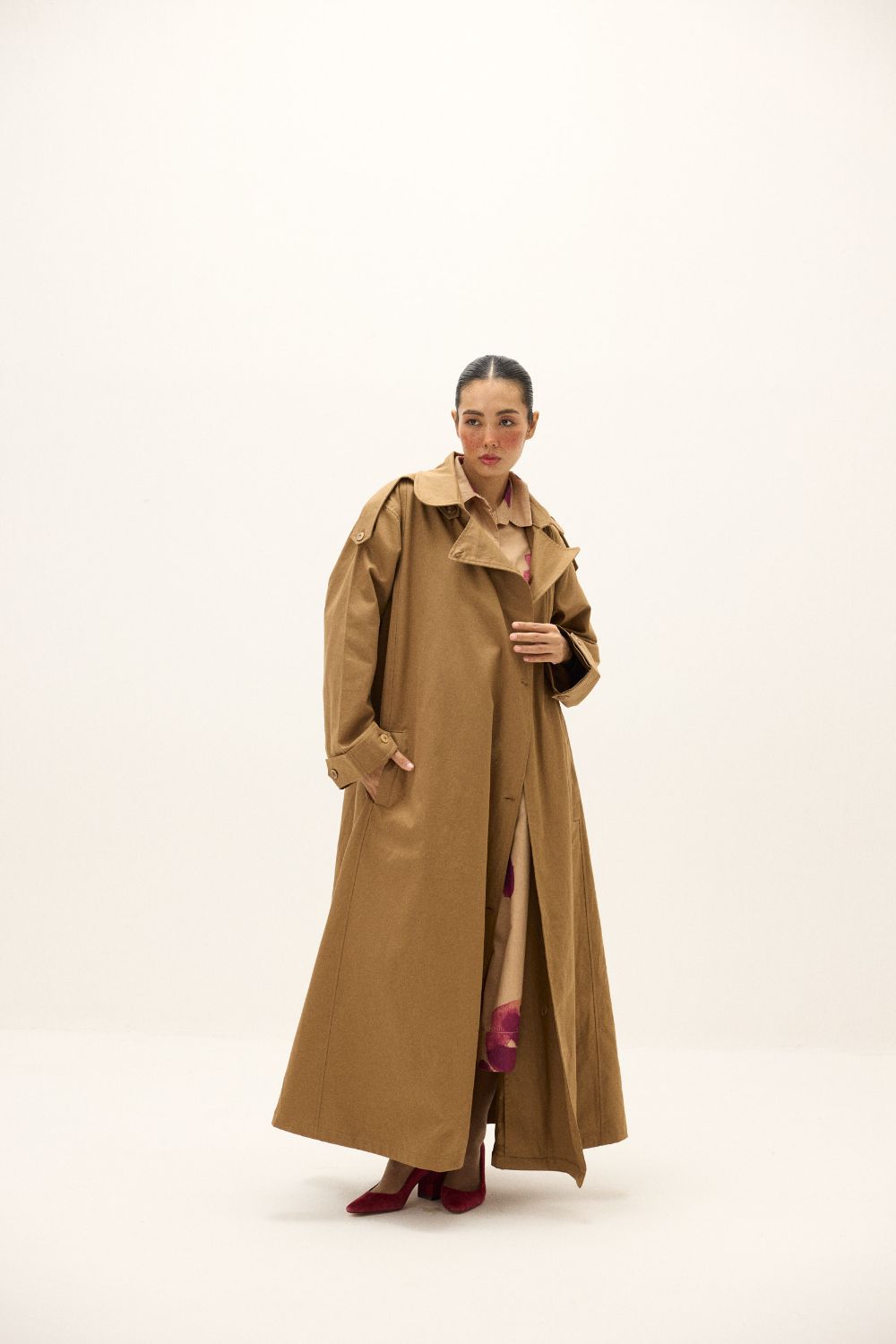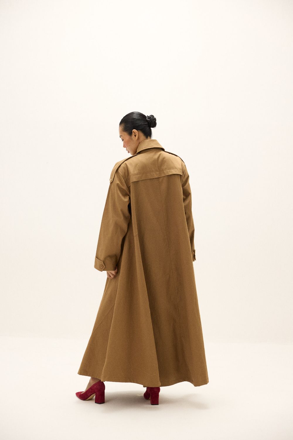 A full-length trench coat in twill fabric, designed with a relaxed fit for effortless layering. Features classic detailing with button closure, storm flap, side pockets, and buttoned cuffs. A versatile outerwear essential to take you through the season.