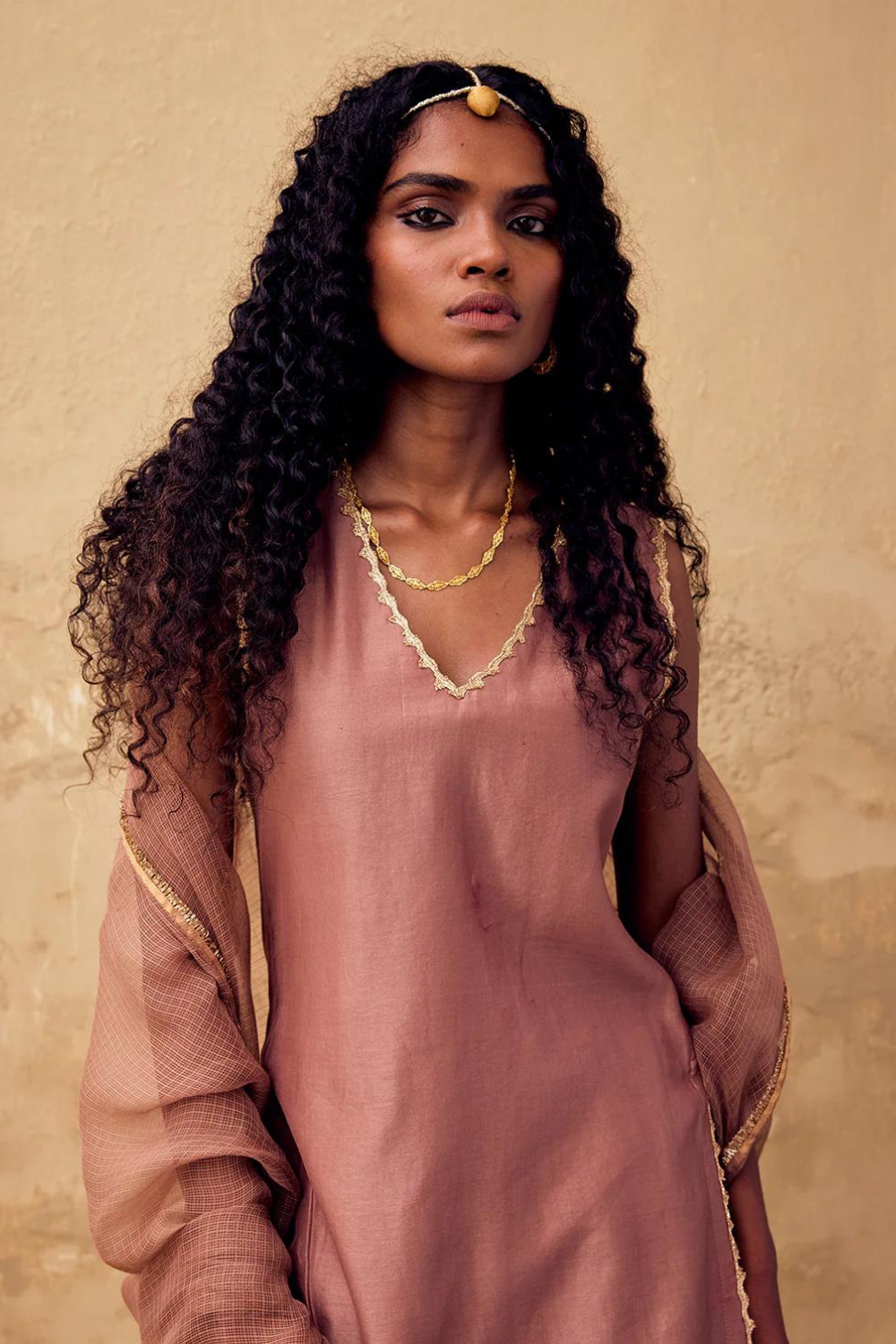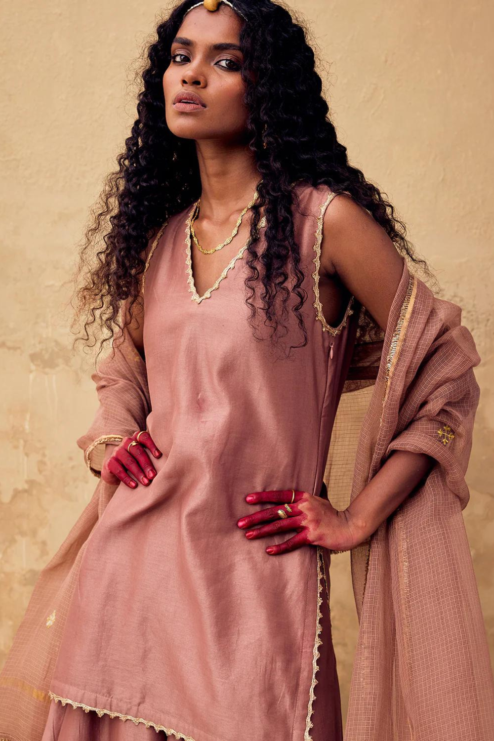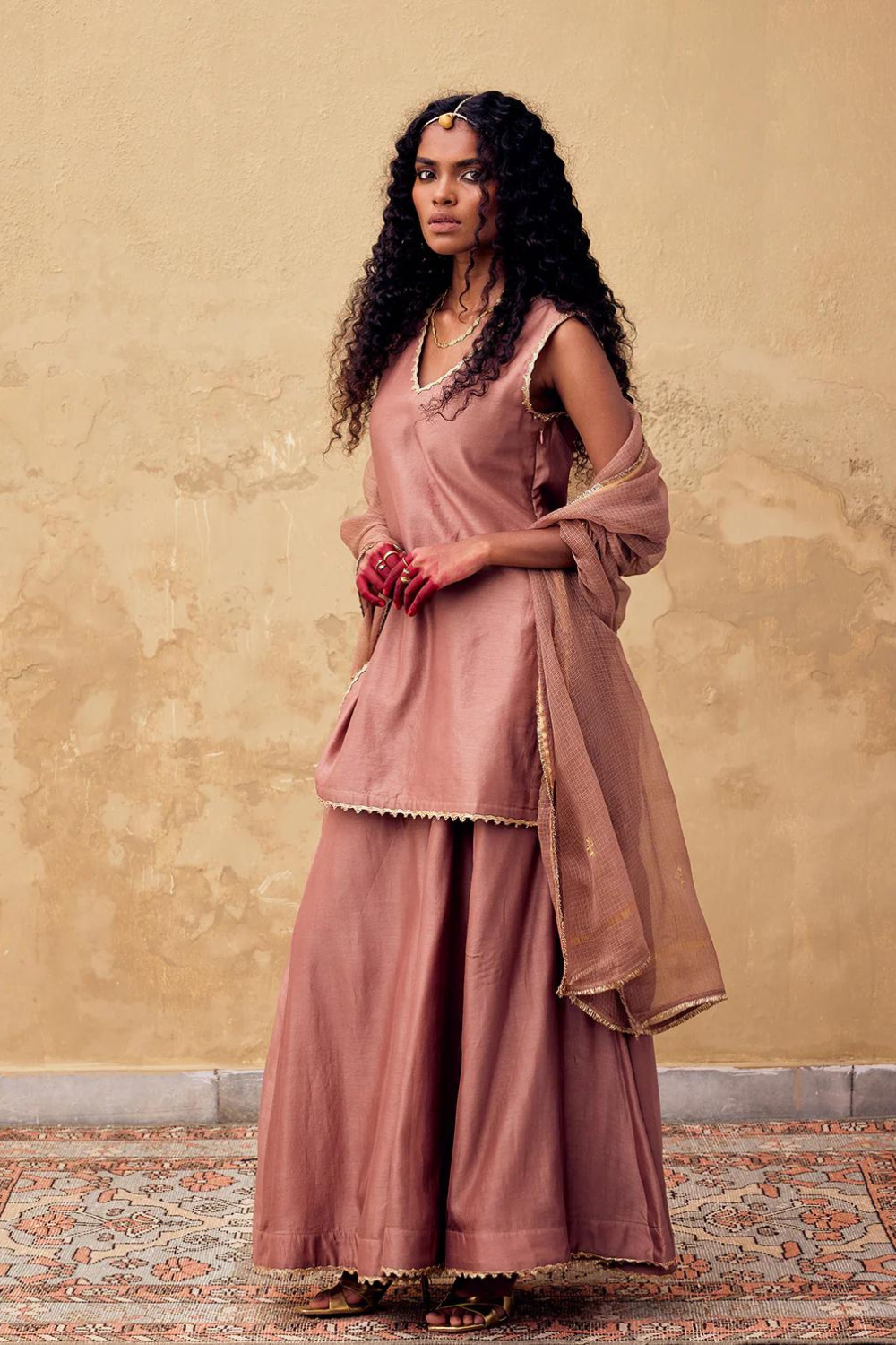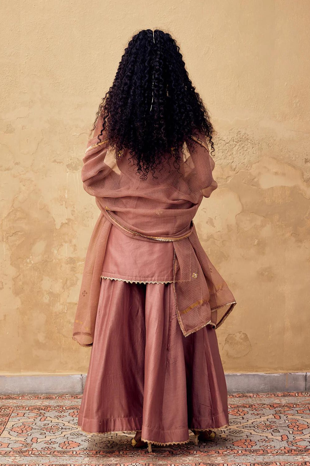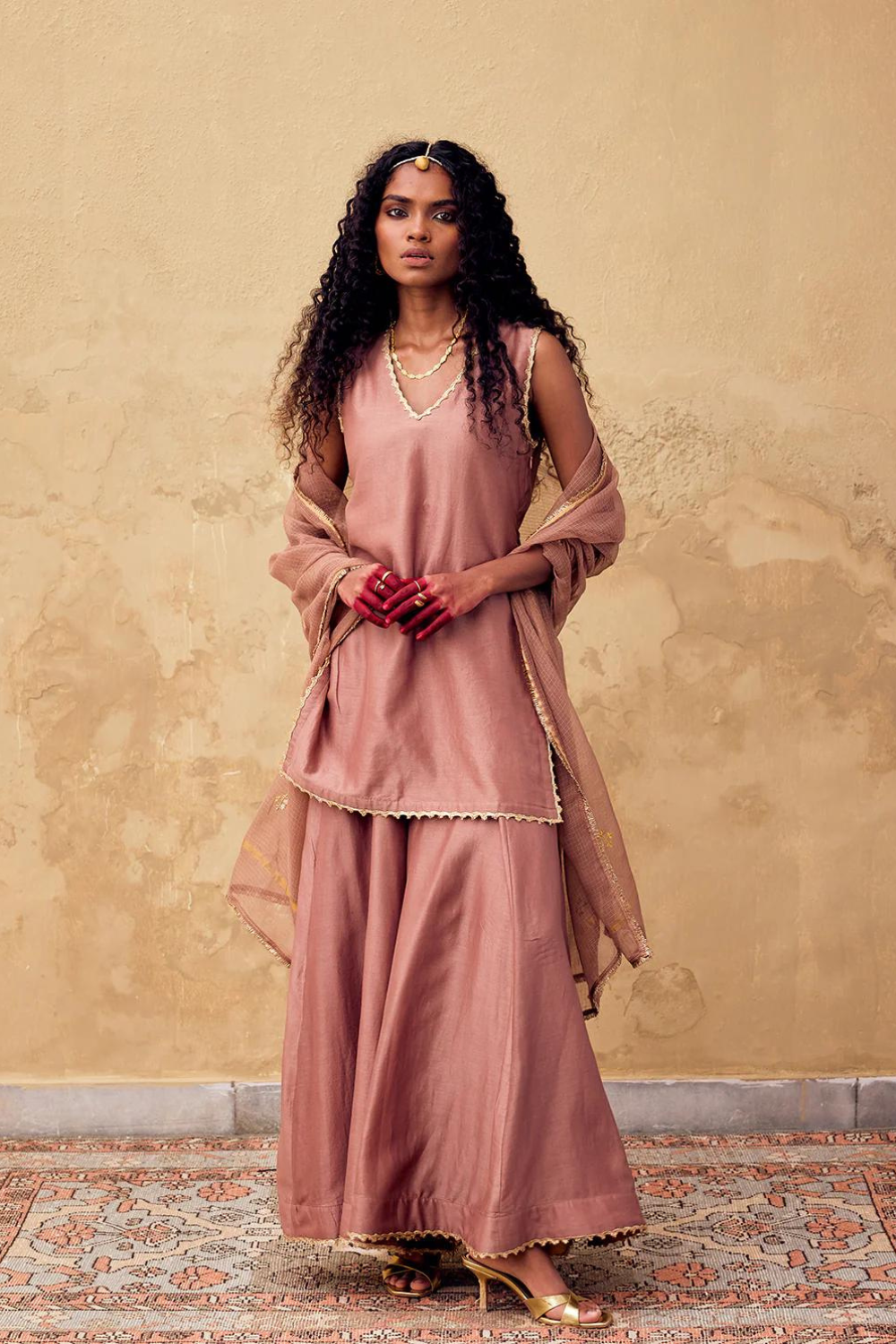 A rose mauve kurta with side zipper opening featuring gota lace at hemline, neckline and sleeves crafted in chanderi, paired with sharara pants in chanderi with side zipper opening with a button fastening.