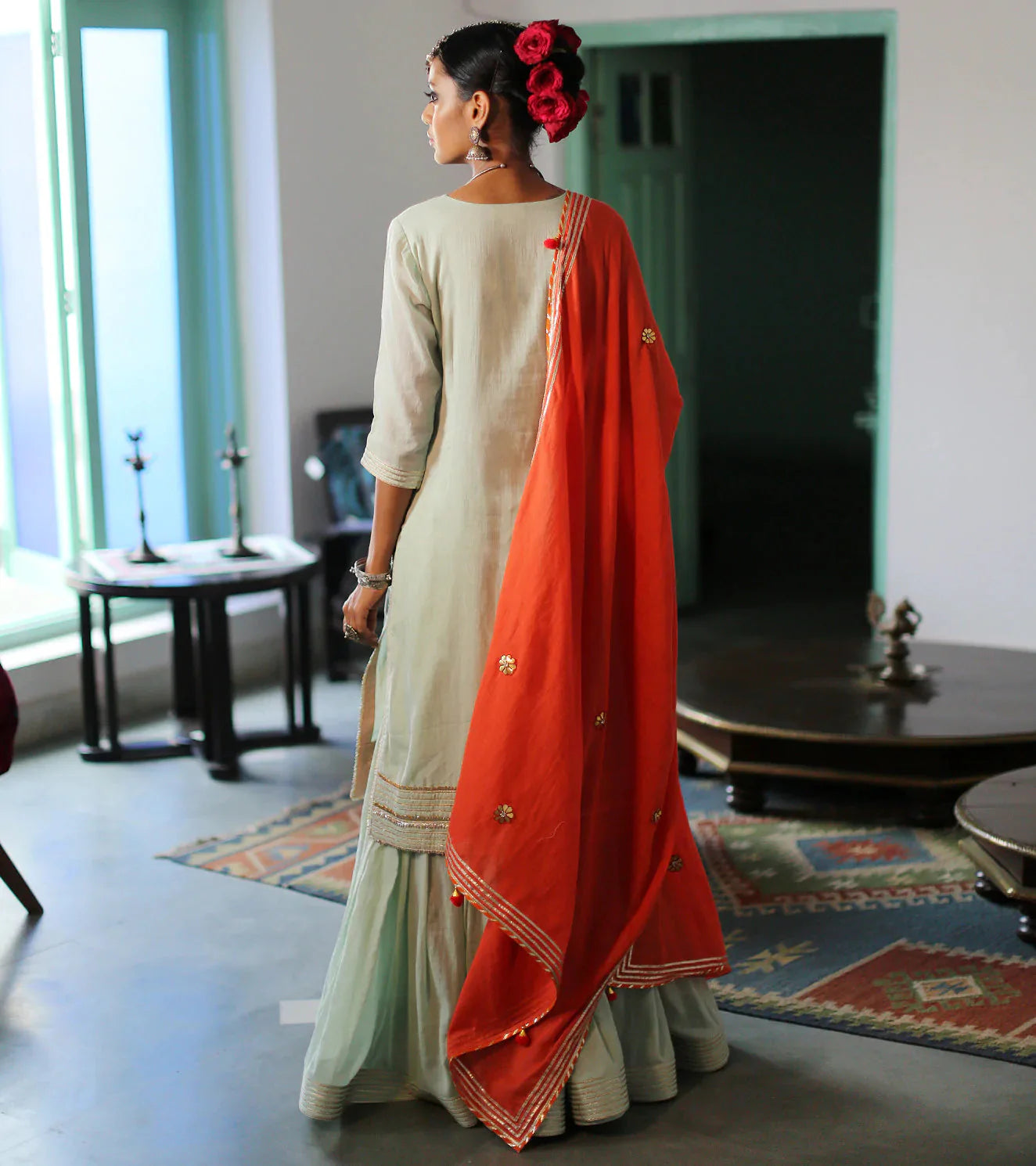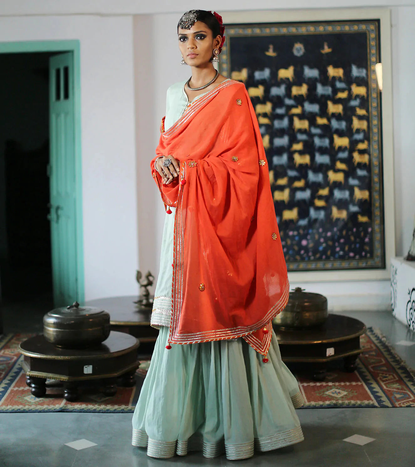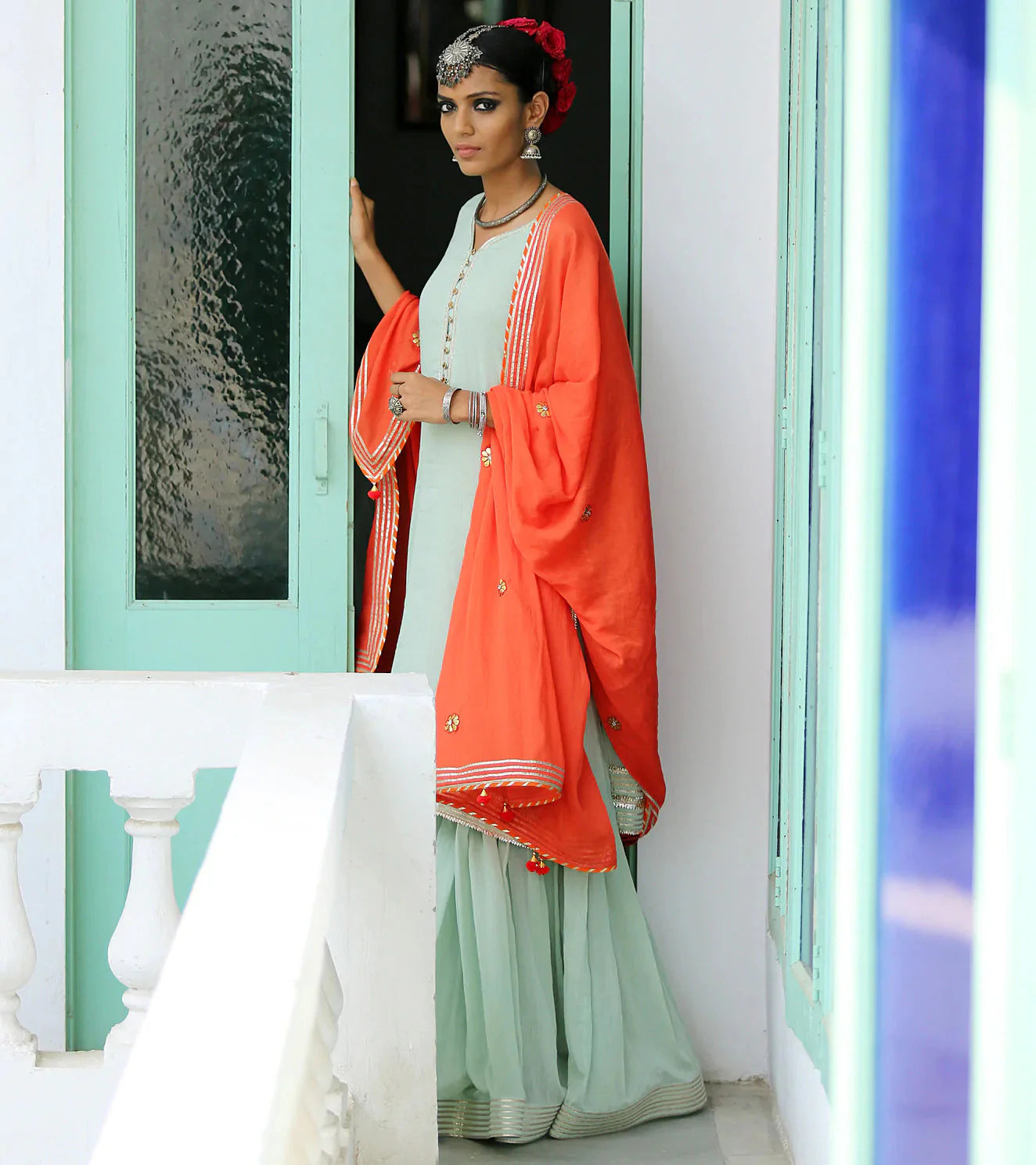 A feather-light sharara set in a fresh hue of green, handcrafted from the soft and sensuous mul fabric. The set consists of a beautiful kurti trimmed with gota highlights and golden buttons, a sharara fitted till the thighs and flaring out for a royal appeal, and a contrasting dupatta in a contemporary shade of orange.