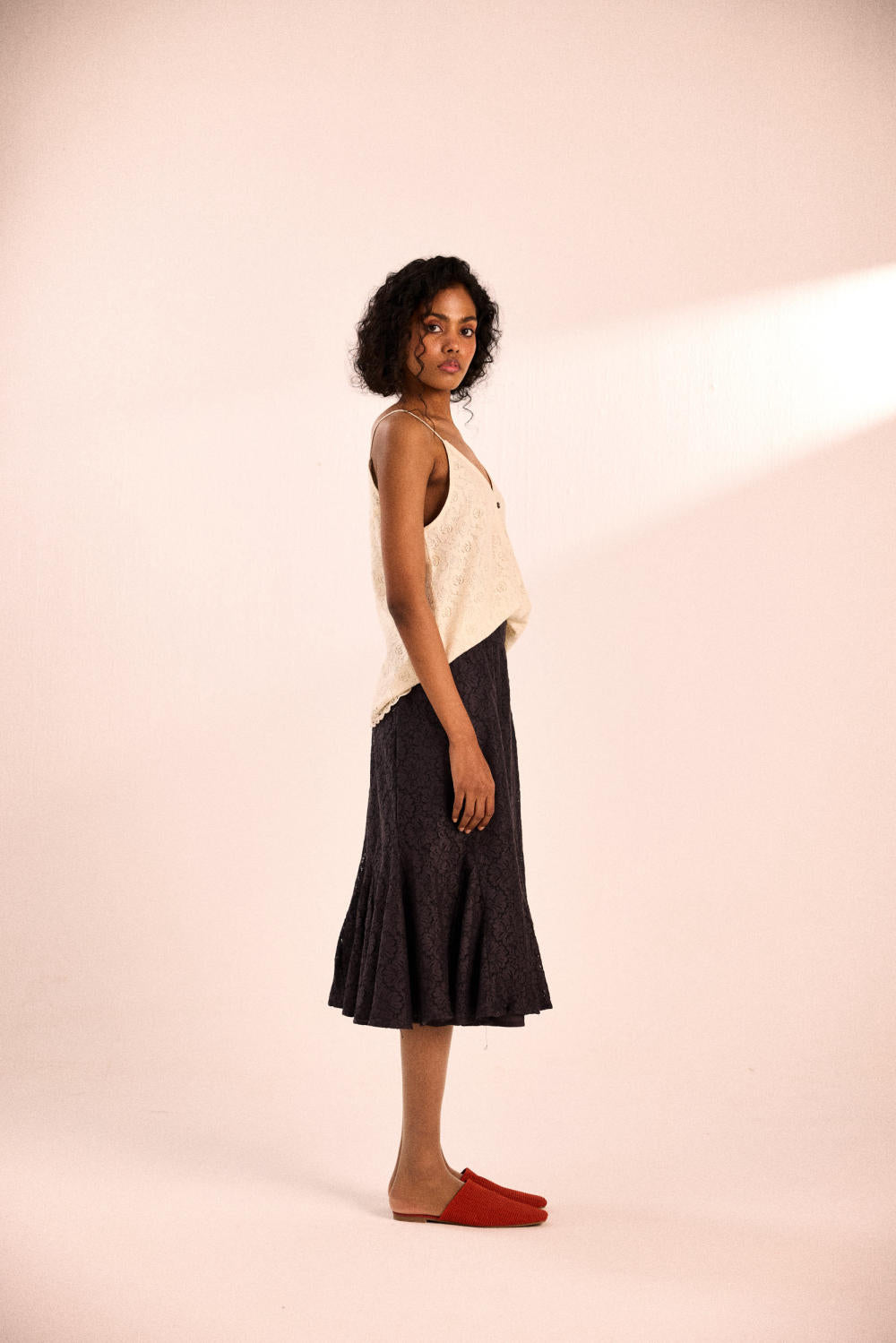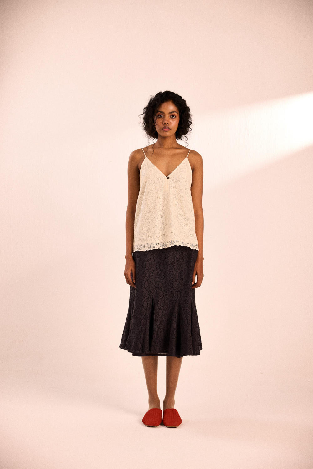 A delicate cotton lace top with a breezy silhouette, thin straps, and a subtle front button detail. Finished with a scalloped lace hem for an effortlessly romantic touch.