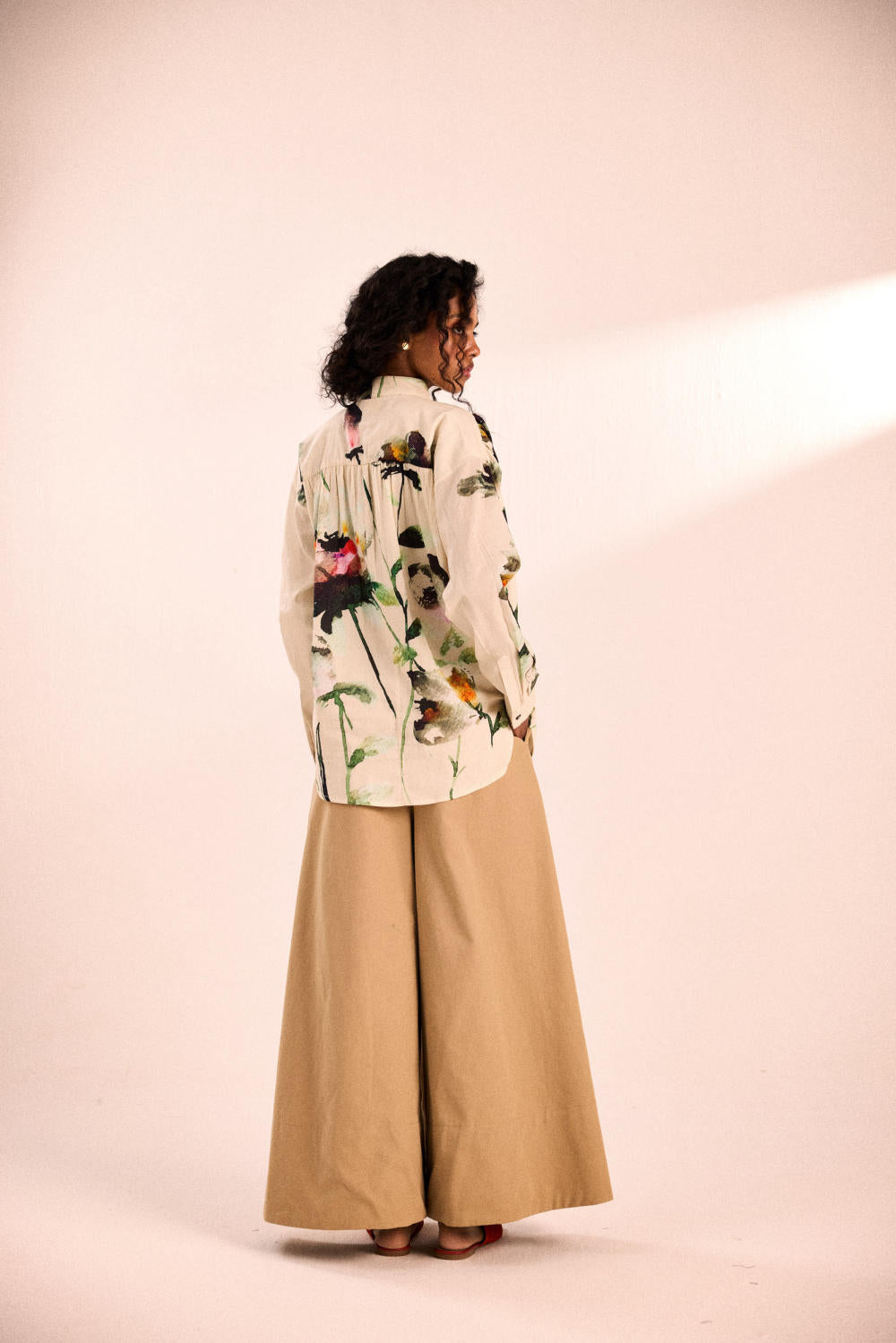 An off-white shirt in mul cotton with watercolor-inspired prints on the sides and sleeves. Featuring a band neck and soft gathers at the shoulder and back yoke, it offers a refined, relaxed look.