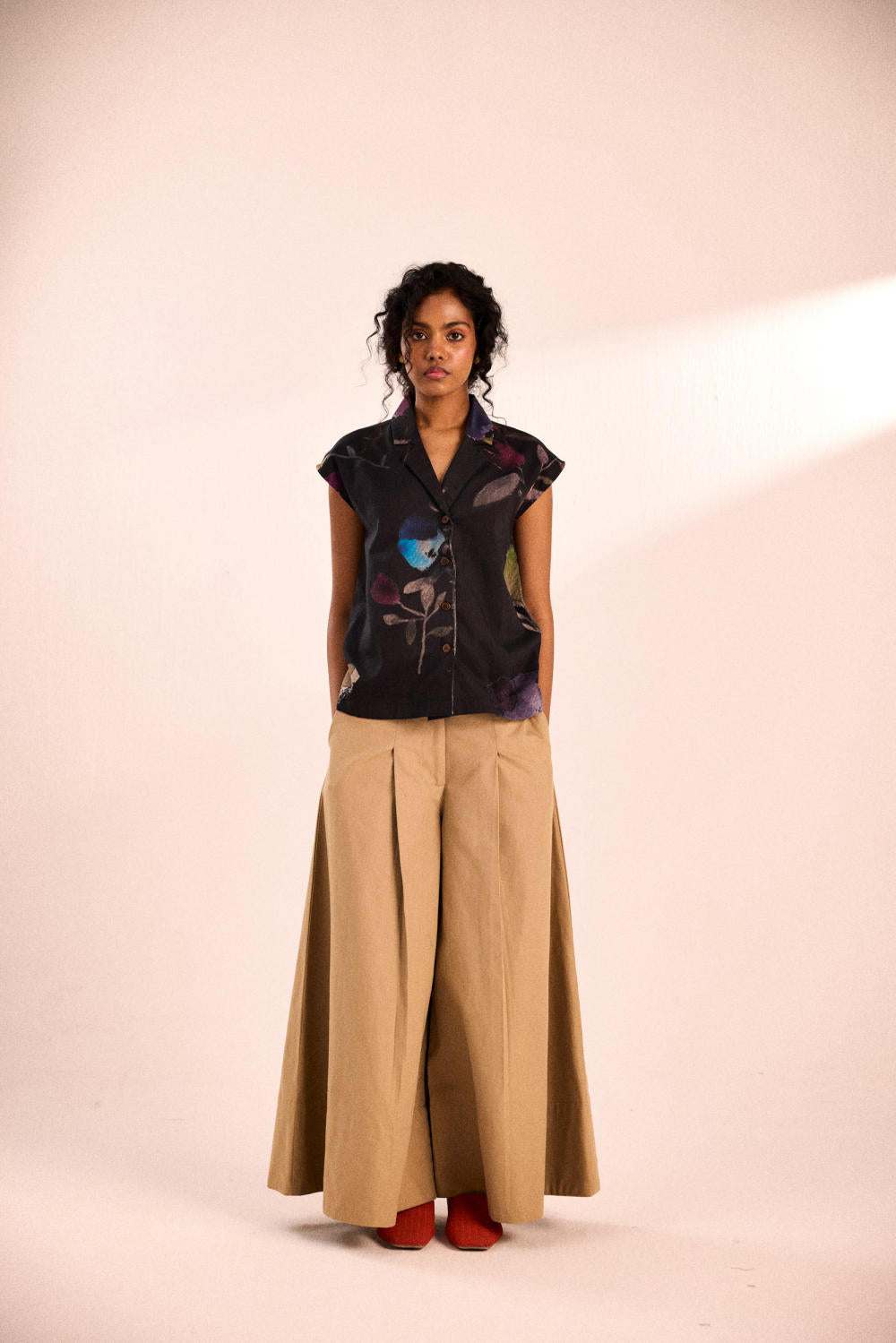 A modern take on a classic button-down, the top features a sharp, structured silhouette with a soft, draped fit. The deep, inky base is adorned with delicate floral prints, creating a striking contrast that transitions effortlessly from day to night.