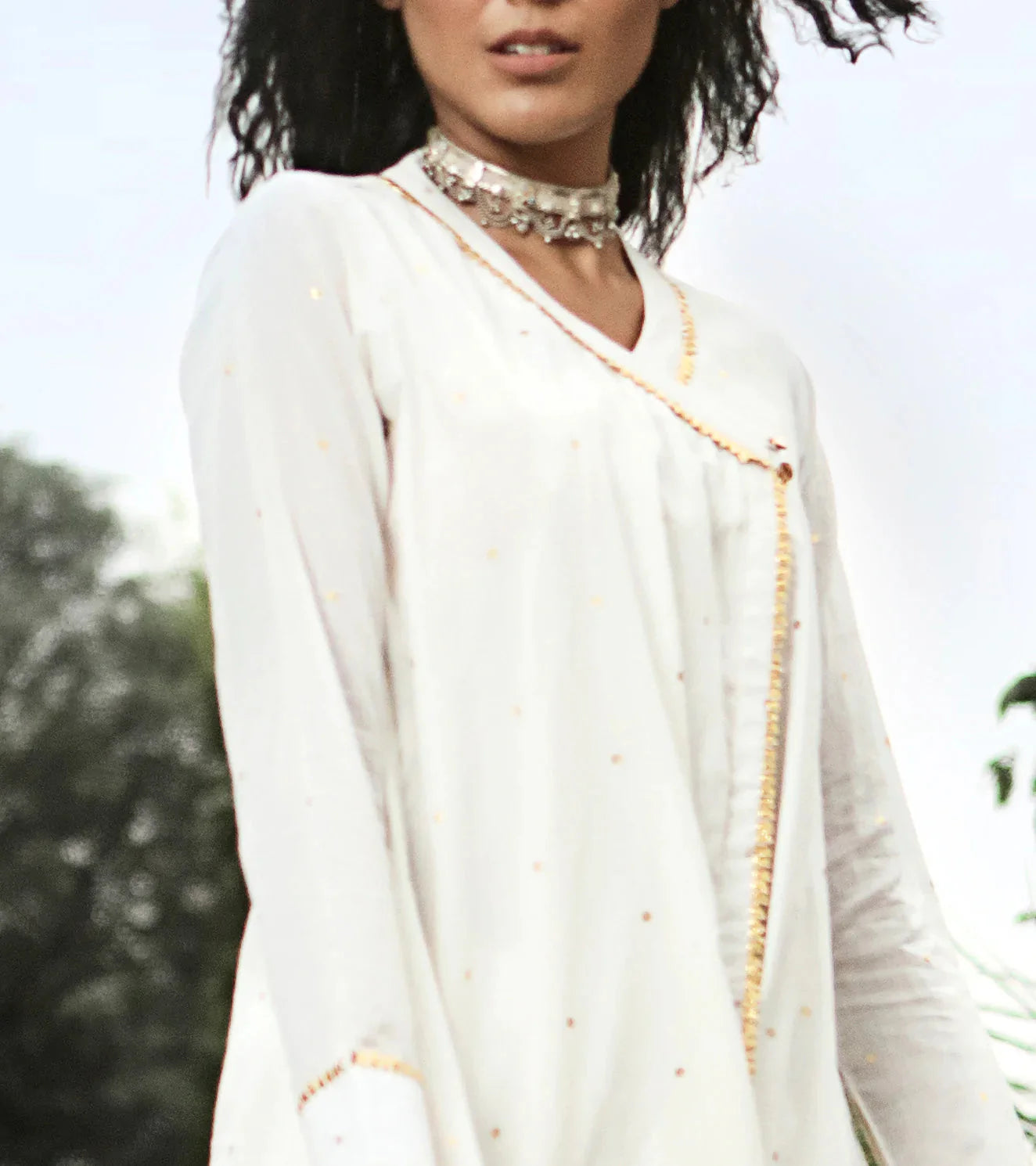 Ornamented with the beautiful craft of foil printing, lace and gota work on the hems, make this attire her easy separate to enjoy a bright and sunny afternoon.