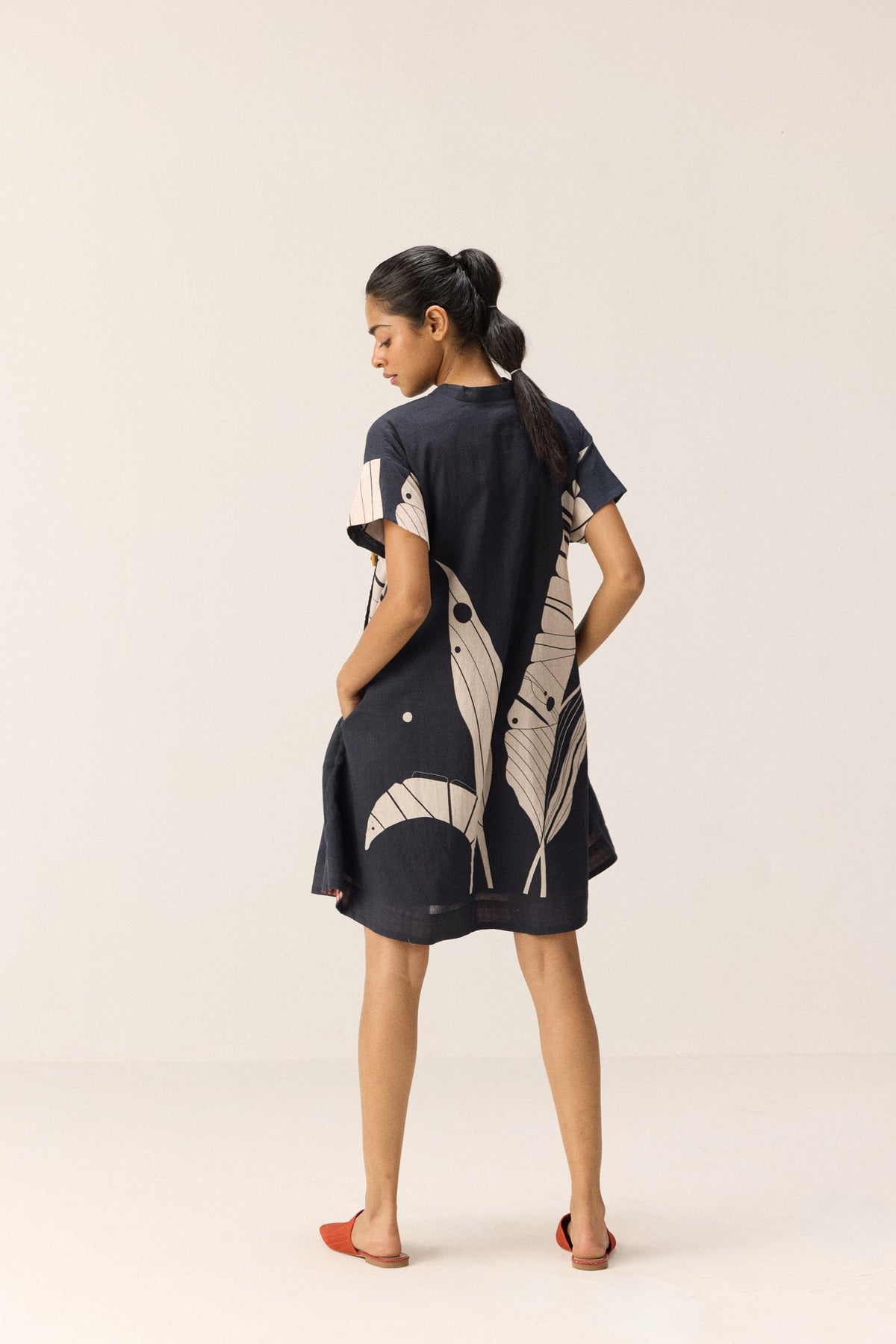 A black short dress featuring an overlap front panel with wooden button opening. Adorned with an abstract banana leaf print, it blends structure with ease. Thoughtfully designed with side seam pockets and fully lined for comfort. It has a red and white self weave fabric at the bottom for contrast