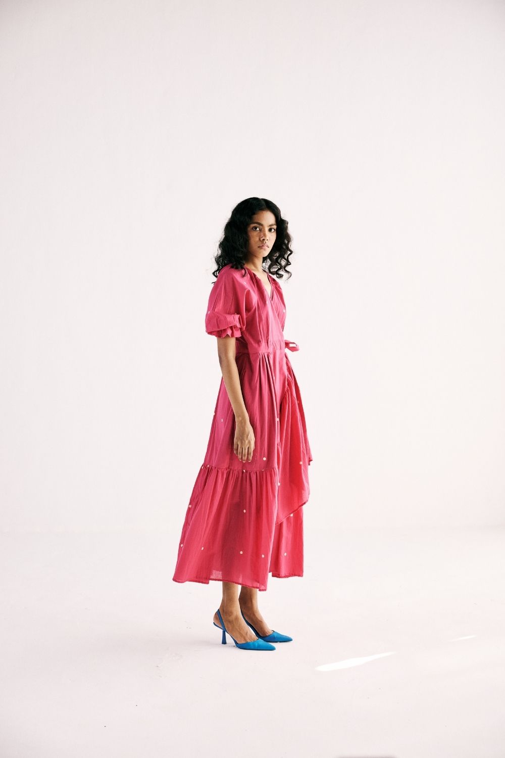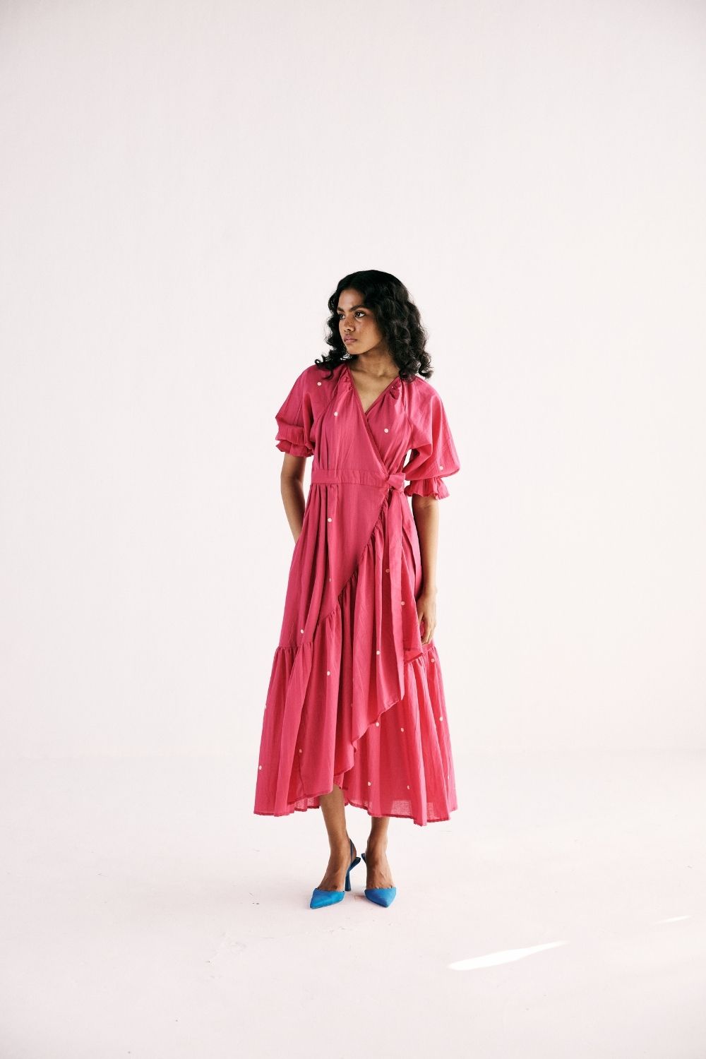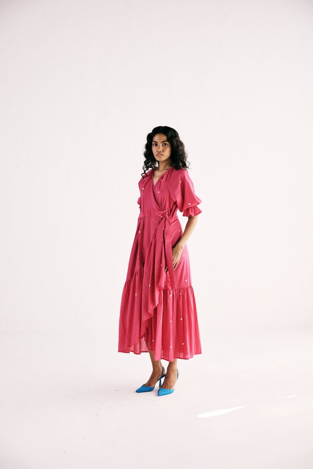 Pink Polka wrap is the symphony of comfort, its silhouette layered with grace and charm adorned with classic polka print in pink crafted in cotton mul. with front tie-up opening and an elasticated sleeve hem. Polka Dress Polka printed dress Polka Dress