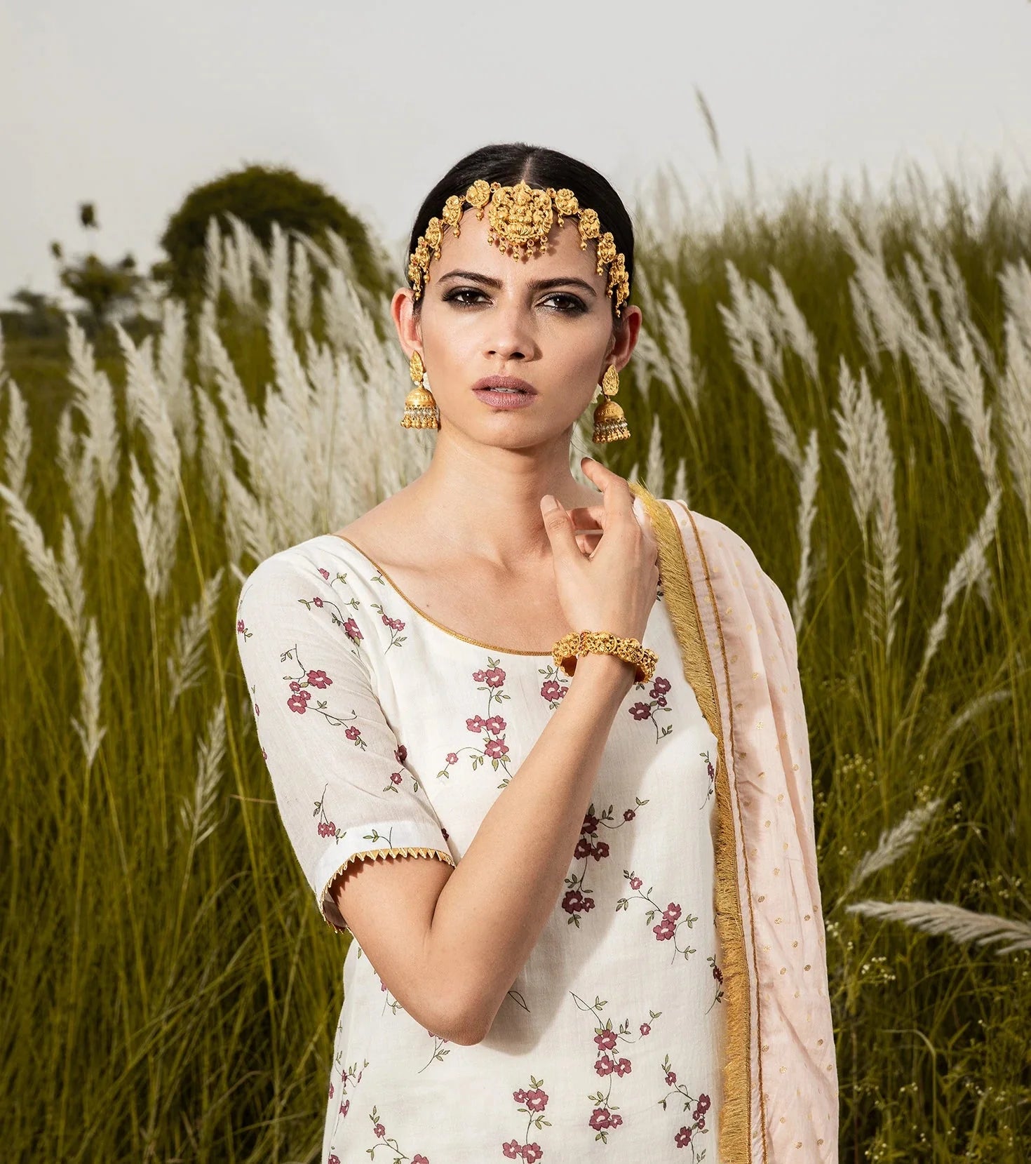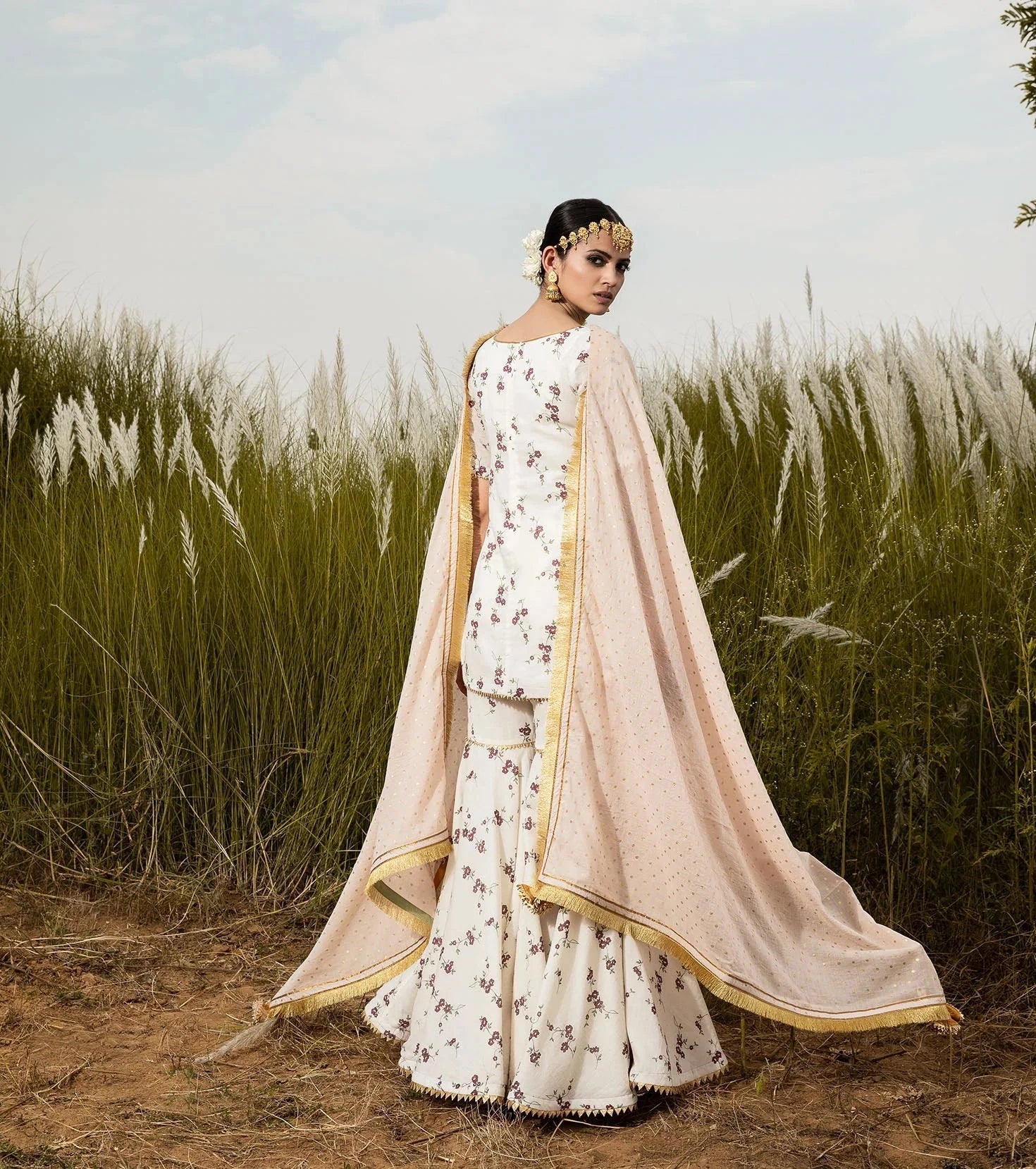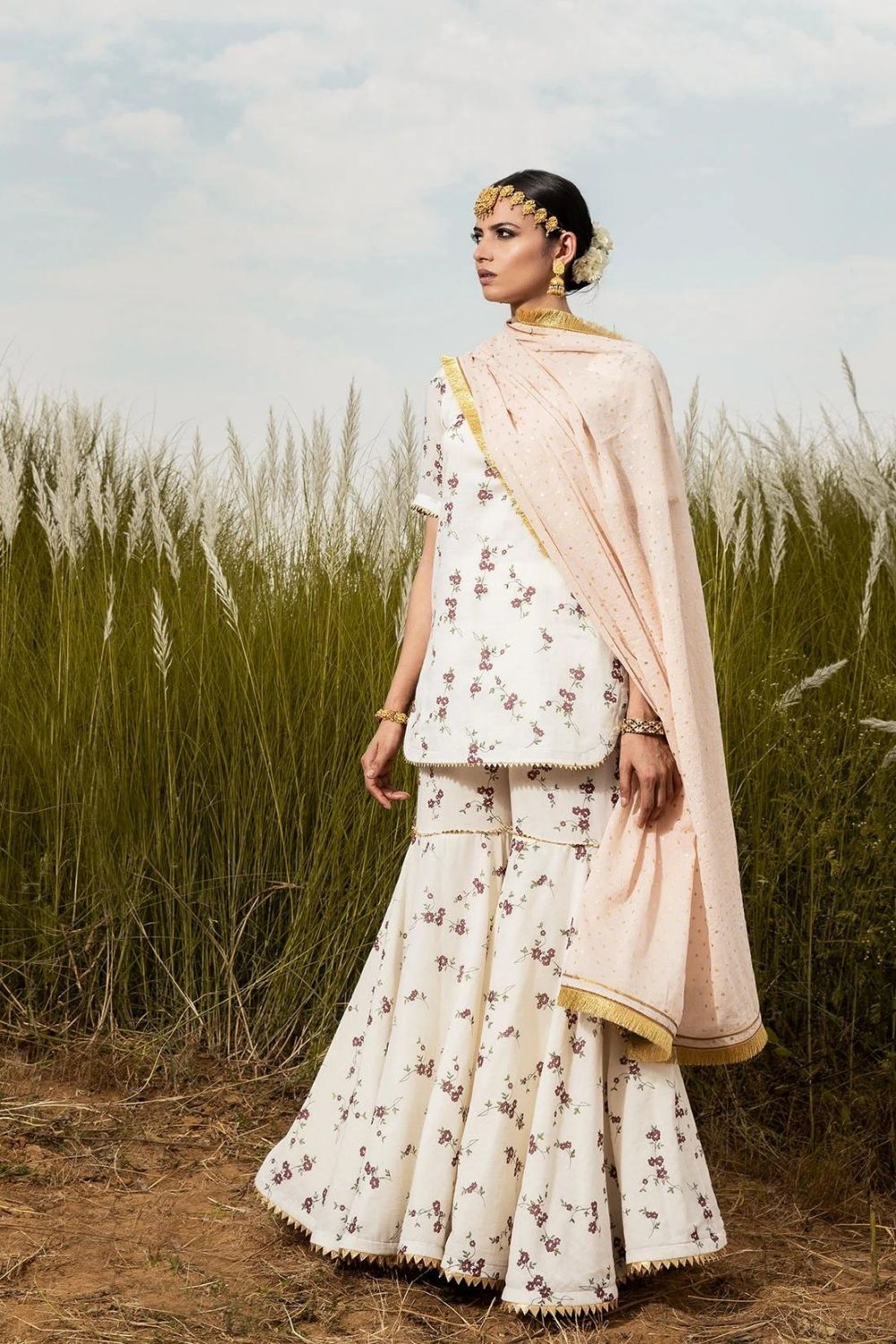 A modern take on our Grandma's staple. Ivory floral short kurti in soft mul, and A-line sharara set. Pair it with our blush 'Saachi' dupatta for a color pop, and drizzle of gold with delicate details of gota.