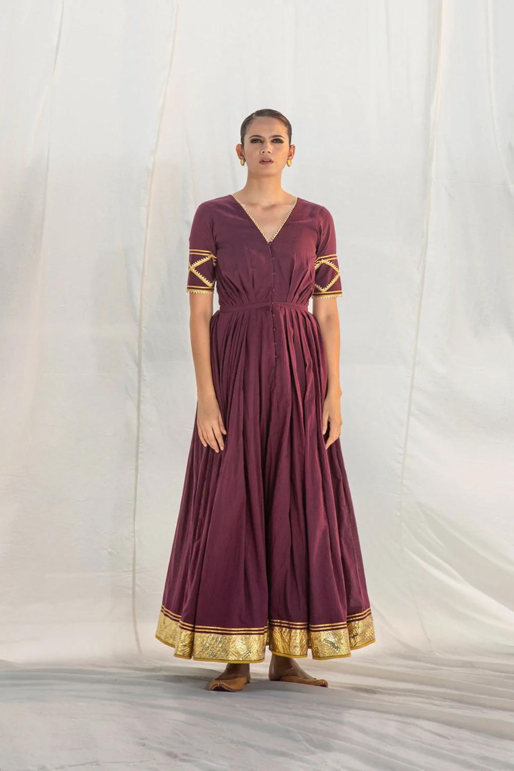 Stand out in a flash with this sweeping maxi dress. Crafted in 100% pure mulmul fabric, this gorgeous piece features a front button panel and a fitted body that flares down from the waist below. This breath-taking beauty is a standout with its multiple layers, contrasting piping and delicate gota work that runs all along the hemline.