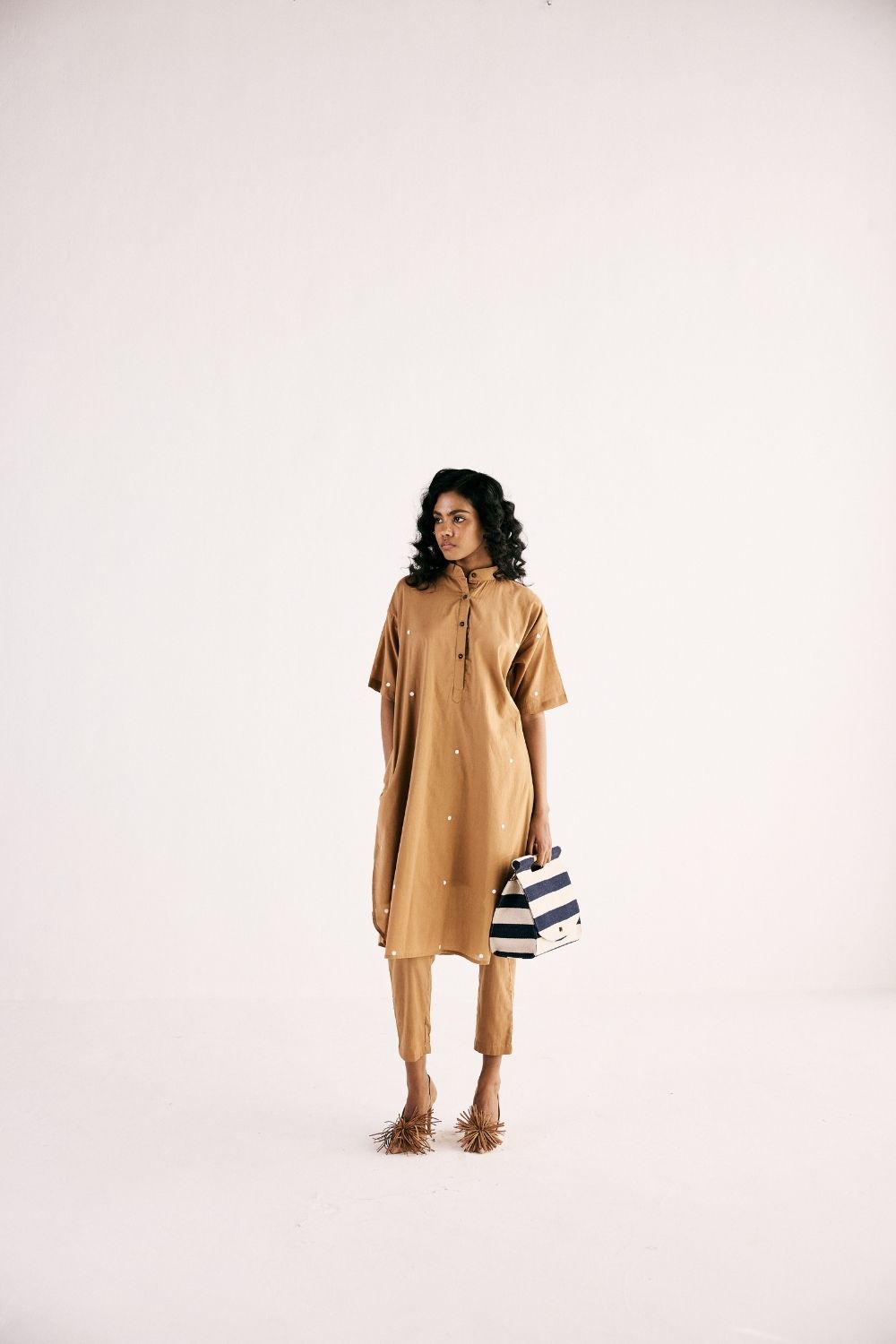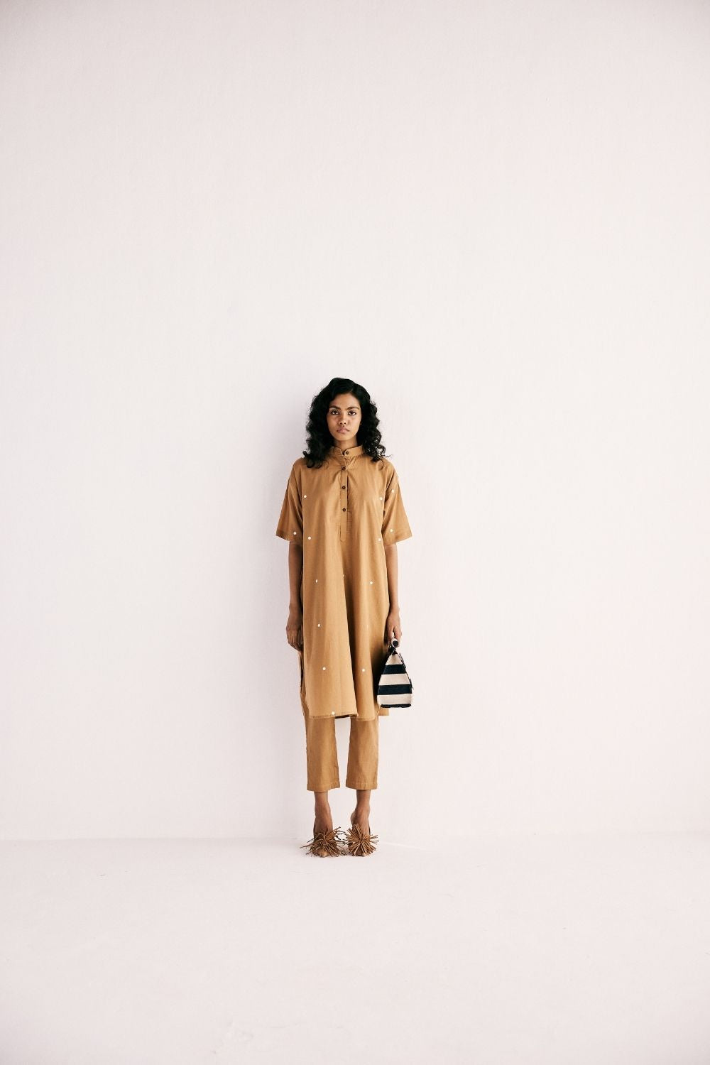 A Sand polka dot printed kurta with front button opening crafted in soft cotton mul paired with cotton mul pencil pants fully elasticated. Kurta Set, Pants