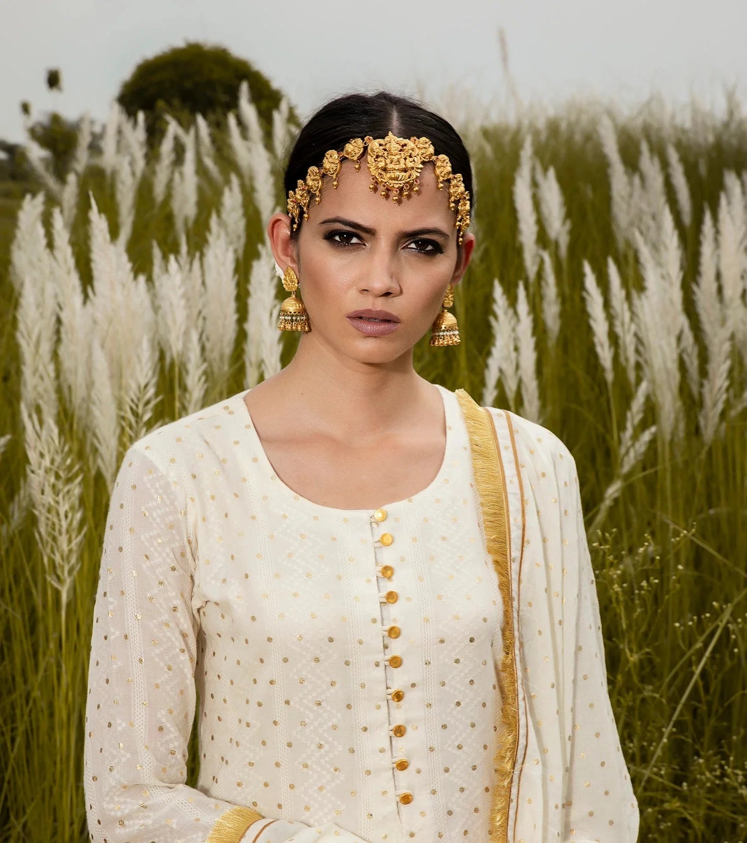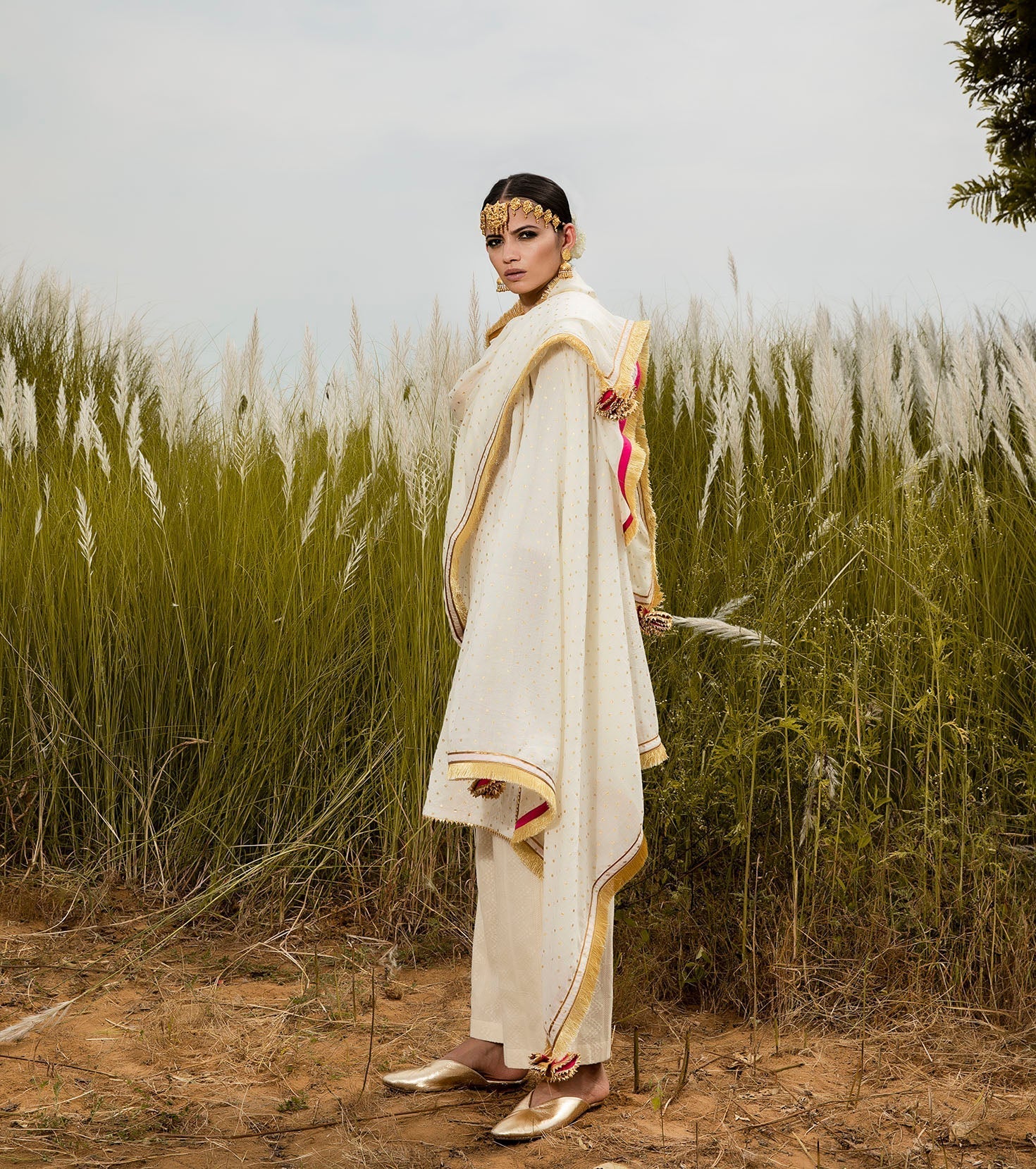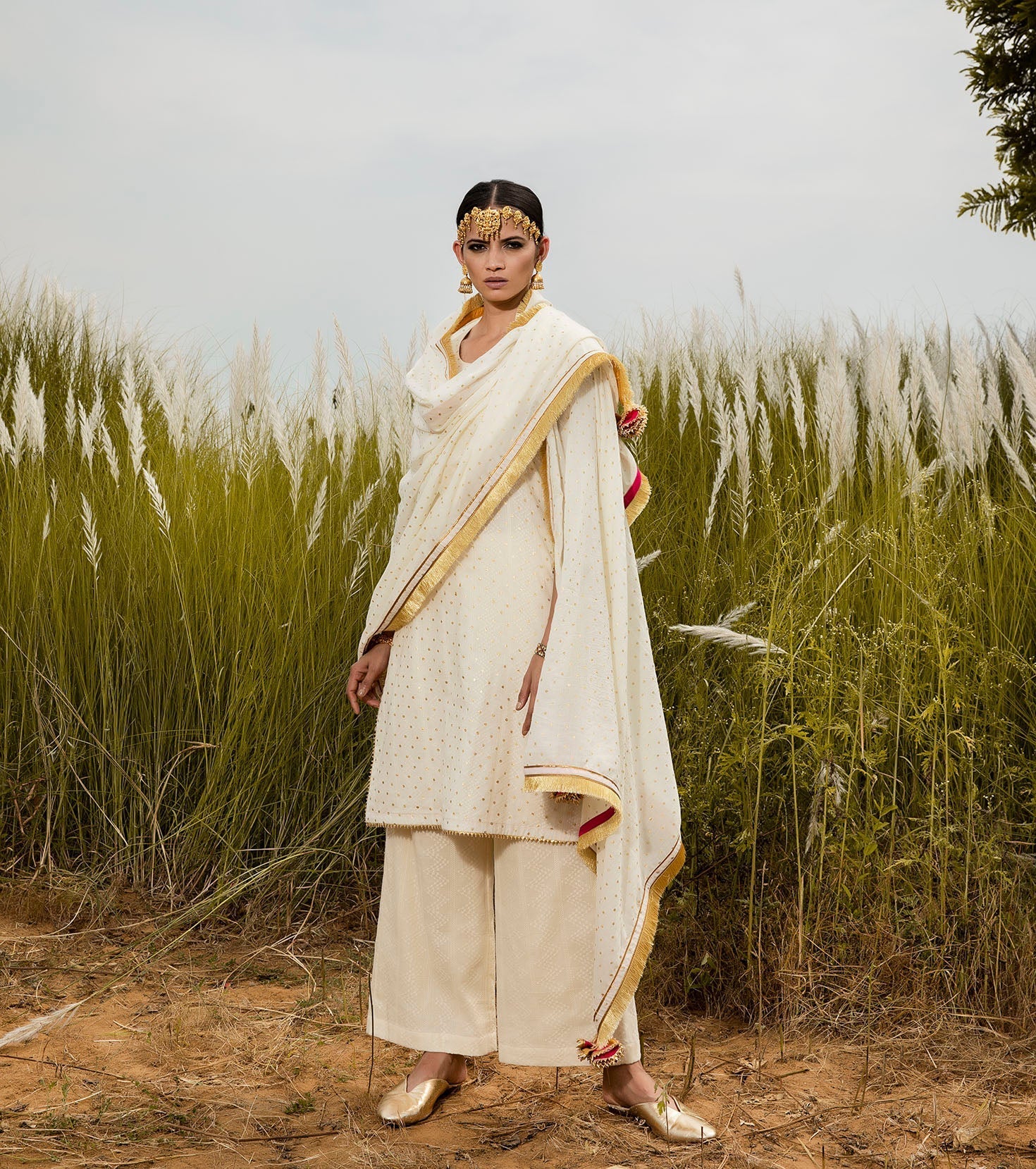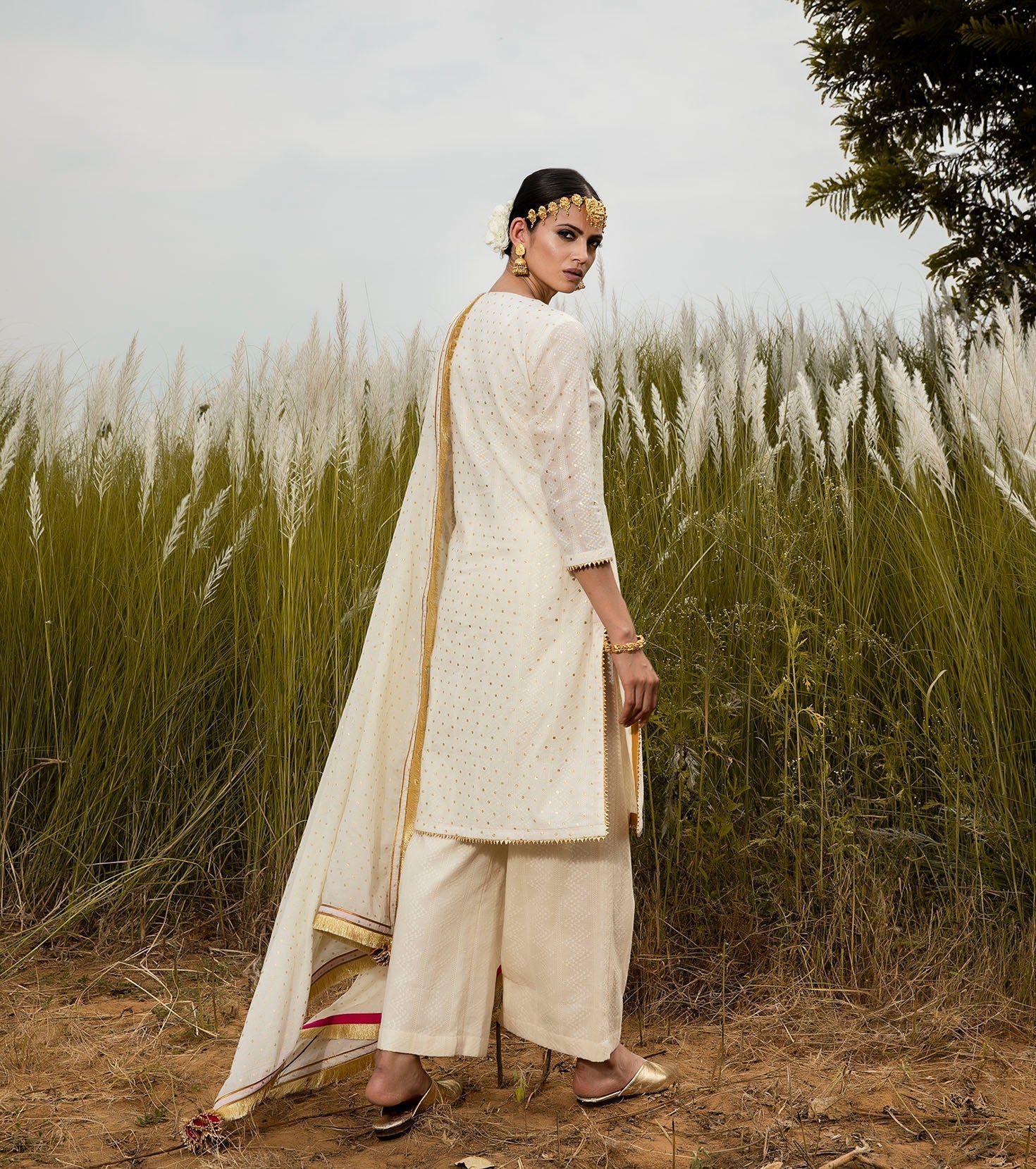 Textured ivory kurta with a splatter of gold foil polka, and straight palazzo pant set. Paired with our 'Chaandni' dupatta in a matching ivory.