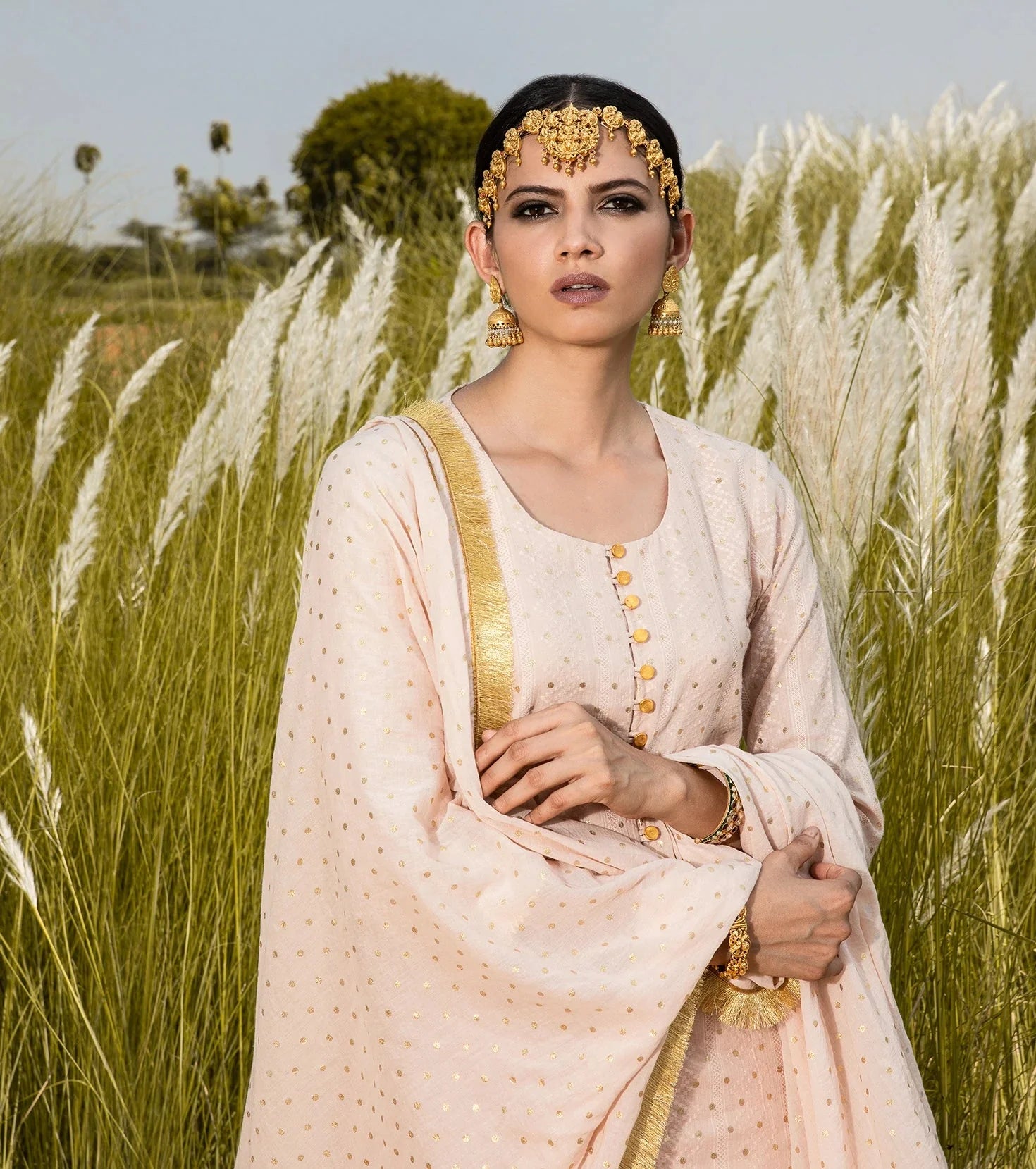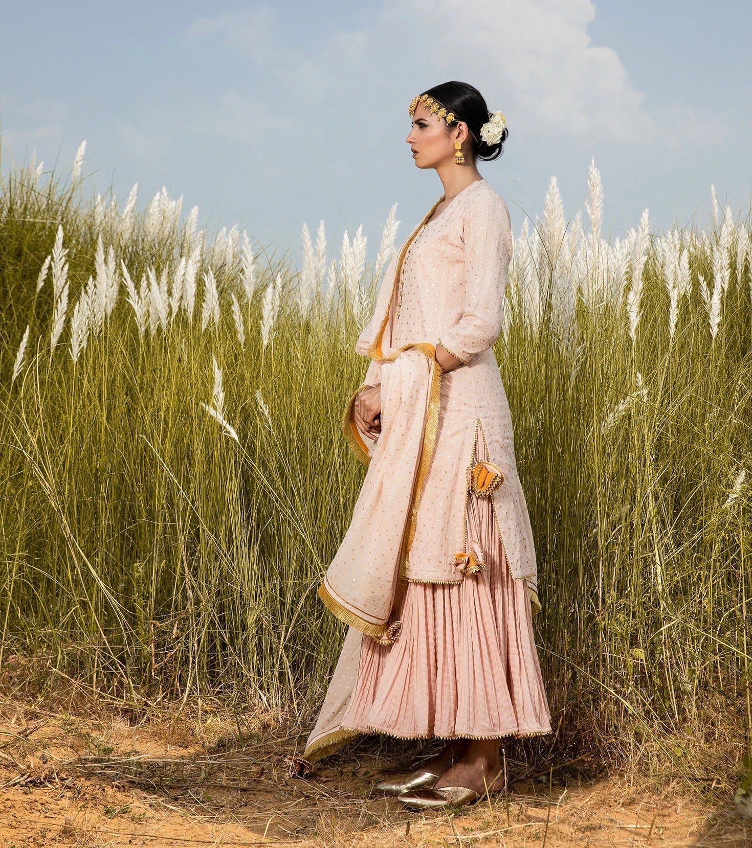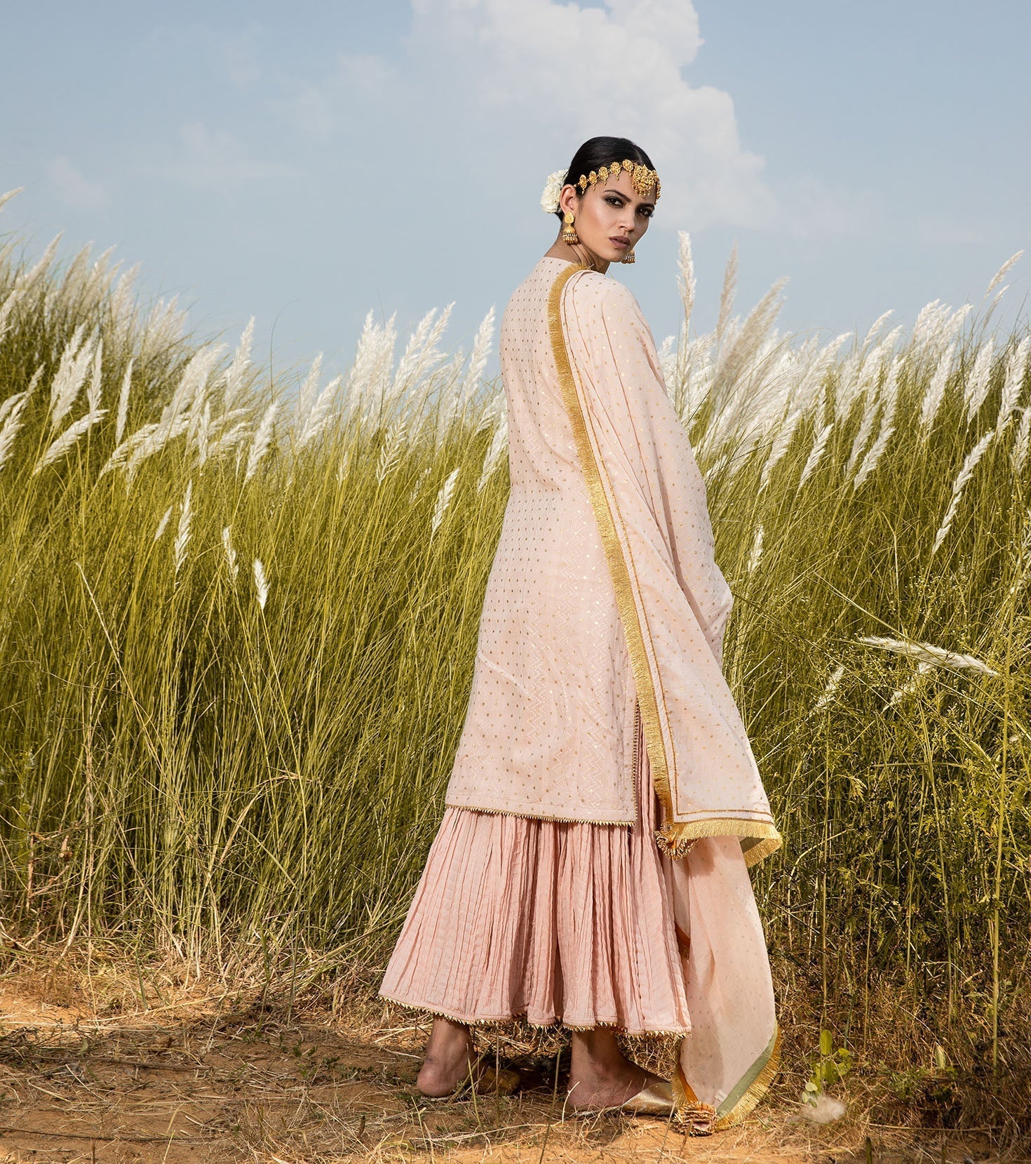 Blush mulmul long kurti with an overall splatter of gold foil polka, and crinkle sharara set. Paired with our blush 'Saachi' dupatta.