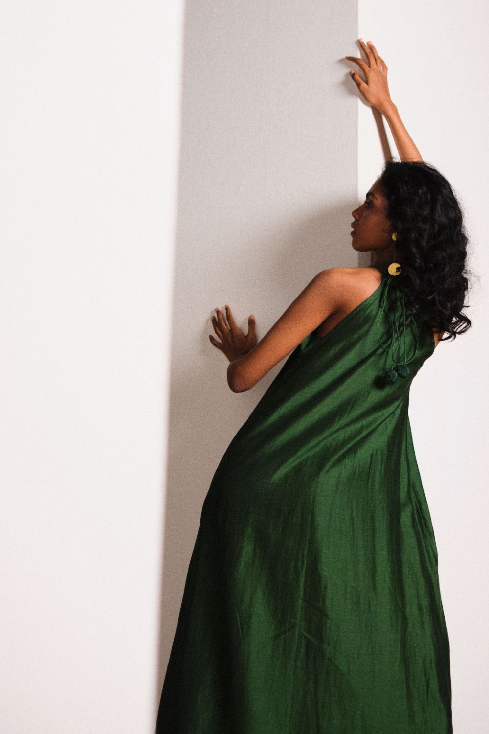A flowy deep green halter neck maxi dress with adjustable string fastening at the back and bijiya gota detailing in the hemline crafted in chanderi fabric.