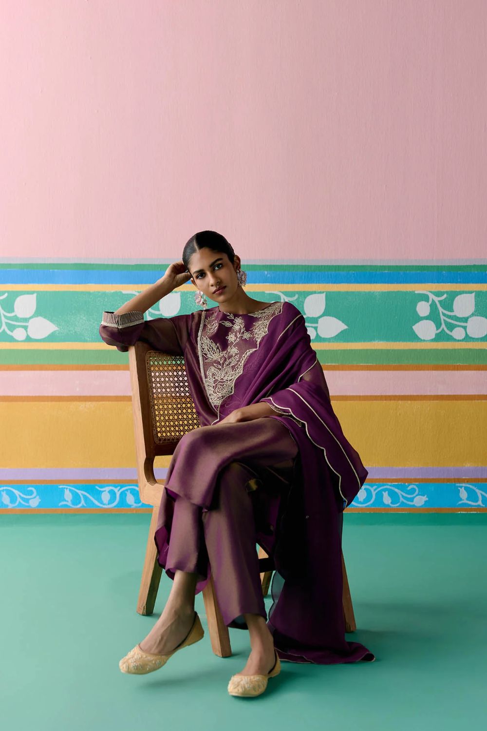 Opulent and refined, the Purple Embroidered Kurta Set is crafted in luminous Tissue for a regal festive appeal. The kurta features an intricately embroidered yoke with metallic handwork and zari, complemented by finely embroidered sleeves for added detail. Paired with pants designed with an elasticated back for effortless comfort, the set is completed with an organza dupatta edged in metallic thread scallops along the hem—bringing together elegance and artistry in perfect harmony.
