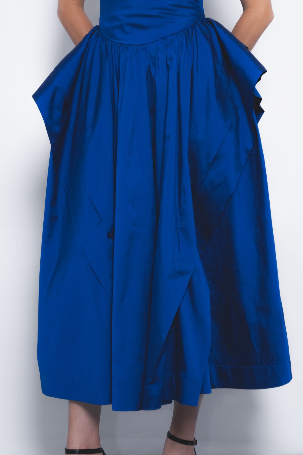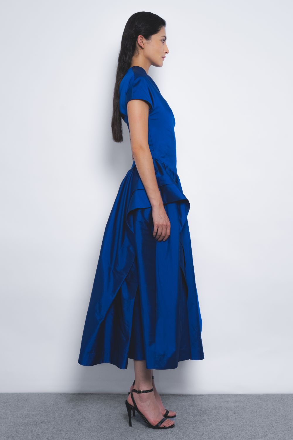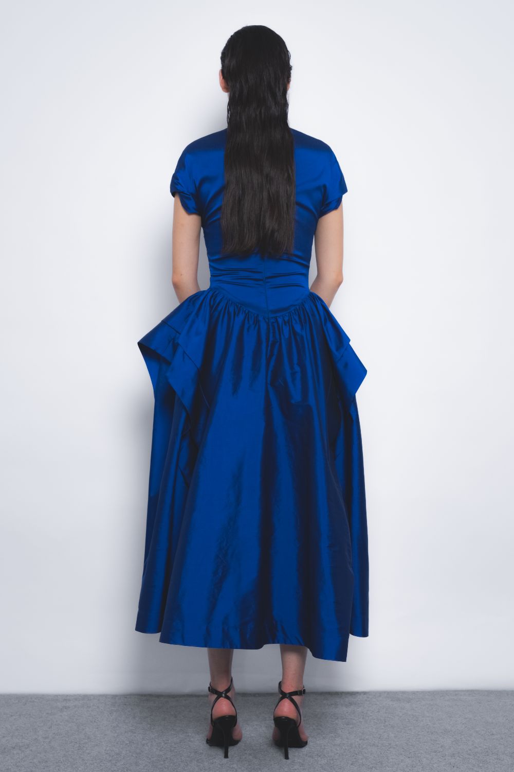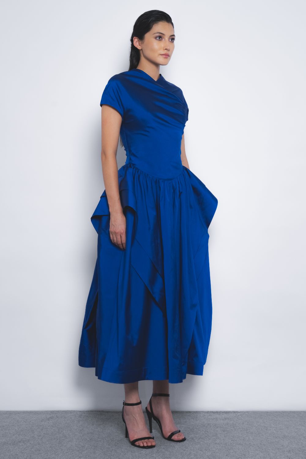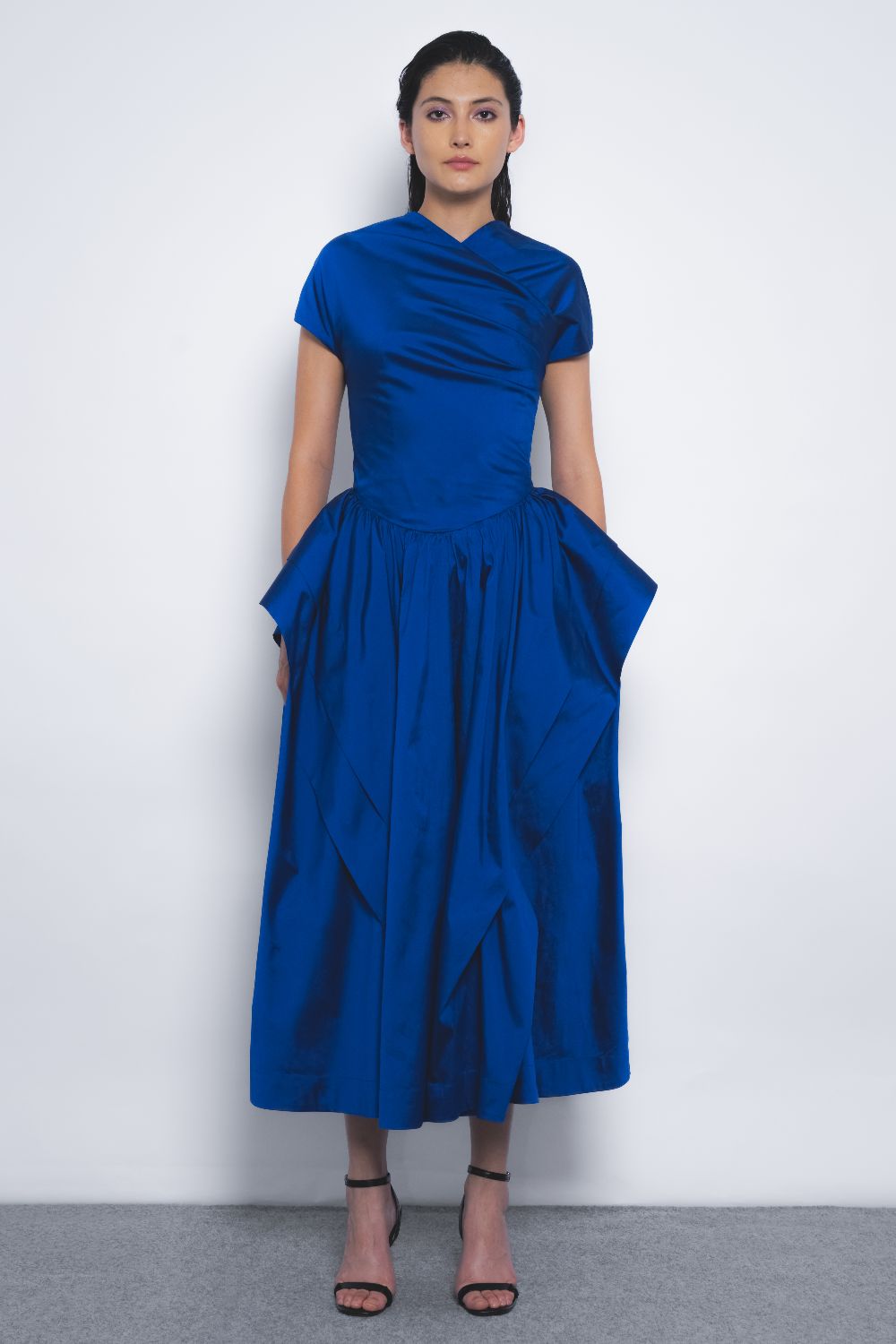 This silhouette explores fabric manipulation to create a draped garment with architectural form—an elegant cocktail dress defined by refined simplicity and elevated through meticulous craftsmanship.