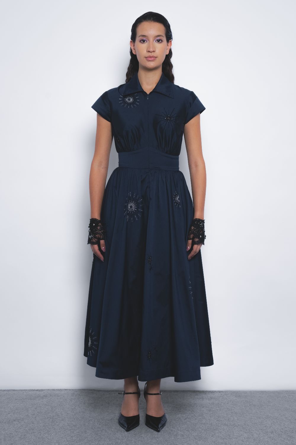 This classic cinched-waist silhouette with a voluminous hemline, crafted in lustrous taffeta, exudes elegant richness. Tonal hand-embroidered firework motifs lend subtle, intricate illumination to the textile.