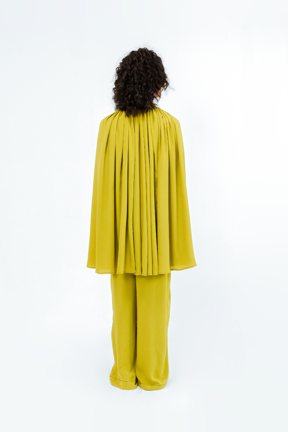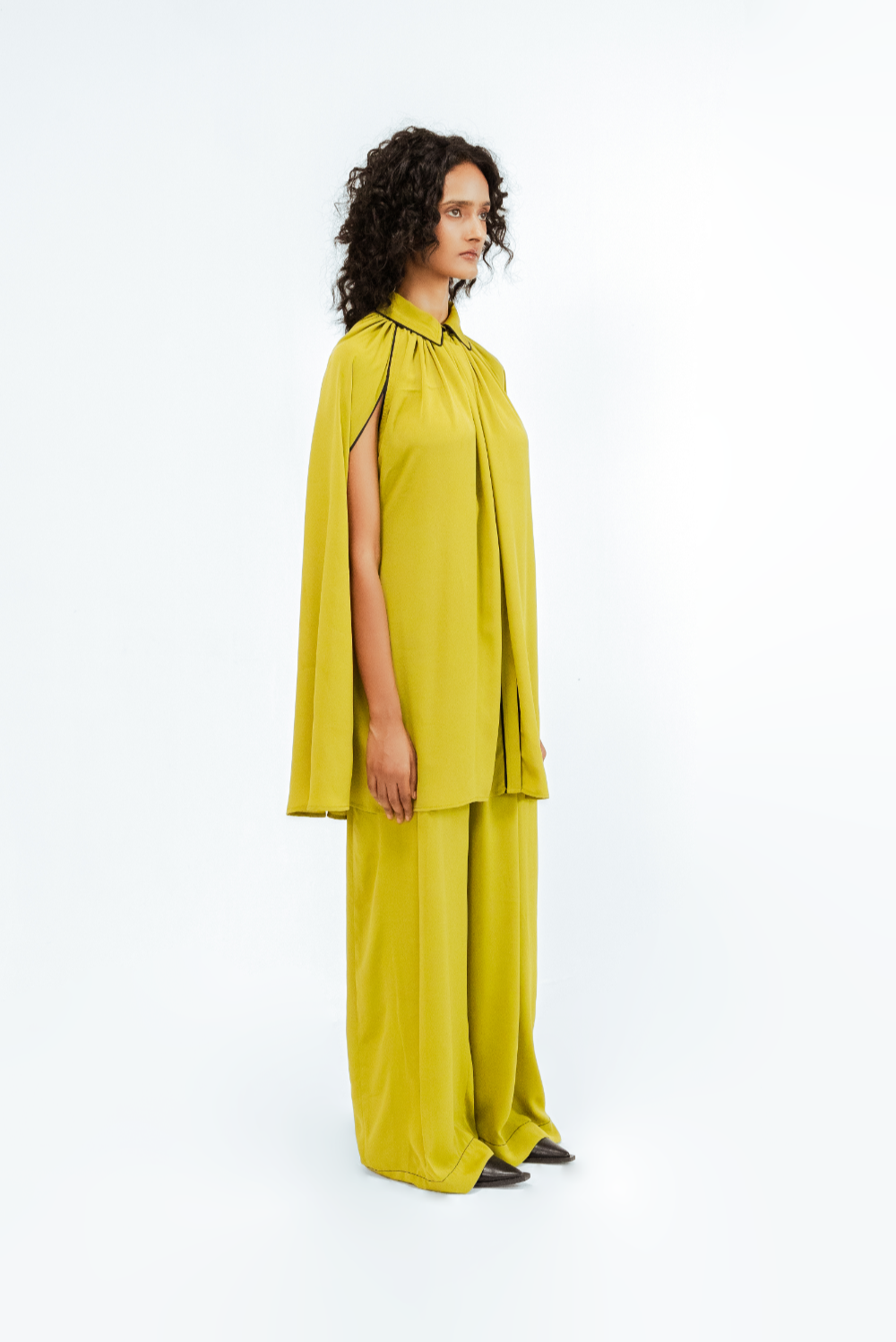 Crafted in crepe, this ensemble features a flowing cape-style shirt with soft gathers at the neckline and a structured shirt collar with subtle contrast piping. The sleeveless cape overlay creates a dramatic, sculptural silhouette that moves with ease. Model Height is 5'9". Model wears size S. Garment length is (Top 33")
