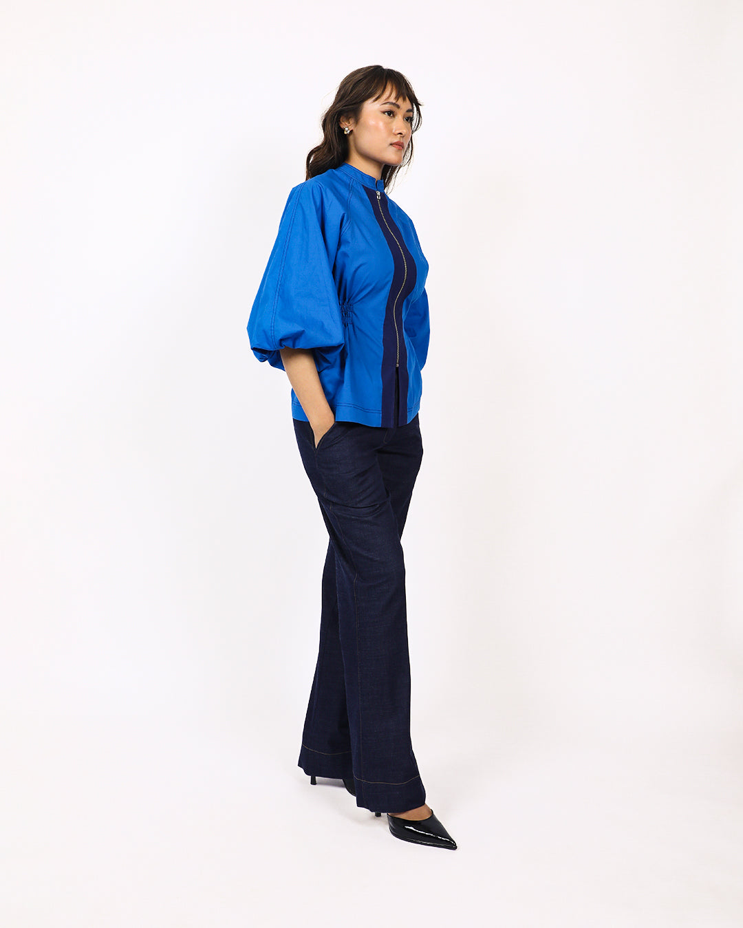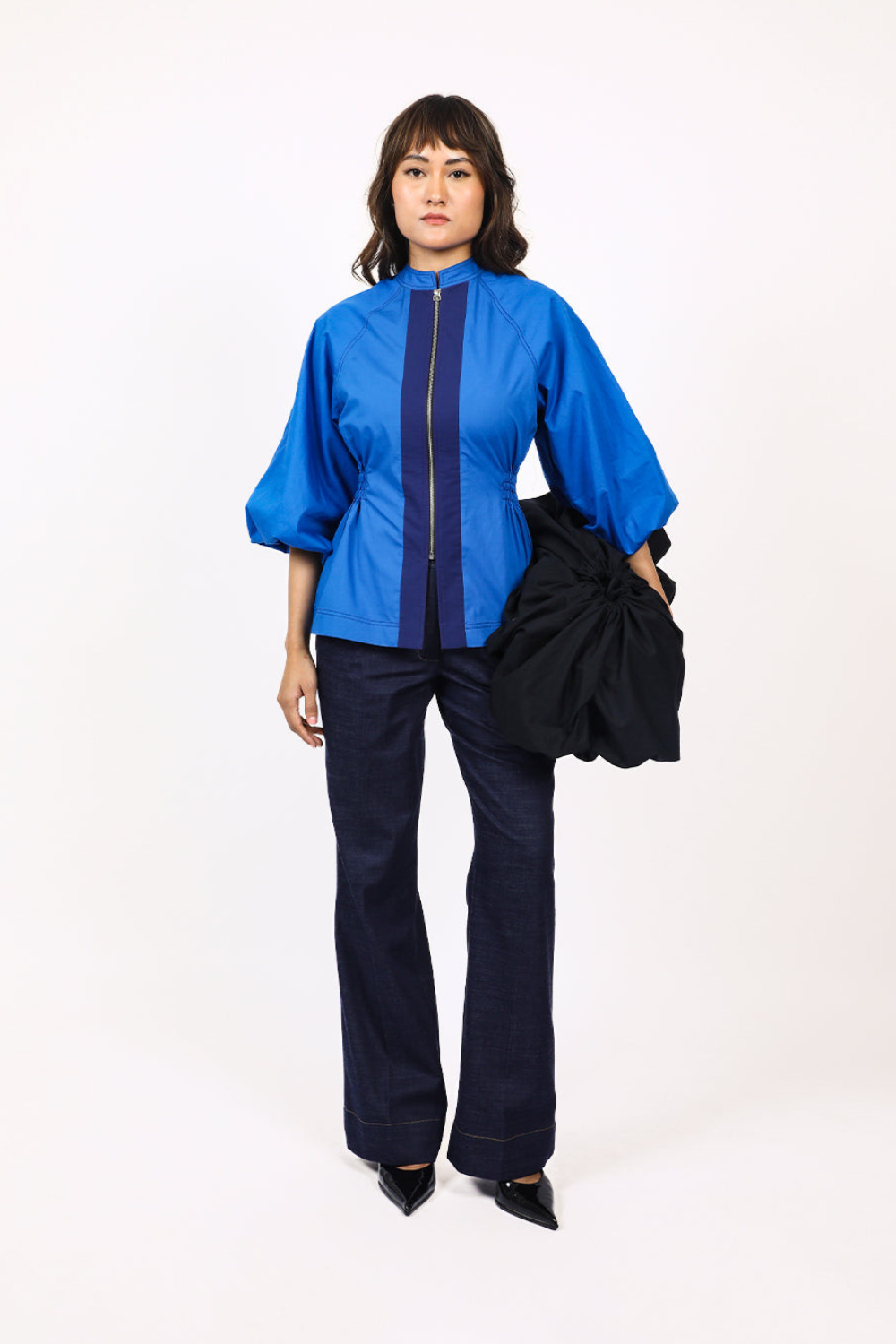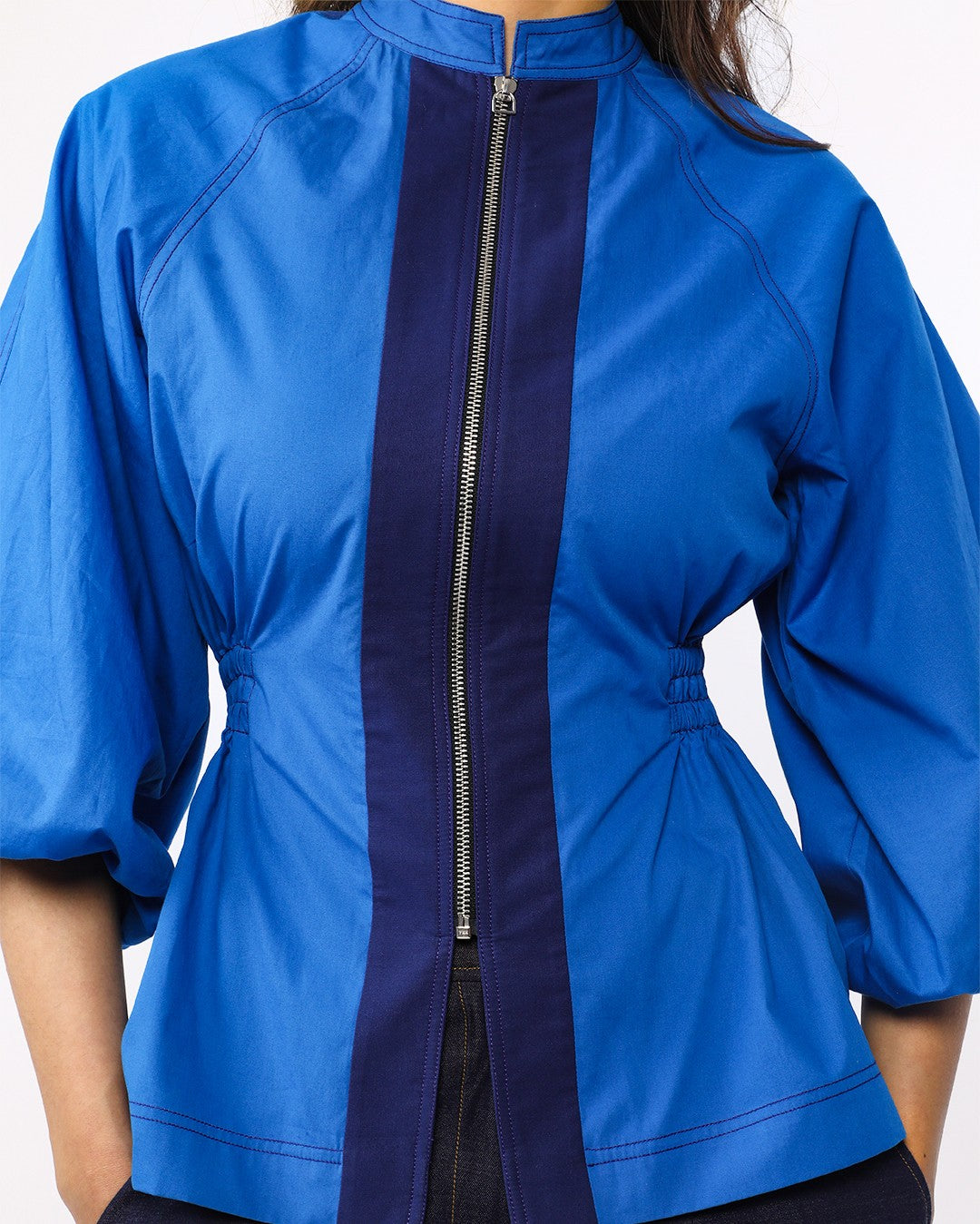 This top features raglan puff sleeves with contrast stitching, adding a touch of volume and style. A contrast panel runs down the front with full frontal zip opening for adjustable styling , while side elastics provide both a flattering fit and added comfrot, making it a stylish yet practical choice. Model wear size S model height is 5'8 garment length is 26"
