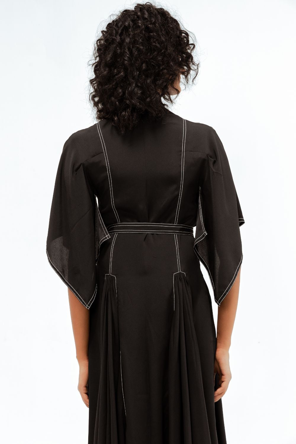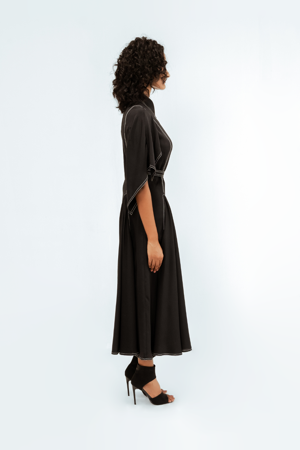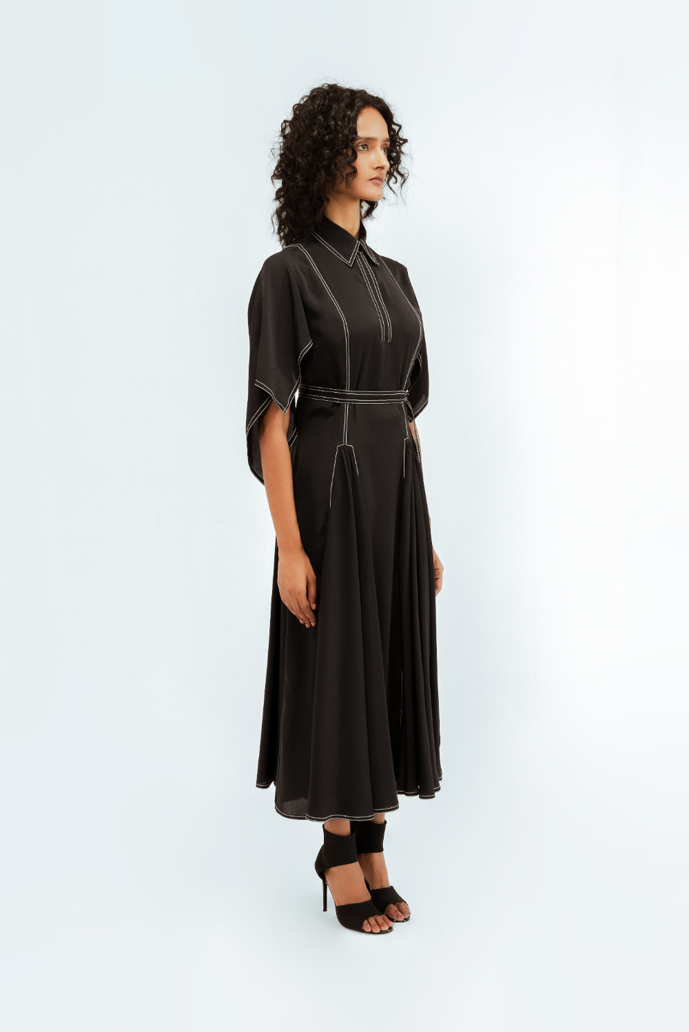 Crafted in fluid crepe, this midi dress features circular-cut panels at the skirt that sculpt soft volume and movement. The handkerchief hem sleeves add a dynamic edge, while contrast stitch details trace clean, graphic lines across the silhouette. Model Height is 5'9". Model wears size S. Garment length is 50"