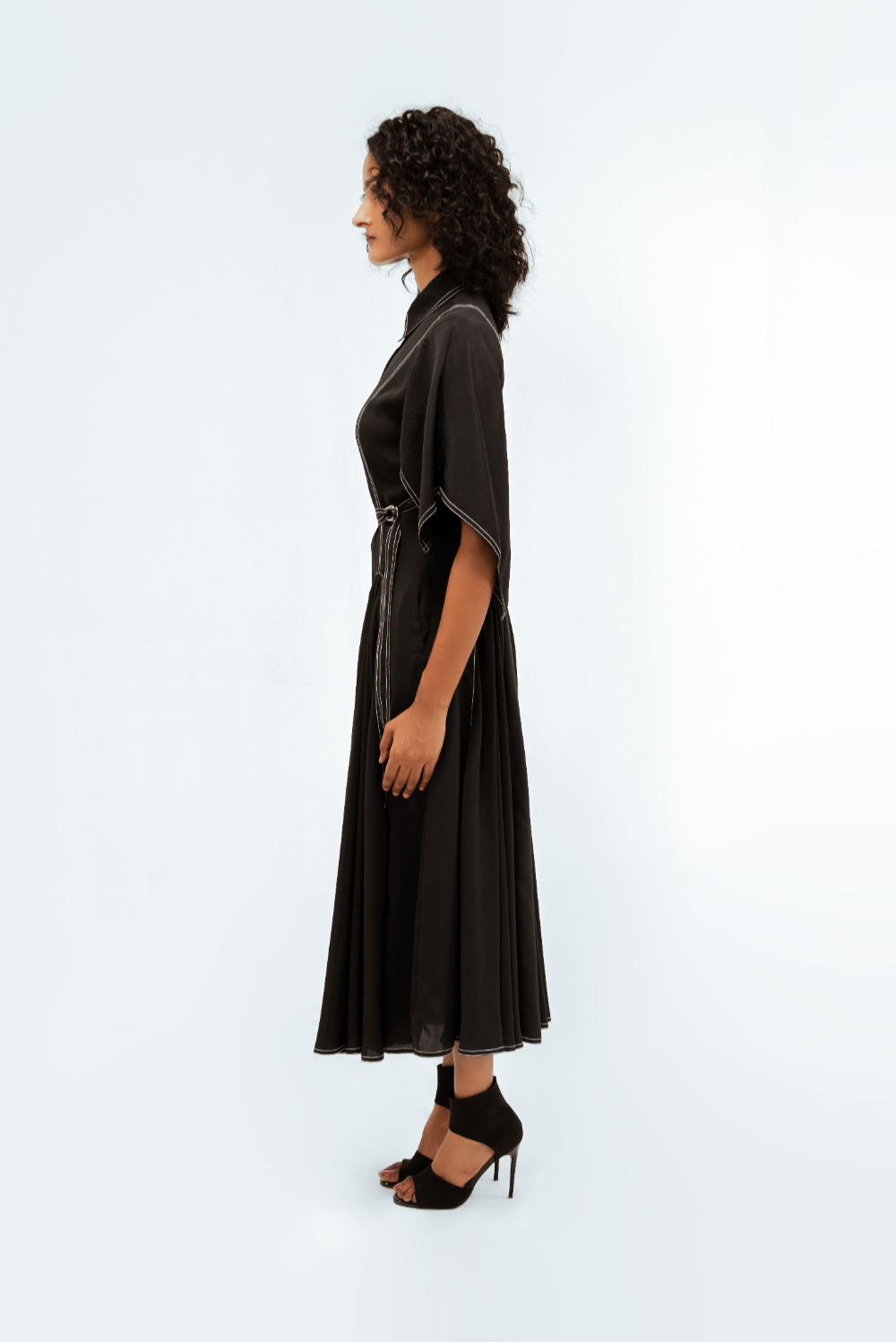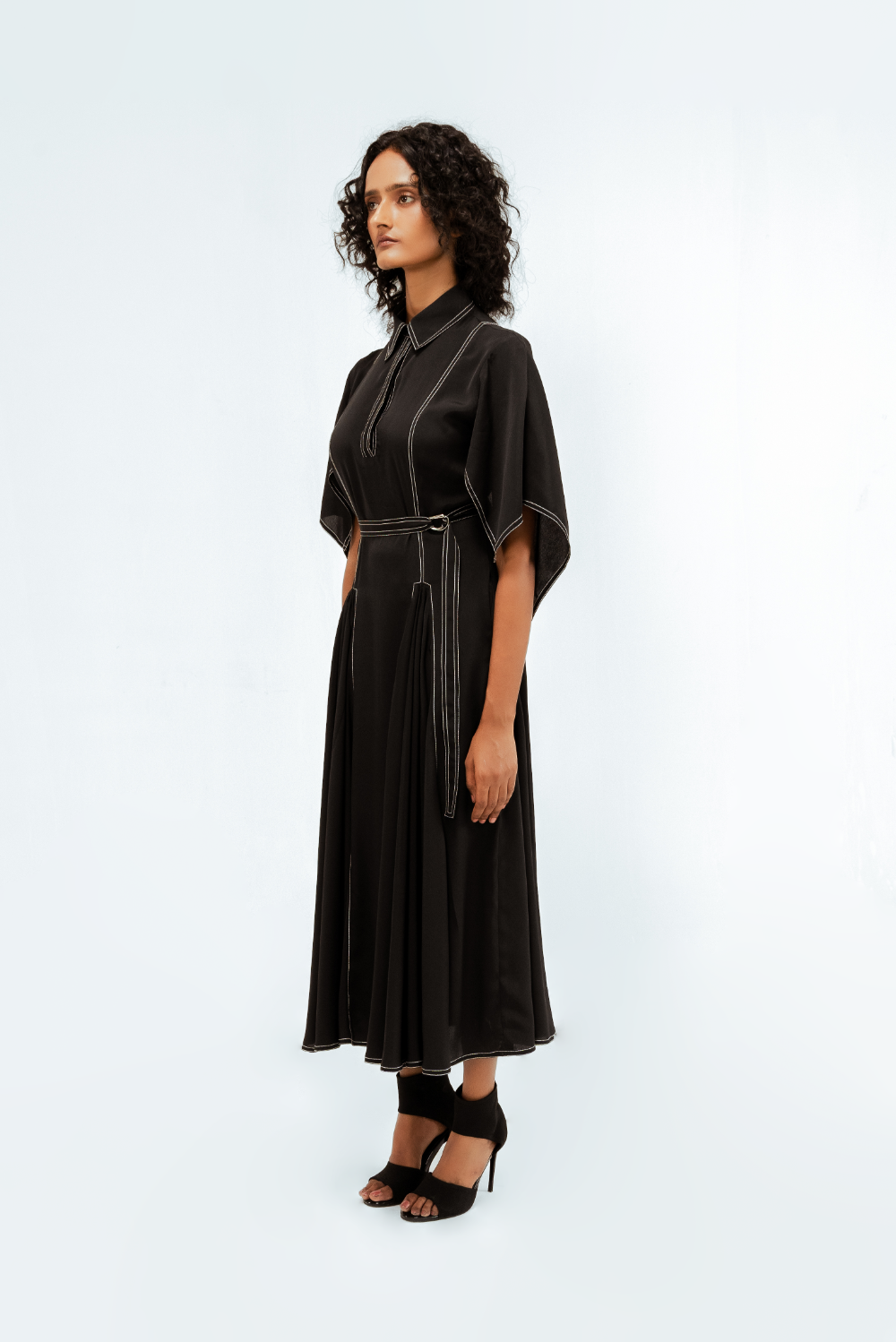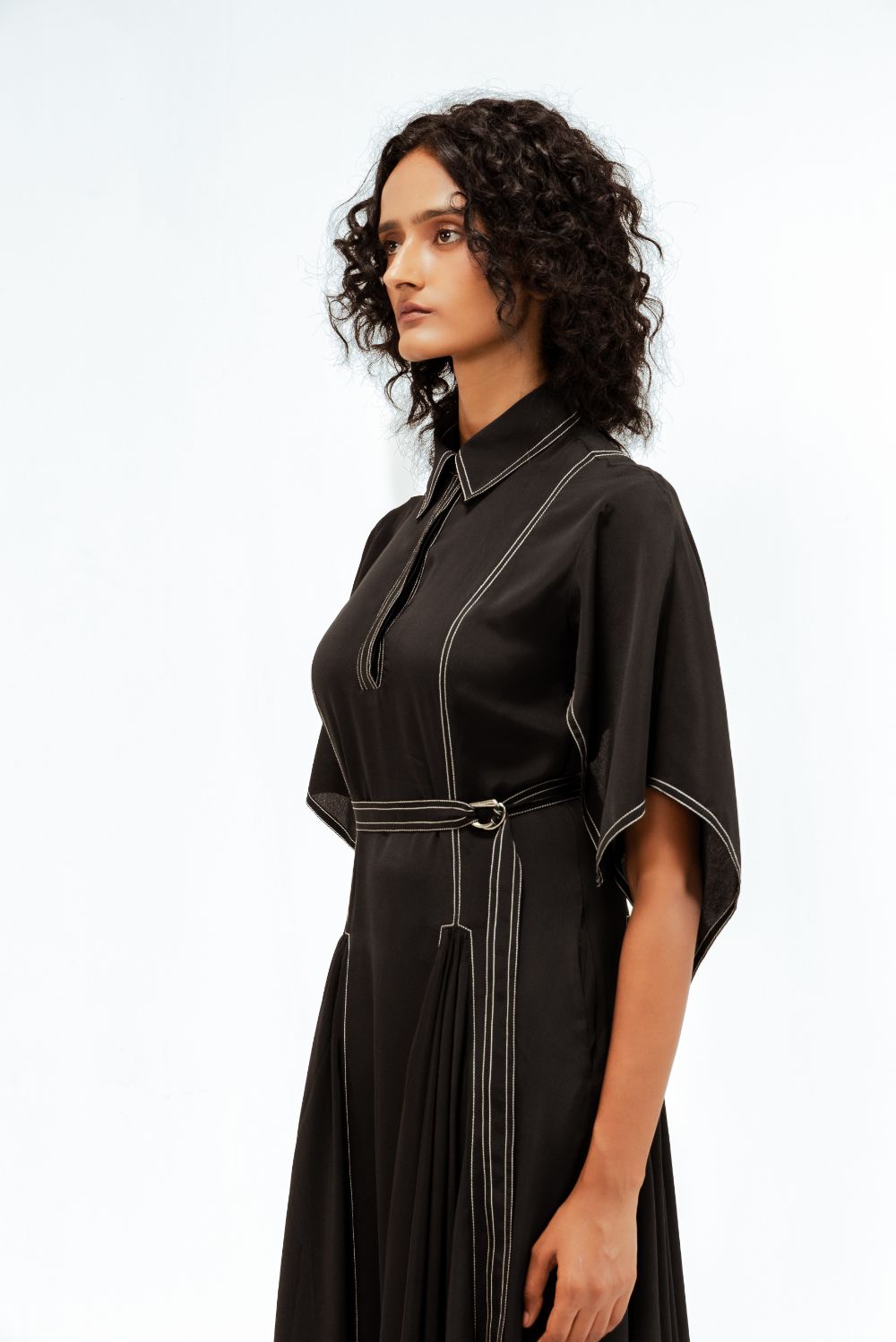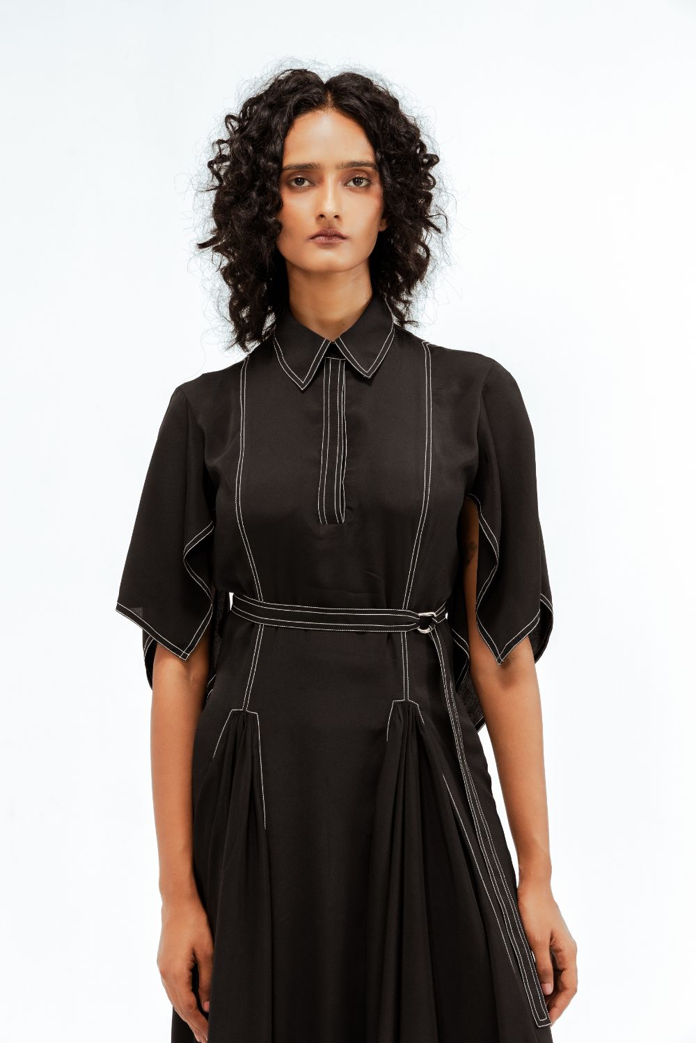 Crafted in fluid crepe, this midi dress features circular-cut panels at the skirt that sculpt soft volume and movement. The handkerchief hem sleeves add a dynamic edge, while contrast stitch details trace clean, graphic lines across the silhouette. Model Height is 5'9". Model wears size S. Garment length is 50"