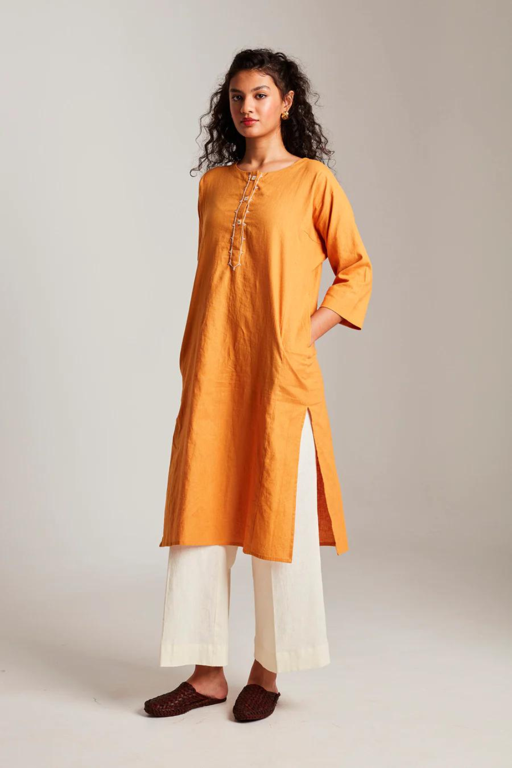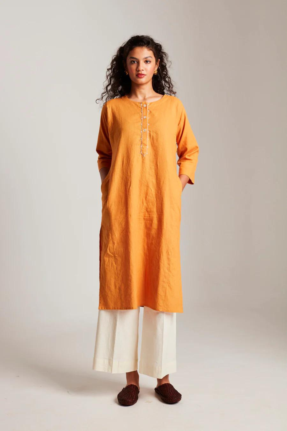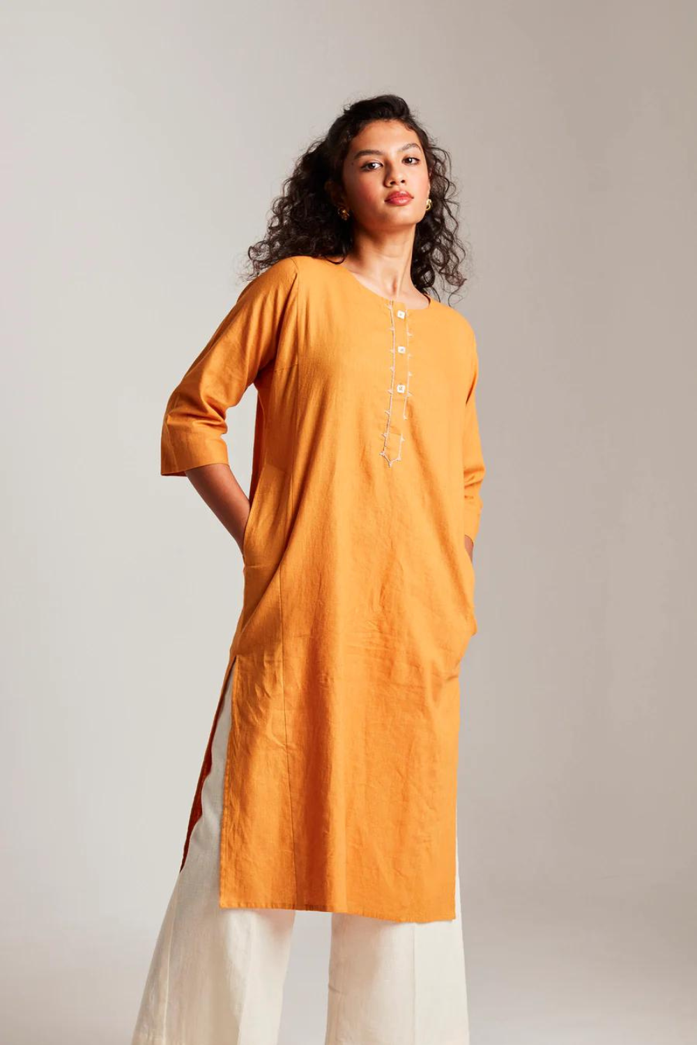 This set of two contains one Beaded Placket Kurta and one Vanilla Palazzo Pants. This cotton linen Kurta with minimal hand embroidered glass bead details on the placket is a festive must-have. Pair it with our Vanilla Palazzos and our elegant scalloped Chanderi Dupatta to complete the look.