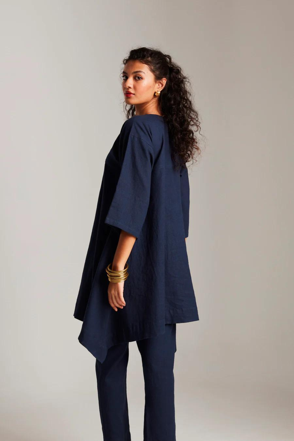 Playing with the geometry of fabric, the high-low kurta is a unique design with front yoke and side pleats. Complete with pockets, you’ll love pairing this statement piece with the slim pants for a sleek appearance.