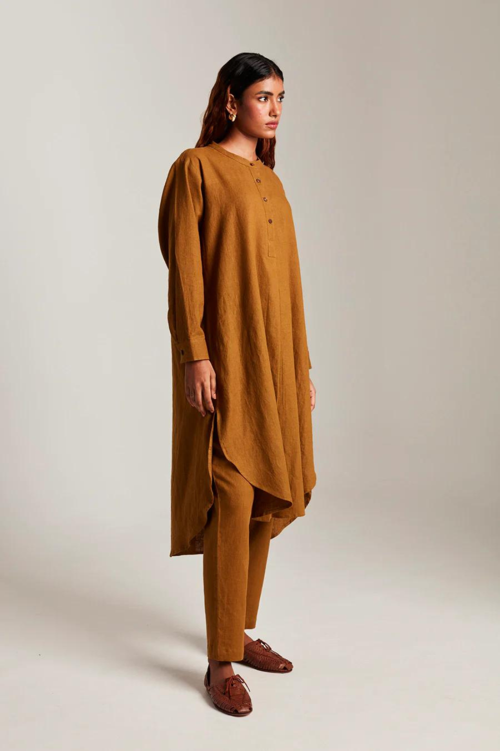 An airy kurta reminiscent of old world charm, the band collar and rounded hem with wooden buttons make it a great choice for work and play alike.