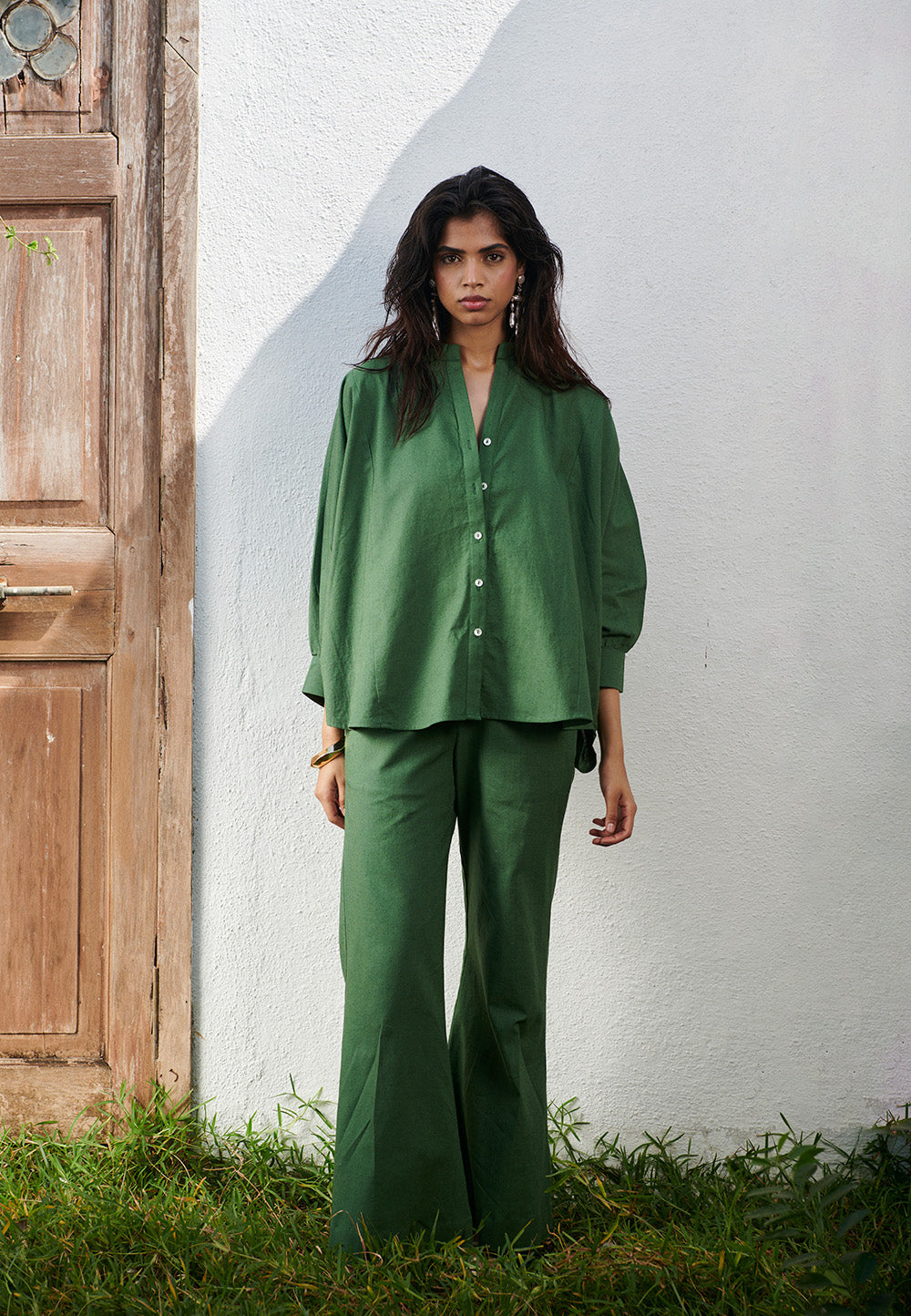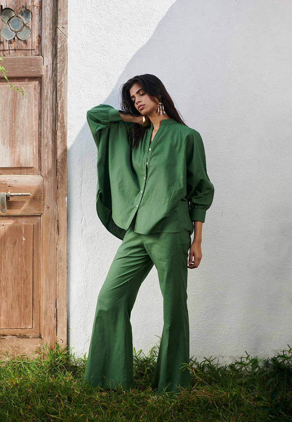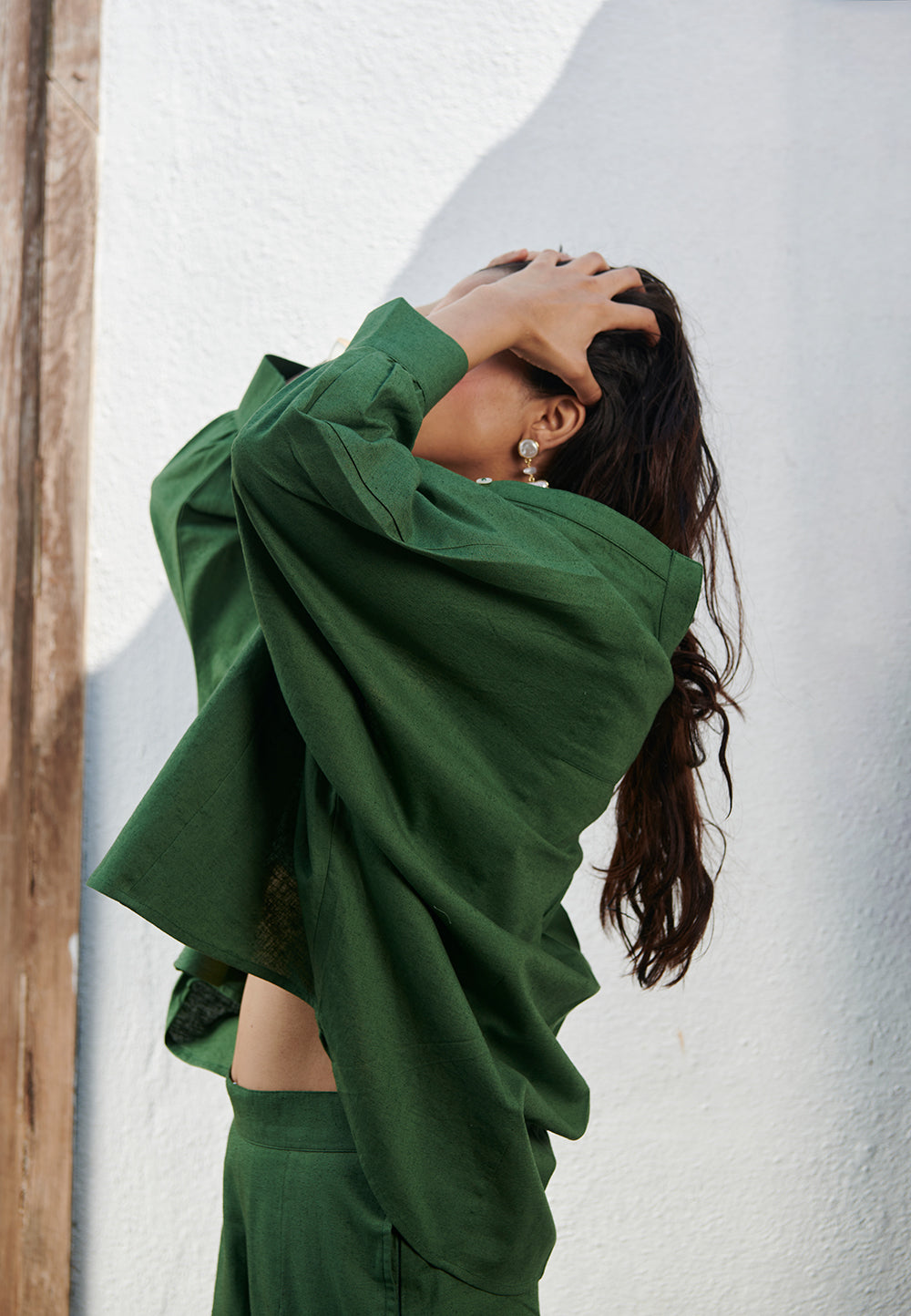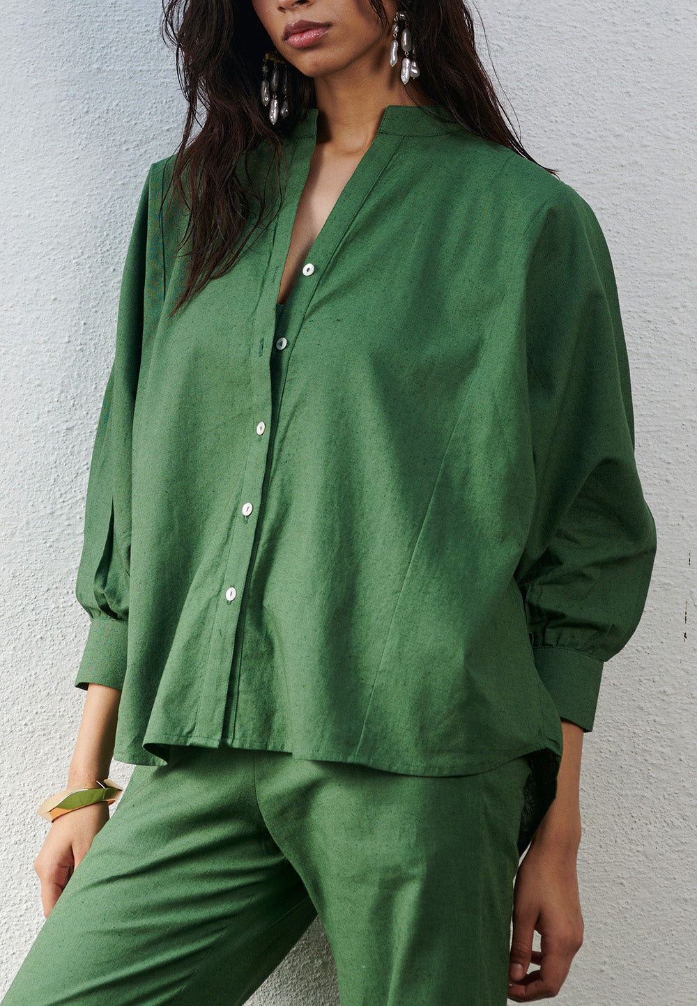 An oversized dolman shirt with a relaxed silhouette and dropped shoulders for effortless movement. Featuring a button-down front and cuffed sleeves, it blends ease with structure.
