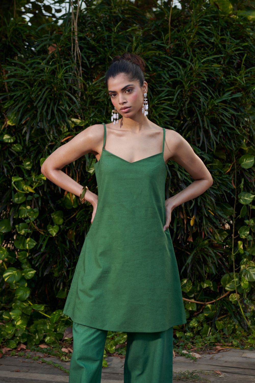 A minimal slip kurta with delicate spaghetti straps and an angular neckline for a refined silhouette. Designed with a relaxed A-line fit, it flows effortlessly for all-day ease.