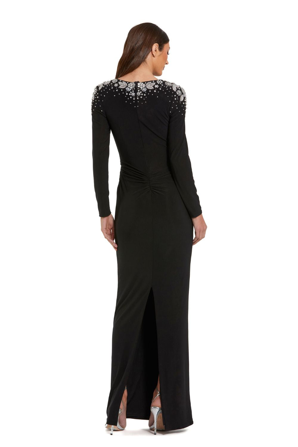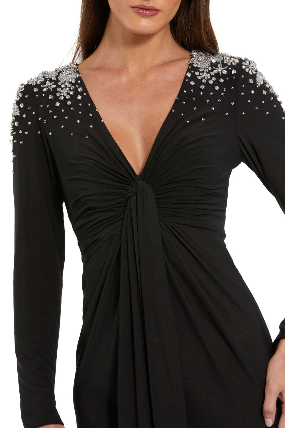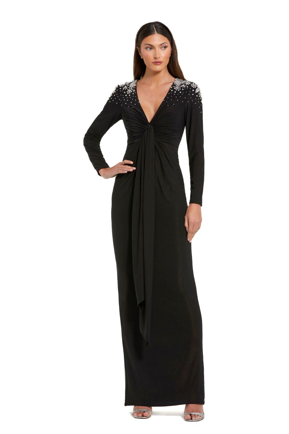 44063-Jersey V Neck Faux Knot Gown With Beaded Shoulders
