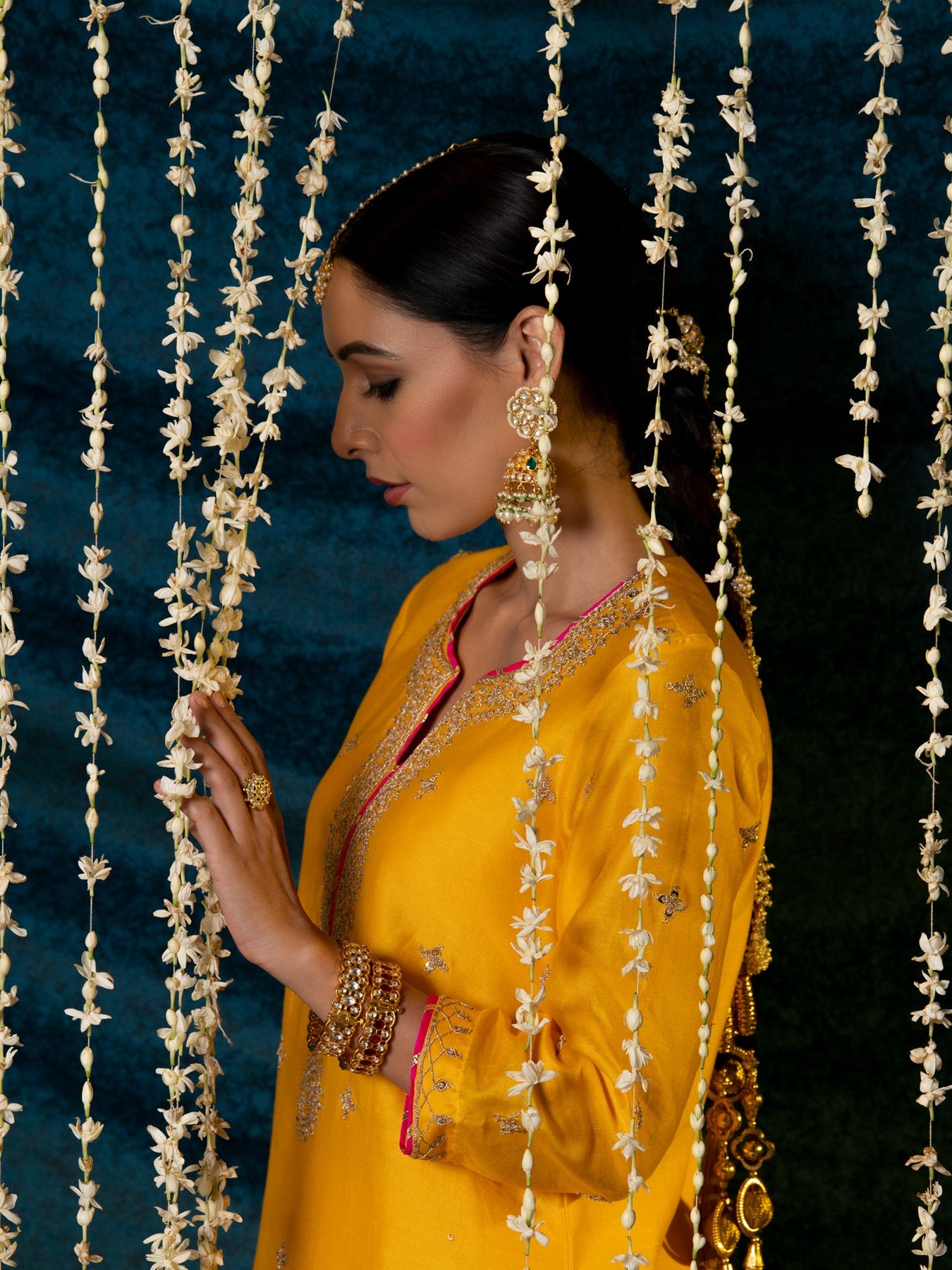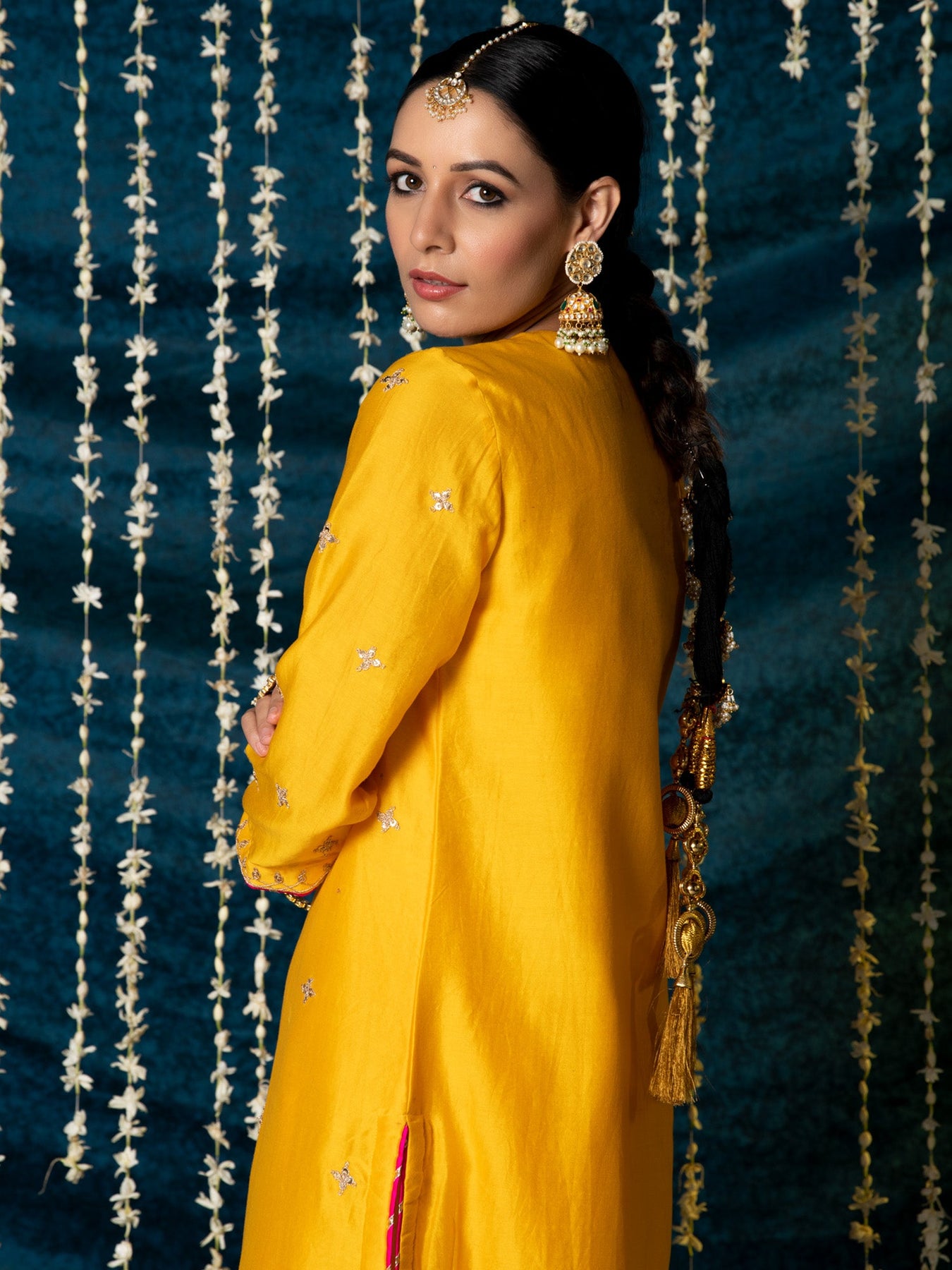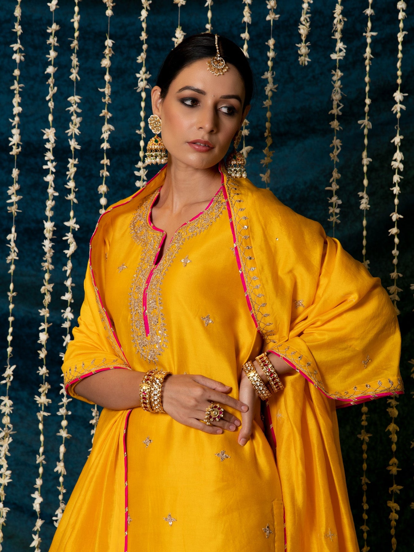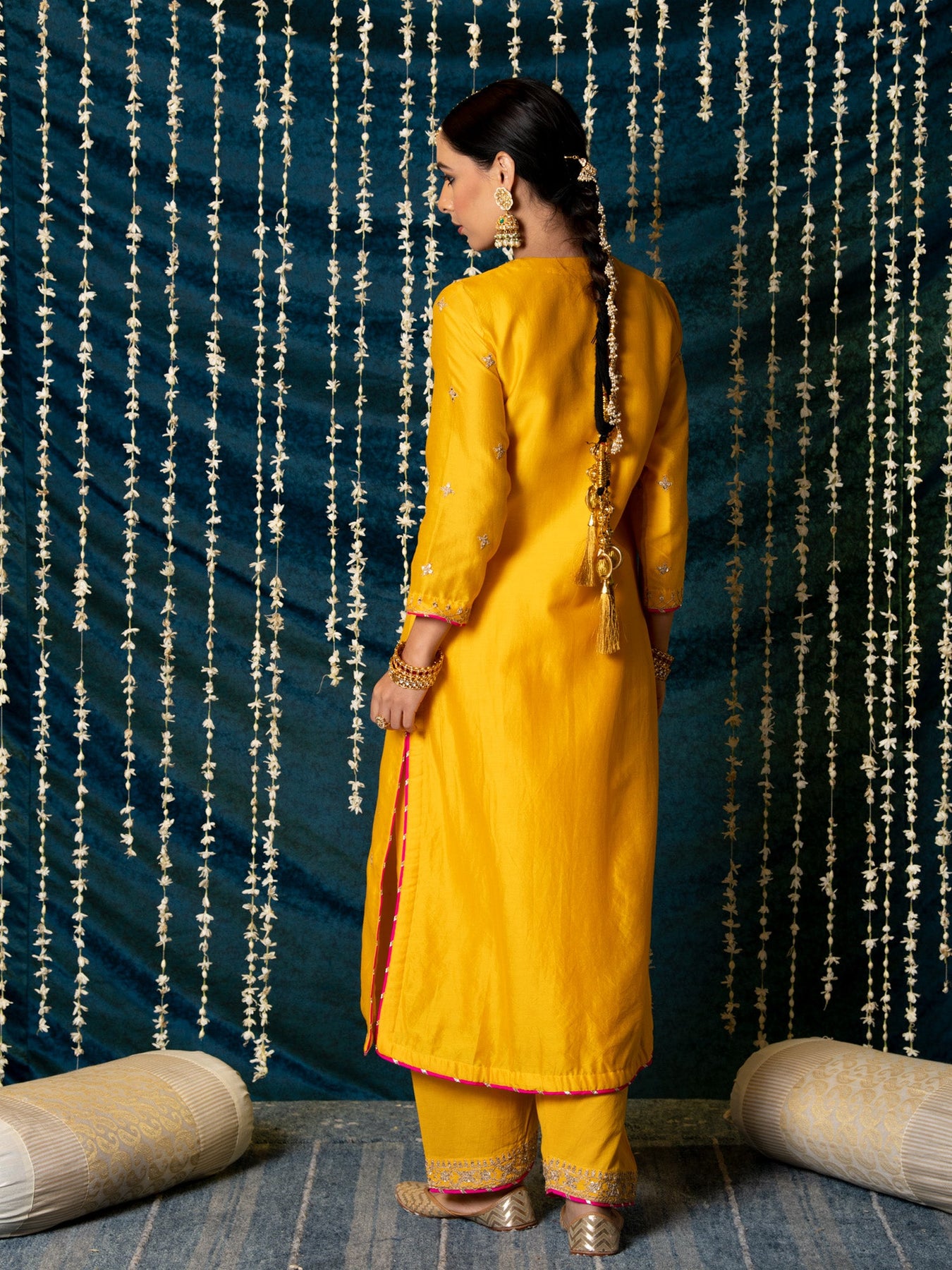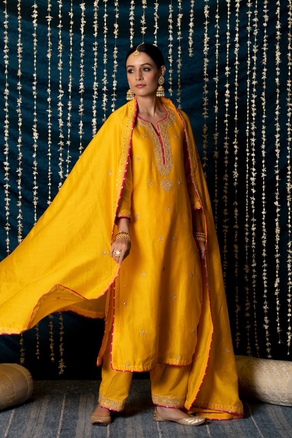 KURTA: This sunny yellow chanderi silk kurta is enhaced with gold marodi work on the neck and sleeves and beautifully detailed with delicate gold buttas all over. The kurta has been finished with hand made magzi in a contrast pink color. SALWAR: The kurta is paired with a yellow salwar made in cotton with delicate work at the hem.